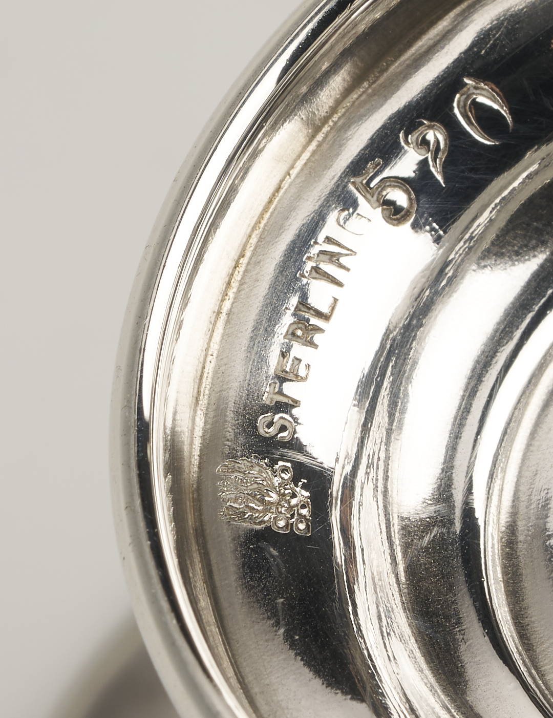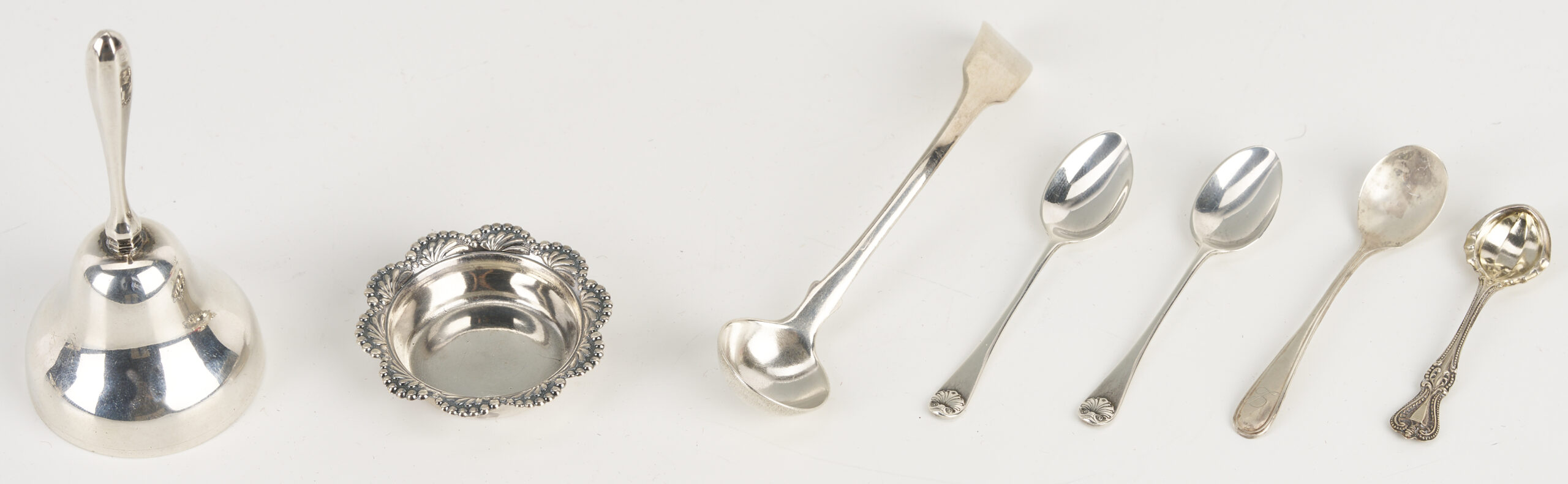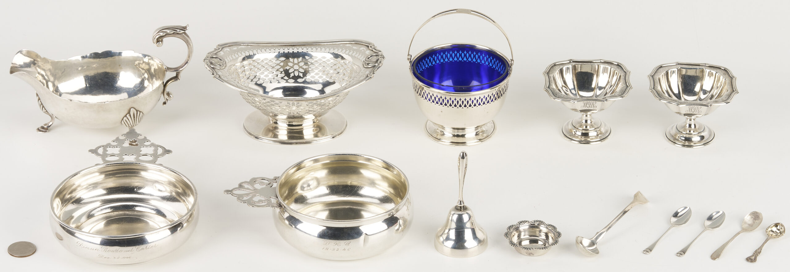 Fourteen (14) assembled sterling silver table items including: 1 gravy boat with scalloped rim and hoof feet marked “Sterling Handmade”, 1 Gorham reticulated footed dish, 2 Meriden footed salt cellars with engraved rims, 1 Lunt porringer, 1 Lenox porringer, 1 CHF sterling salt basket with cobalt glass liner, 1 Frank M. Whting sterling bell, 1 Whiting individual salt dish, 1 English cream ladle marked for Thomas Wallis & Jonathan Hayne date letter for 1810, and 4 assorted salt spoons. Ranging in size 2 1/4 in. L x 1 1/2 in. H x 7 in. dia. 28.04 total troy ounces.