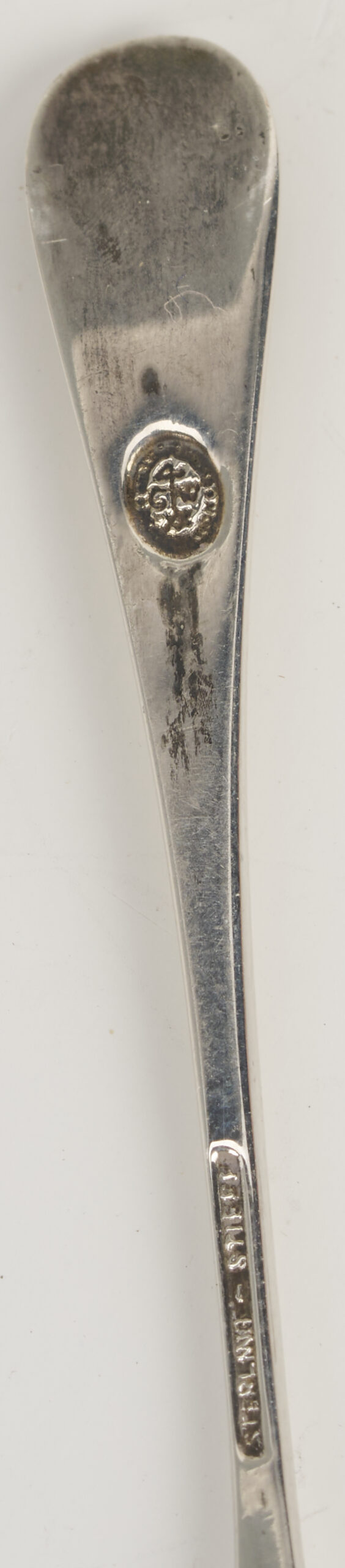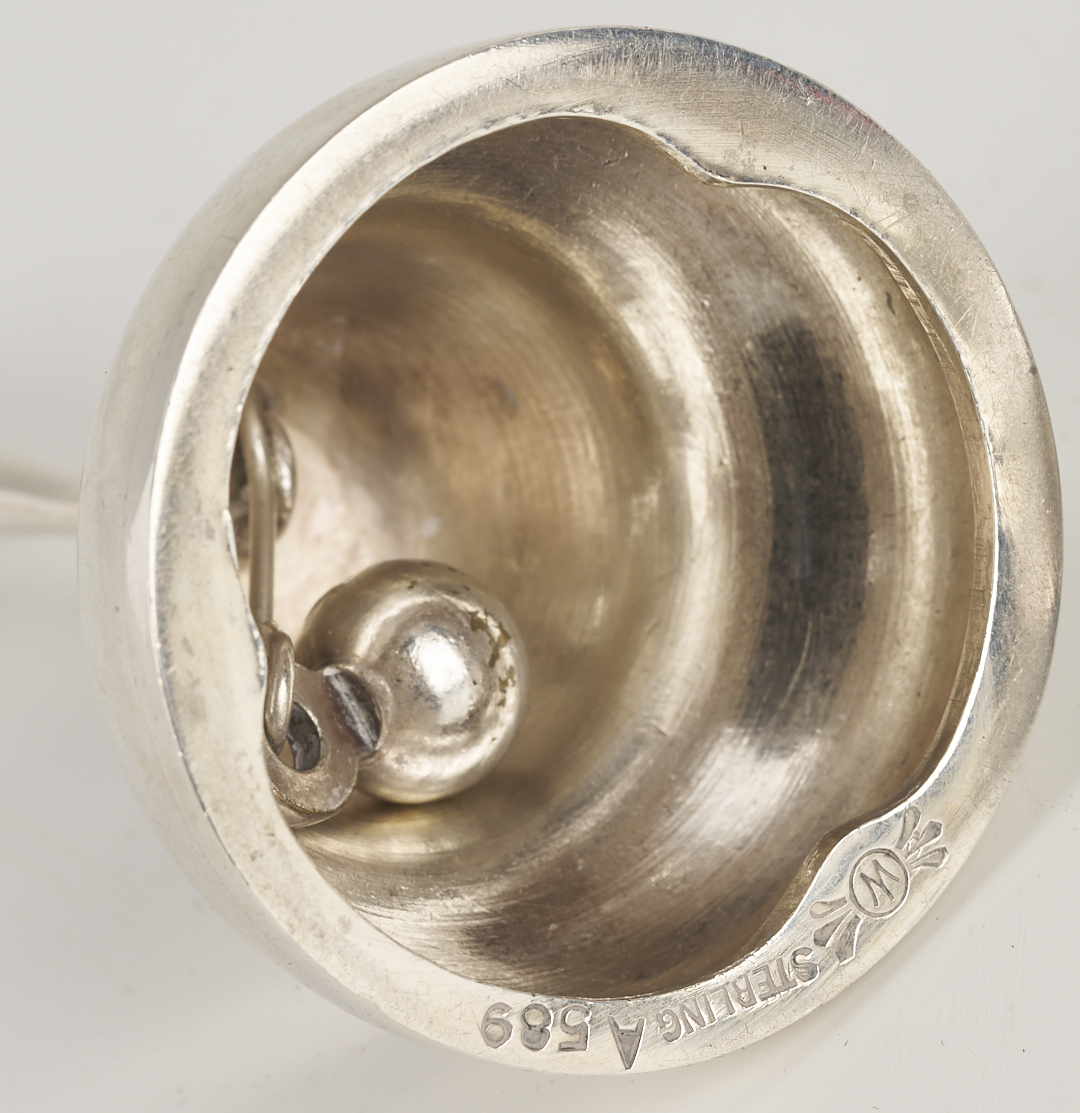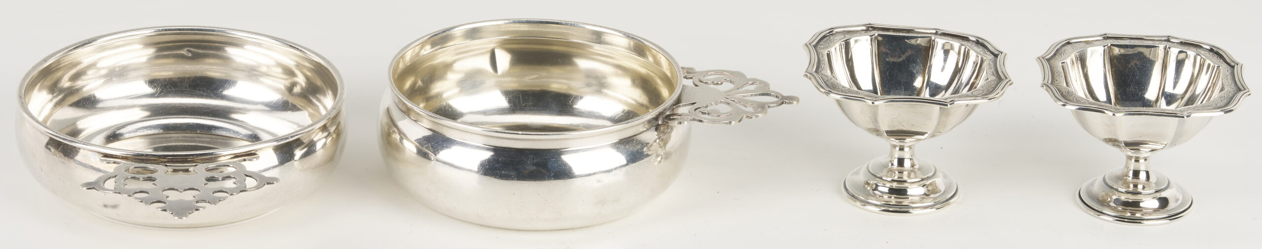 Fourteen (14) assembled sterling silver table items including: 1 gravy boat with scalloped rim and hoof feet marked “Sterling Handmade”, 1 Gorham reticulated footed dish, 2 Meriden footed salt cellars with engraved rims, 1 Lunt porringer, 1 Lenox porringer, 1 CHF sterling salt basket with cobalt glass liner, 1 Frank M. Whting sterling bell, 1 Whiting individual salt dish, 1 English cream ladle marked for Thomas Wallis & Jonathan Hayne date letter for 1810, and 4 assorted salt spoons. Ranging in size 2 1/4 in. L x 1 1/2 in. H x 7 in. dia. 28.04 total troy ounces.