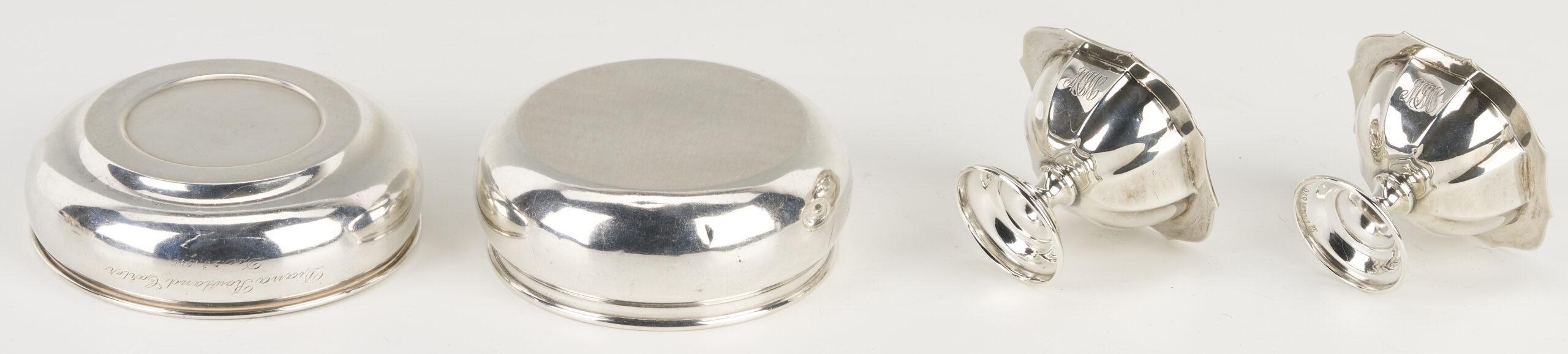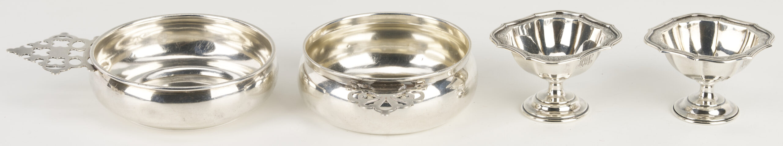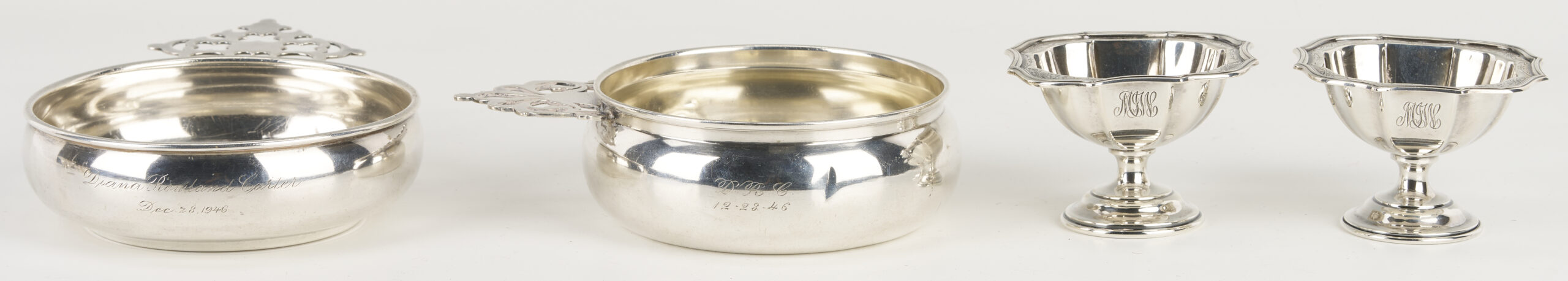 CONDITION: Porringers with denting to the side, reticulated basket with monogram. Remaining items in overall good condition.
