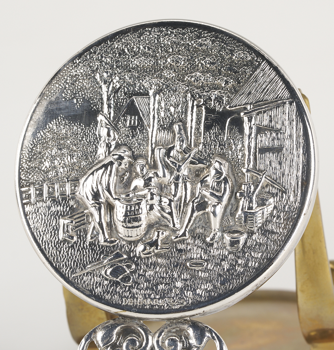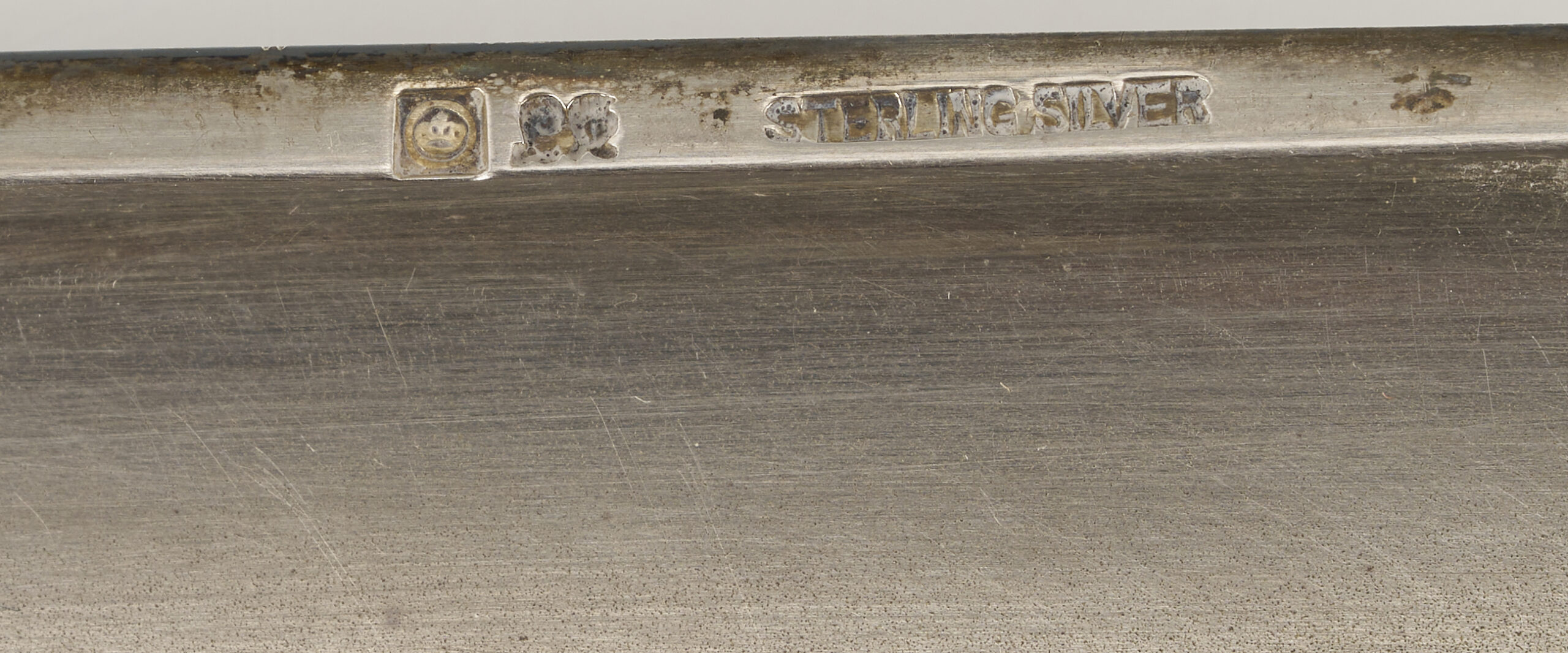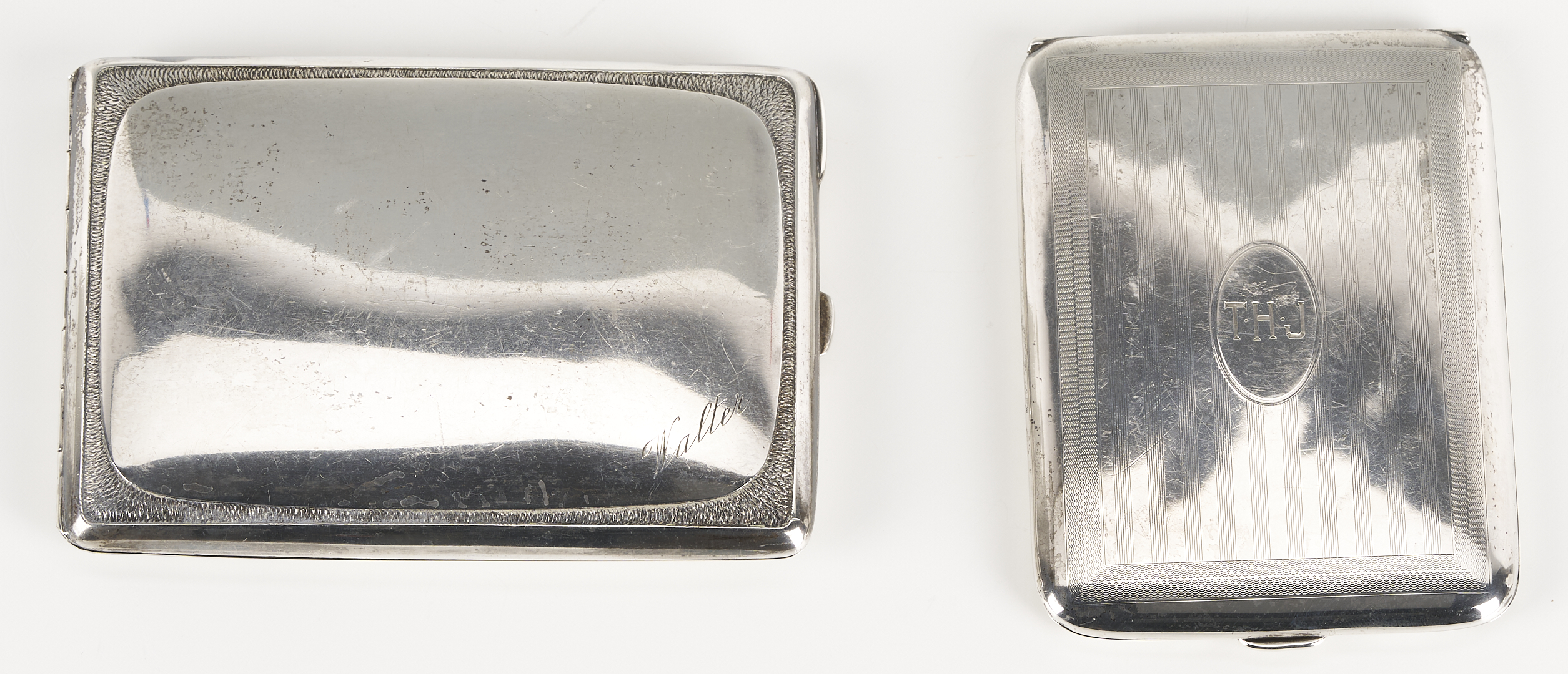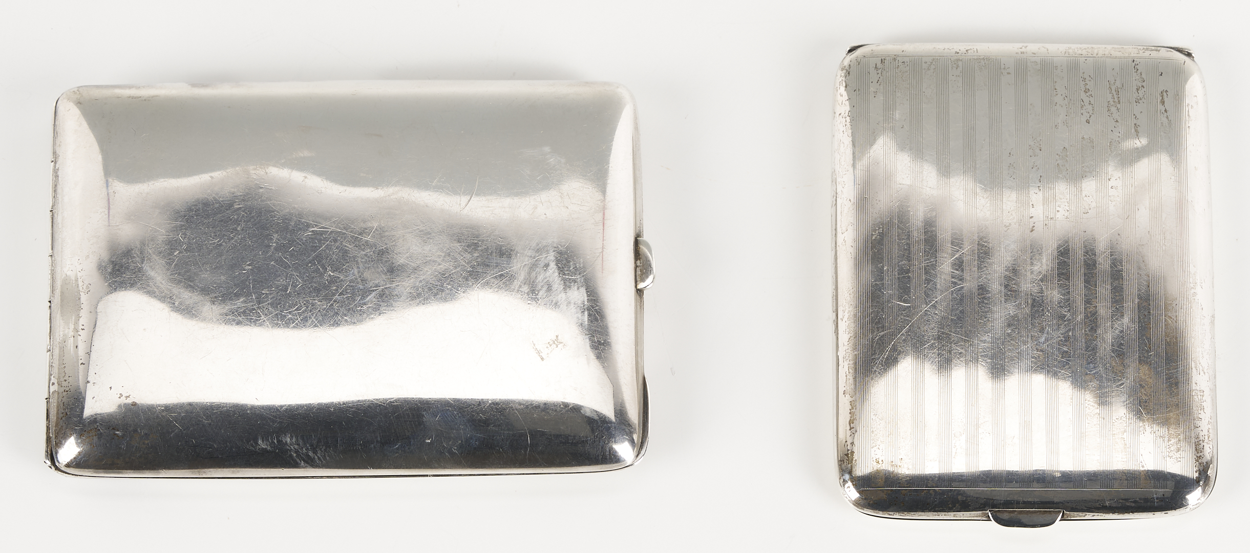 Eight (8) sterling silver personal items, mostly American, including 1 LeBolt hand hammered sterling hip flask, 2 regular sized card cases and 1 small card case, all marked “sterling,” 1 Webster Sterling ladies purse, 1 snuff box marked for R. Blackinton & Co., 1 Danish silver hand mirror with repousse outdoor scene, and 1 English Mappin and Webb dresser jar lid (lid only). Sizes range from 2 1/4 in. W x 1 1/4 in. D x 1/2 in. H to 6 1/2 in. L x 4 1/2 in. W x 1 1/2 in. H. Combined weighable silver: 25.09 oz troy. All items early 20th century.