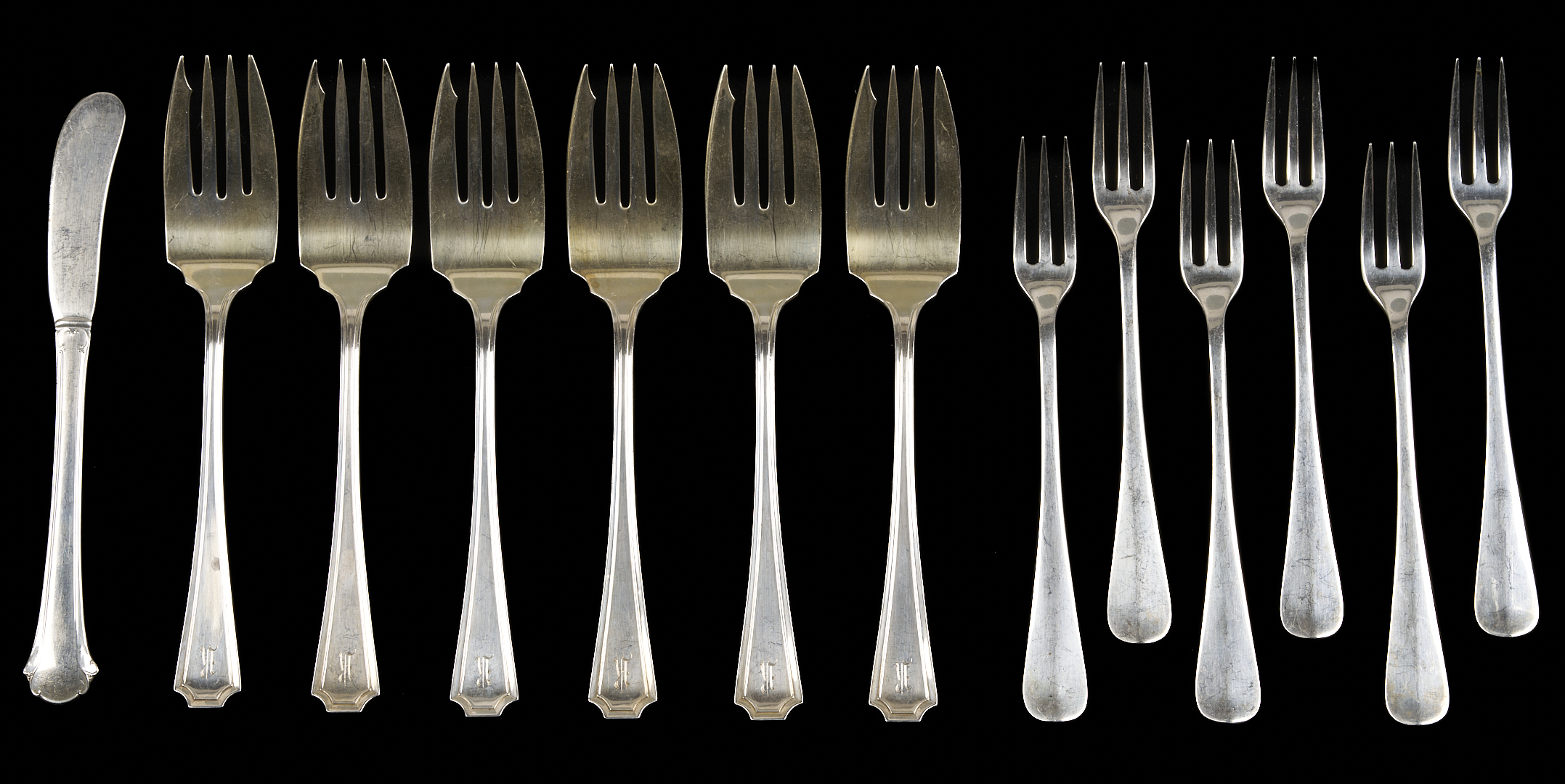 Thirty-three (33) pieces of assorted sterling silver flatware including: 1 Tiffany & Company Marquise pattern sardine fork; 6 Durgin salad forks retailed by Bailey, Banks & Biddle; 8 International Silver Company teaspoons; 4 Roger Williams Silver Company teaspoons; 6 Stieff cocktail forks; 1 Whiting teaspoon; 1 Towle teaspoon; 1 Towle grapefruit spoon with engraved bowl; 1 demitasse spoon (repair to handle below the bowl), 1 Towle butter spreader; 1 Durgin bon bon spoon; and 2 infant feeding spoons. 24.29 total troy ounces.