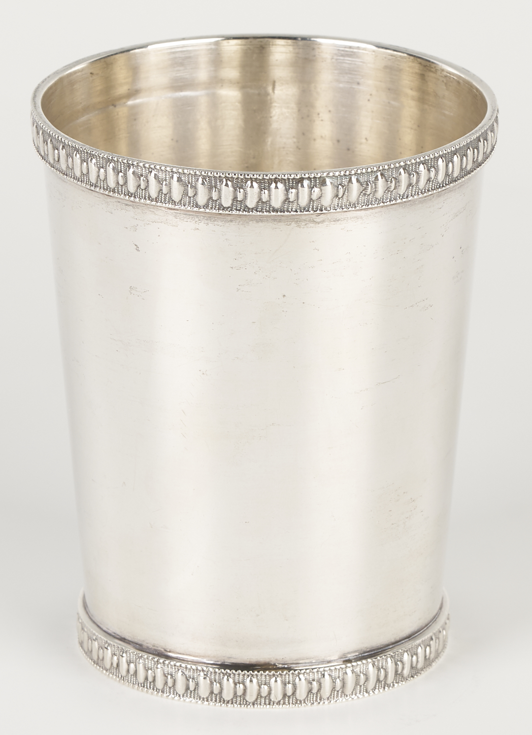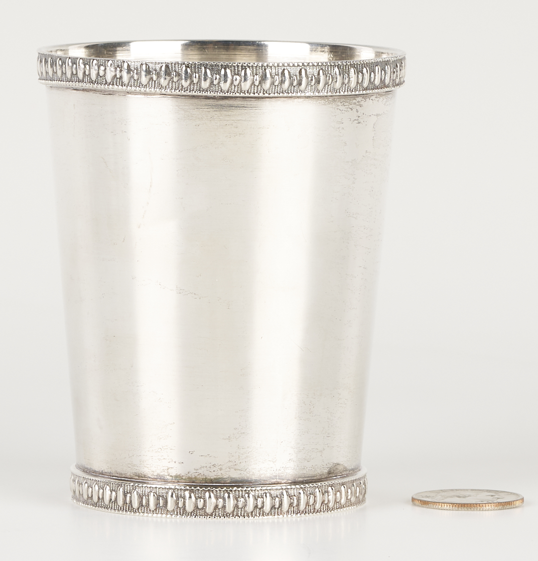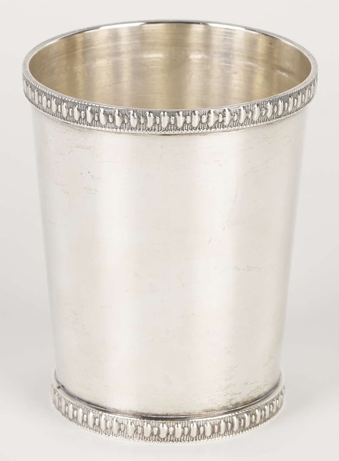American coin silver julep, incuse mark for William Kendrick, working in Louisville, KY, circa 1824-1880, with a raised bead and reel rim and base. 3 7/8 in. H. 5.16 troy ounces.