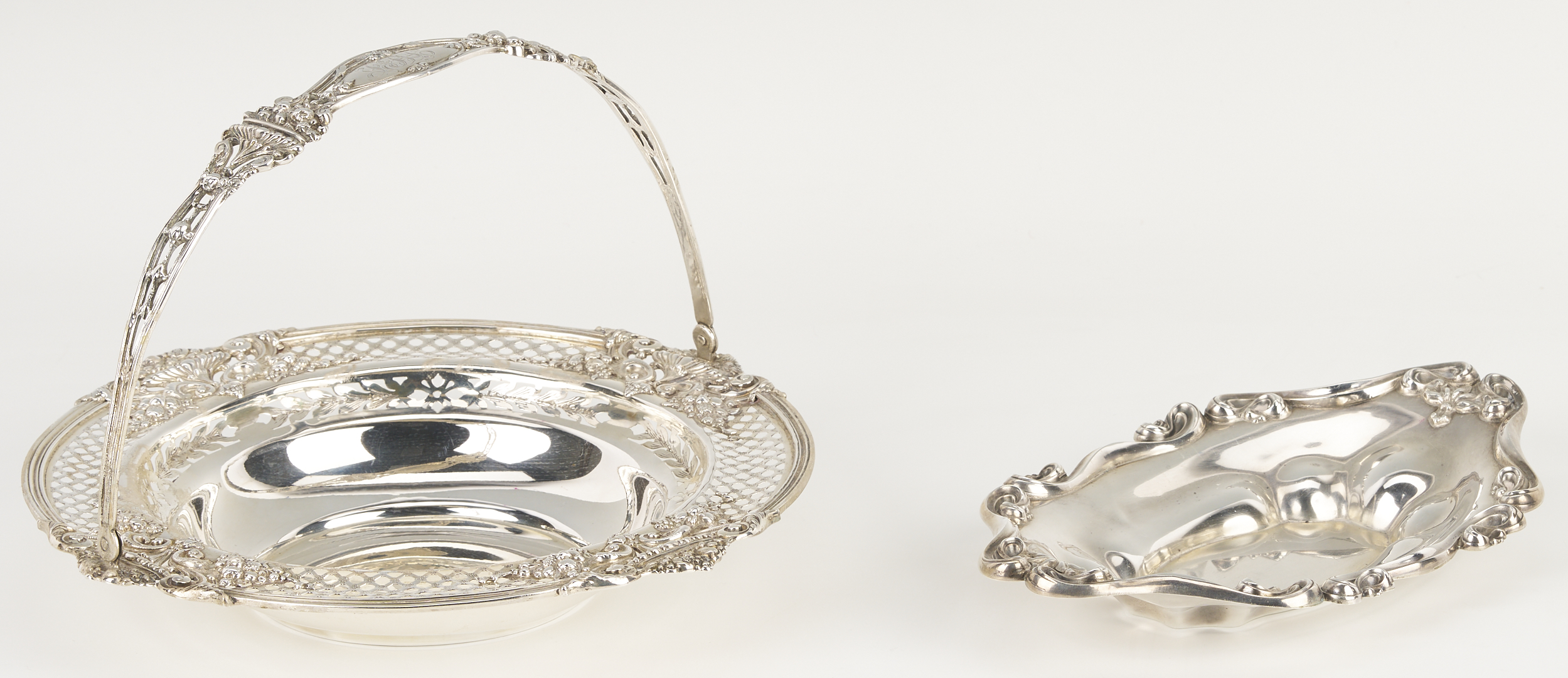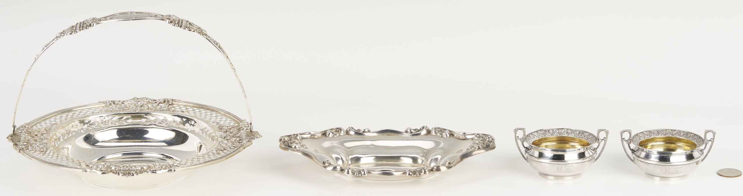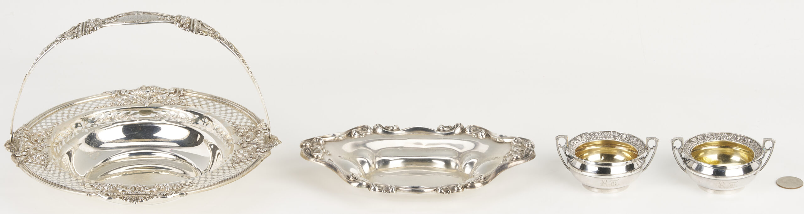 1st item: Antique Redlich Sterling Silver circular basket with reticulated border decorated with flower and fruit motifs, the pierced handle with engraved monogram LBL. 9 1/2 in. diameter overall. 2nd and 3rd items: pair of Wood and Hughes coin silver salt cellars with gilt interiors, stamped 900/1000, round handled design with anthemion banded rims, and monogrammed RT or RC (?) to sides. Each 2 3/4 in diameter excluding handles. 4th item: International Sterling silver candy dish with scrolled borders, 8 in x 5 in. Combined weight, sterling: 16.41 oz t. Combined weight coin silver: 4.11 oz t.