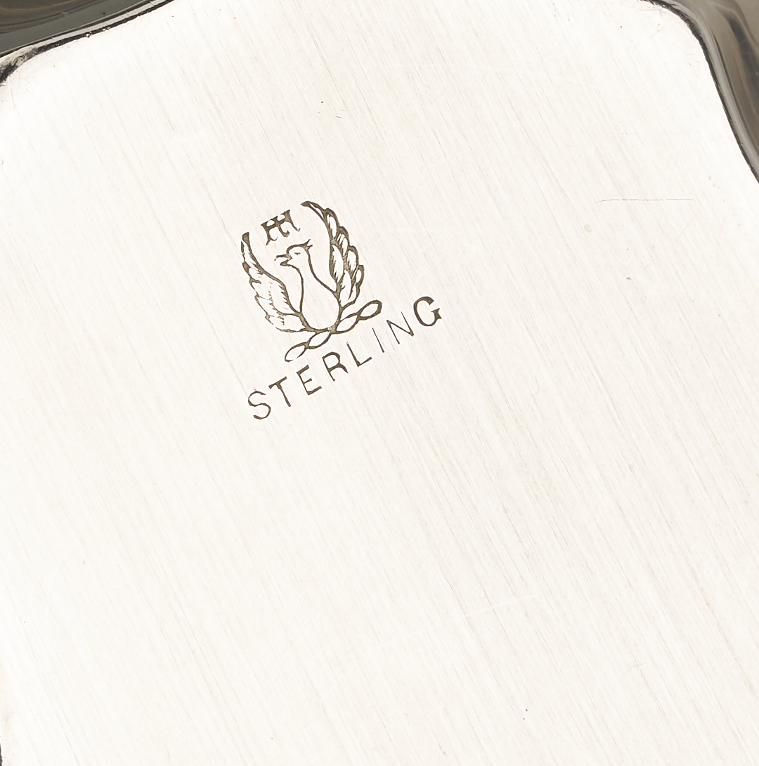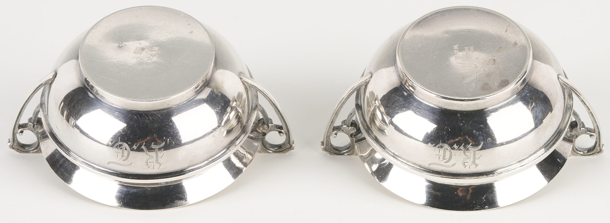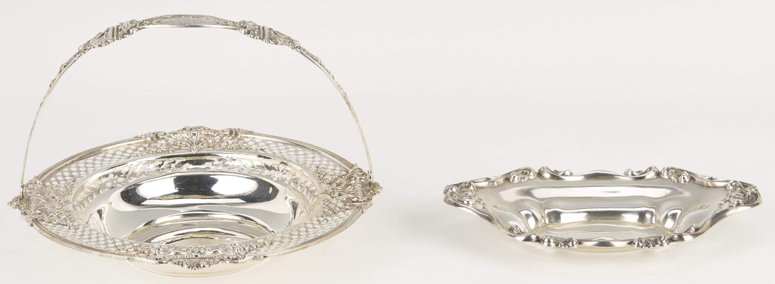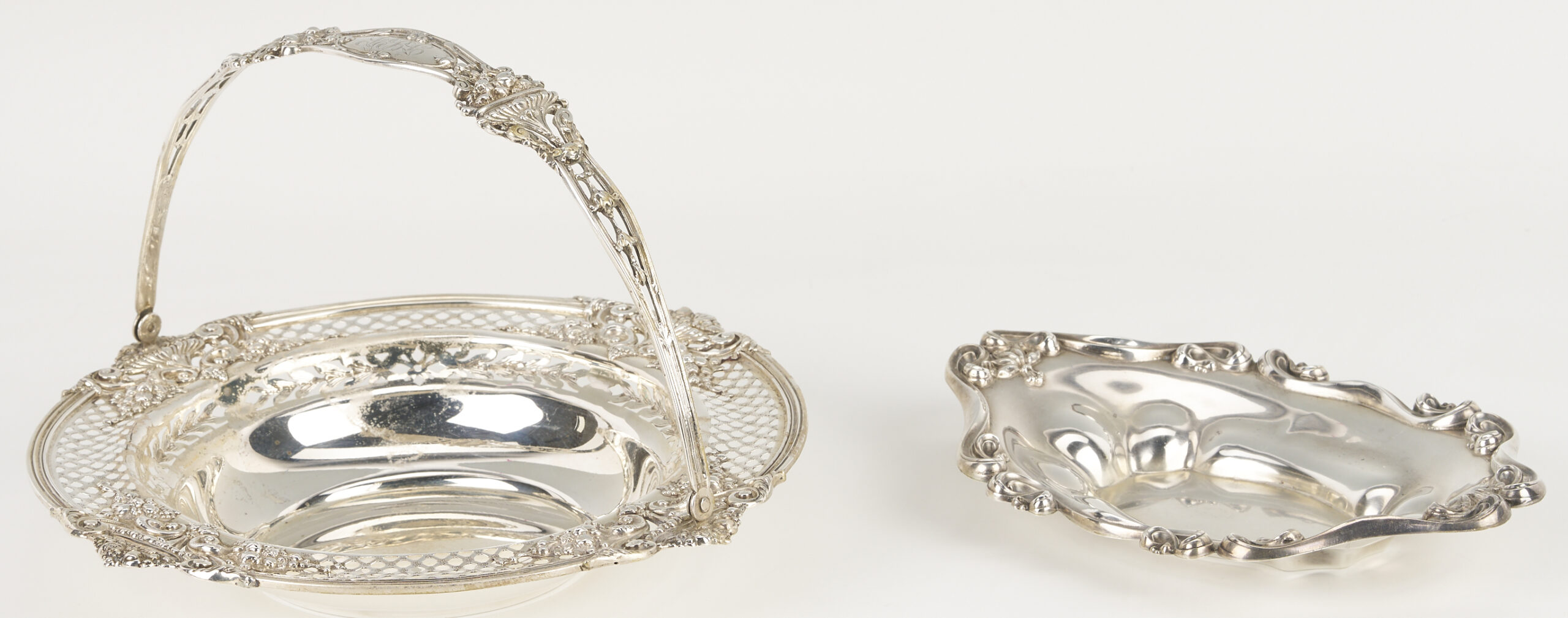 1st item: Antique Redlich Sterling Silver circular basket with reticulated border decorated with flower and fruit motifs, the pierced handle with engraved monogram LBL. 9 1/2 in. diameter overall. 2nd and 3rd items: pair of Wood and Hughes coin silver salt cellars with gilt interiors, stamped 900/1000, round handled design with anthemion banded rims, and monogrammed RT or RC (?) to sides. Each 2 3/4 in diameter excluding handles. 4th item: International Sterling silver candy dish with scrolled borders, 8 in x 5 in. Combined weight, sterling: 16.41 oz t. Combined weight coin silver: 4.11 oz t.