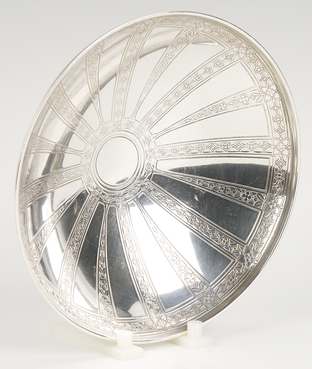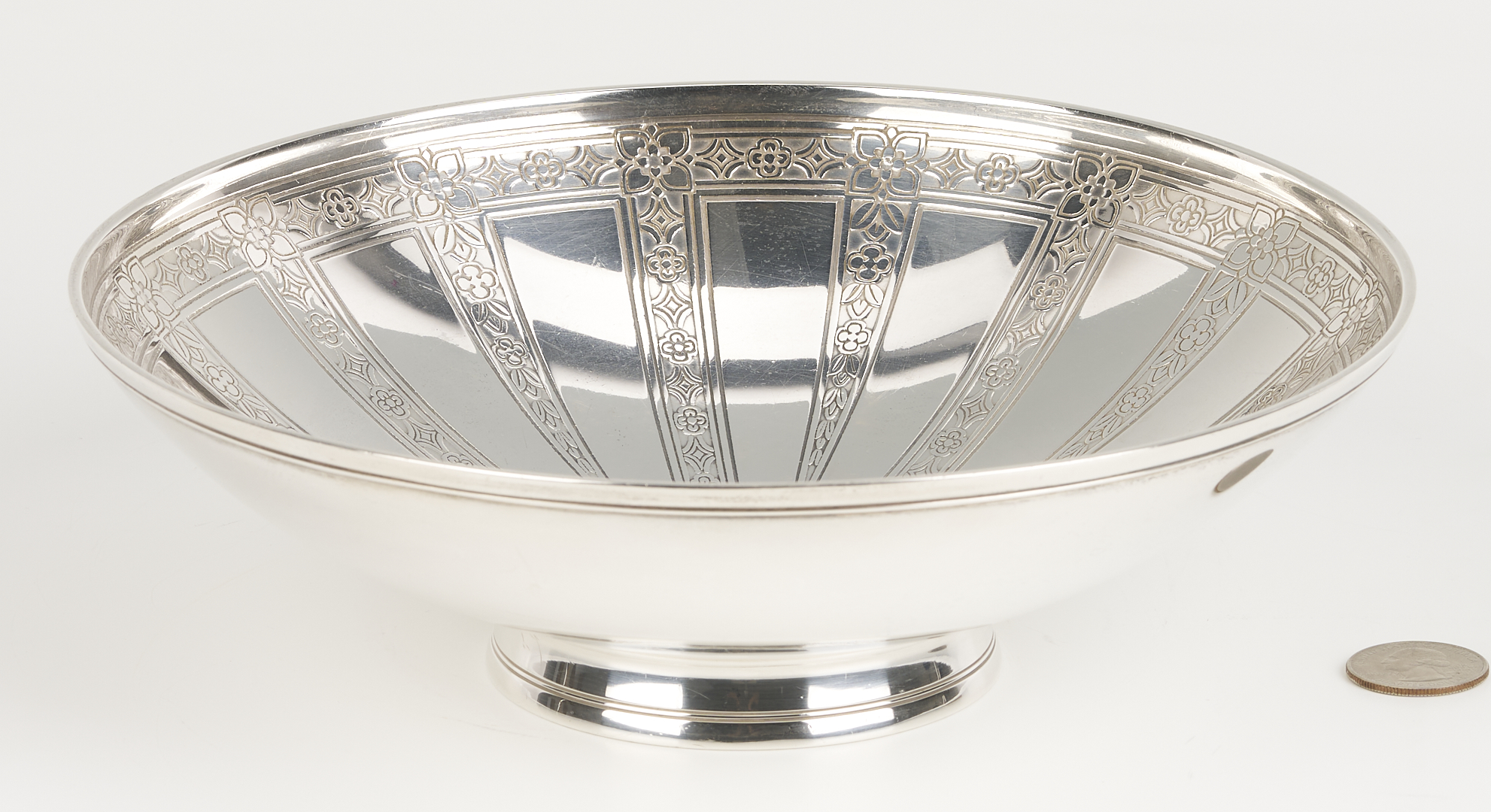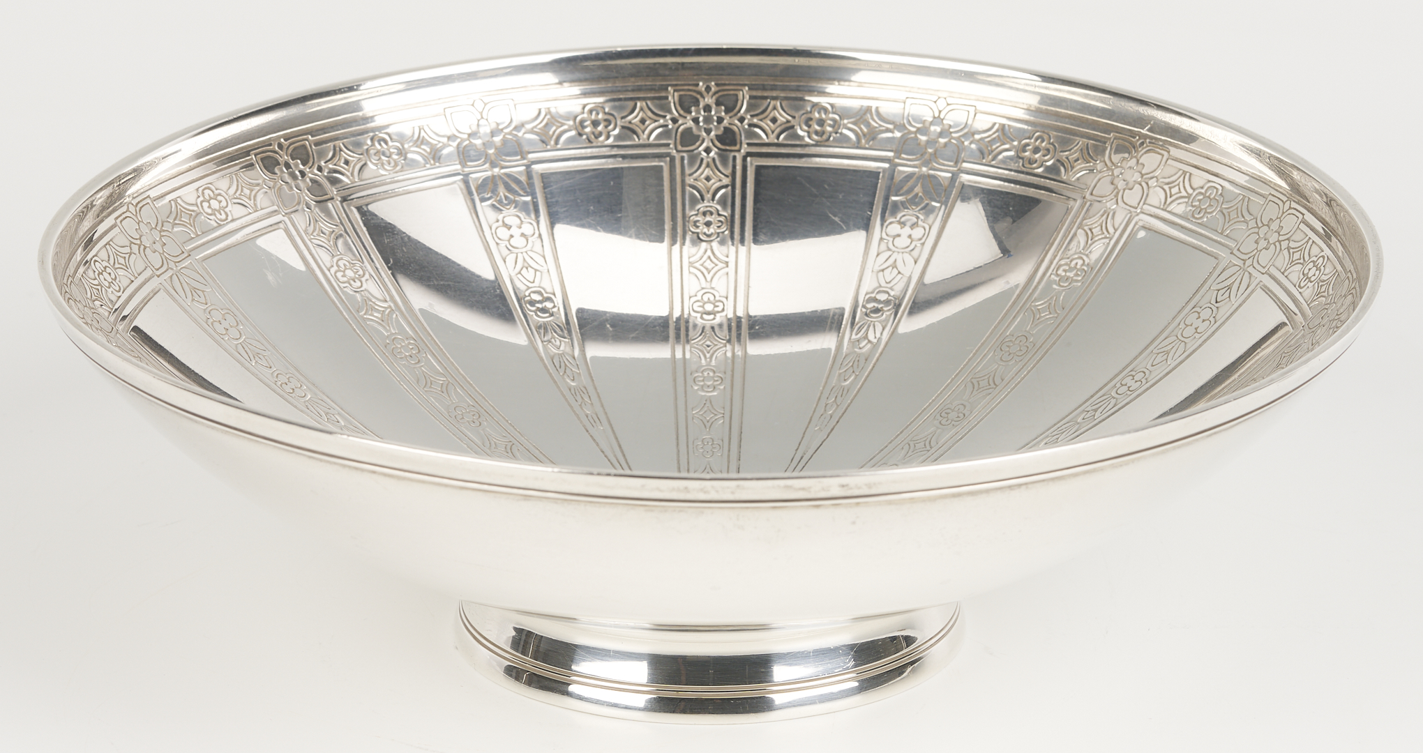 Tiffany & Co. Art Deco period Sterling Silver bowl, with 1929 presentation inscription to underside: NEW YORK YACHT CLUB / WON BY DORESS / FIRST PRIZES, SPECIAL RACES / JUNE 13 AND 14, 1929. Circular form with molded rims and the interior with chased bands of quatrefoil decoration; all raised on a narrow circular foot. 8 7/8 in. Diameter, 16.86 oz troy.