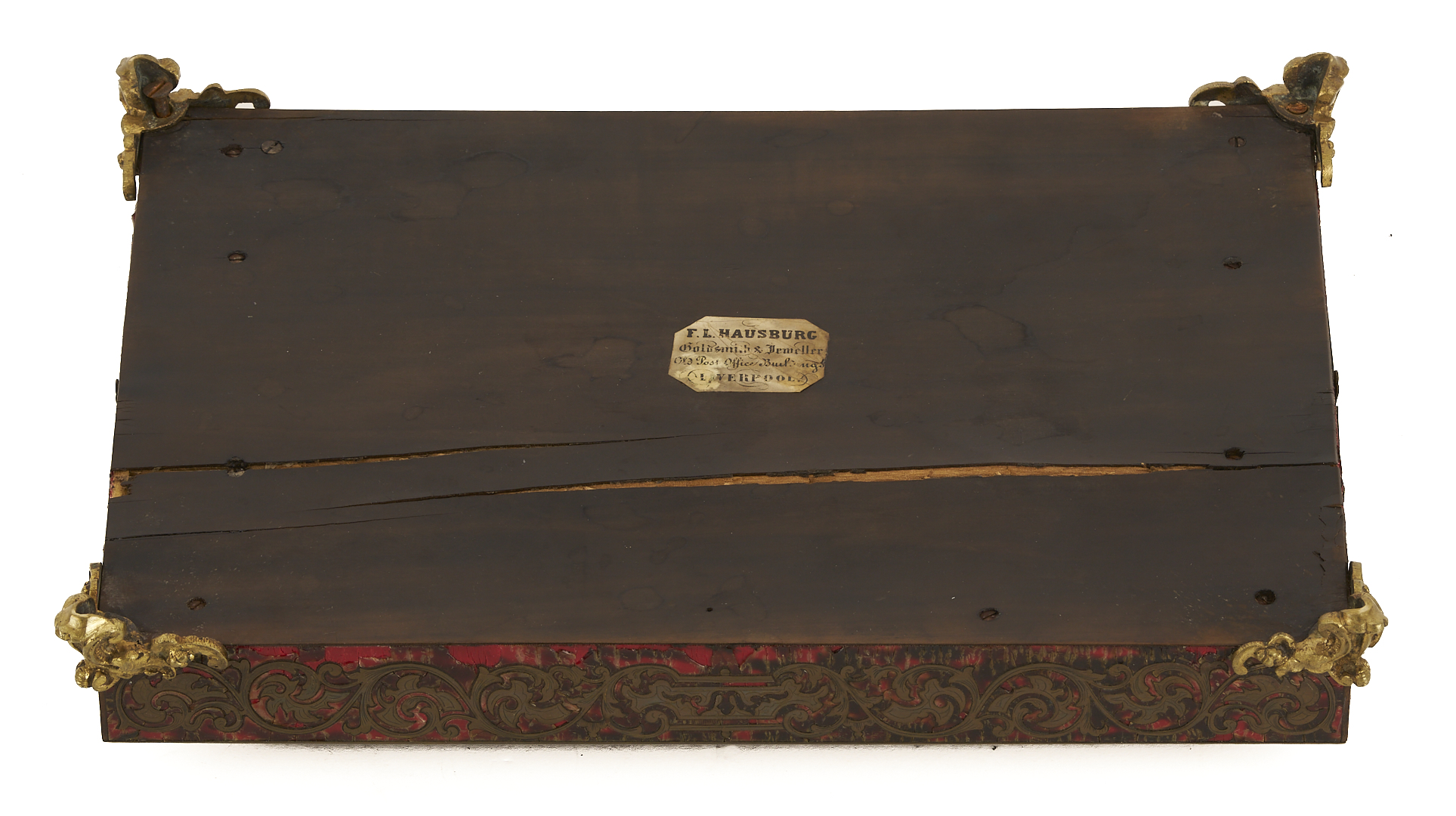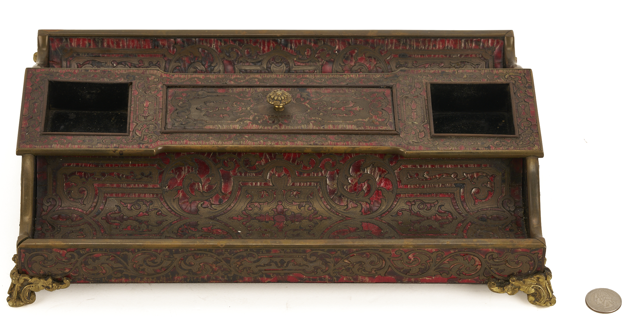 1st item: Continental Boulle Marquetry double inkstand, faux red tortoise veneered lacquer, with brass inlay and bronze mounts, featuring dual curved pen trays, ink wells, and a center compartment with bronze pull, and mounted with four Rococo-style gilt bronze feet. Labeled to the bottom and to the bottom of the interior compartment for retailer, “F. L. Hausberg / Goldsmith & Jeweller / Old Post Office Building / Liverpool”. 14 in. W x 10 in. D x 3 in. H. 19th century. 2nd item: English antique oak bottle case with mahogany and light wood fan inlay to each corner of the top. Fitted with a brass bail handle on the top and a brass lock. 11 in. H x 14 in. W x 13 in. D. 19th century.