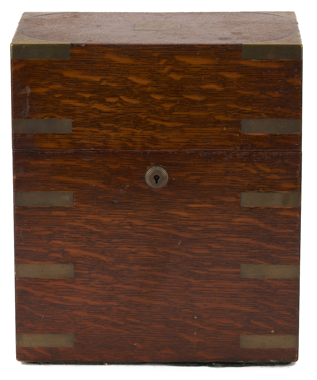 Three (3) brass-bound or inlaid wooden boxes, including 1 Army & Navy brass-bound oak twin decanter box with two cut glass decanters, and an interior label reading Army & Navy CSL Makers; 1 mahogany, brass, and mother-of-pearl inlaid writing box with a fitted interior, and 1 brass-bound pine storage box with brass handles, escutcheon, and oval plate to the lid. Ranging in size from 3 3/4 in. H x 11 3/4 in. W x 9 in. D to 8 1/2 in. H x 17 in. W x 9 in. D. Late 19th/early 20th century.