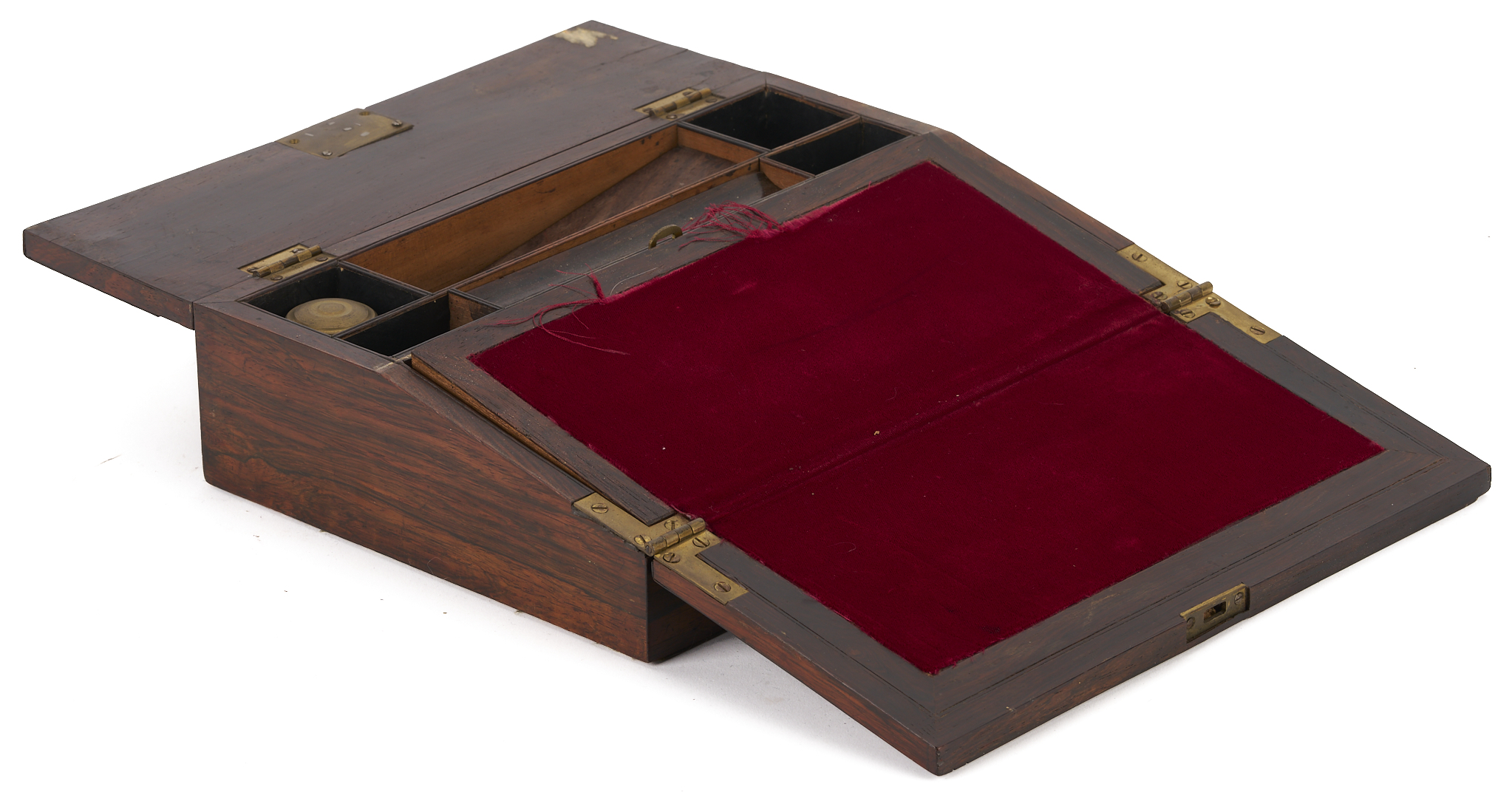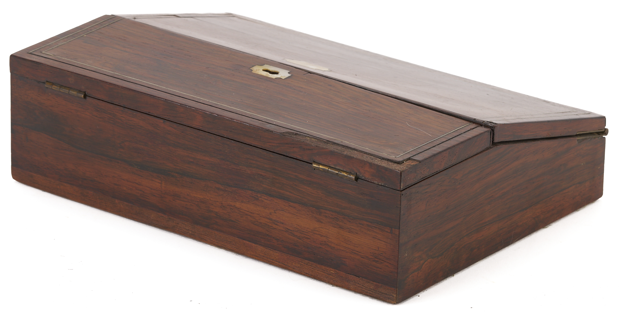 CONDITION: Decanter box in overall good condition with scattered surface abrasions. Writing box with losses to the top left edge and wear to the interior. Additionally, not all of the interior elements are present. Storage box with oxidation to brass, wear to brass trim corners on the top, and scattered surface abrasions.