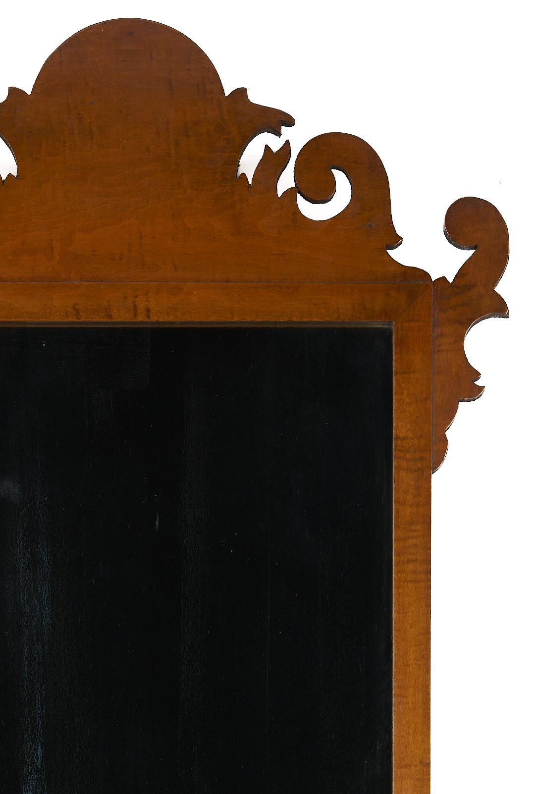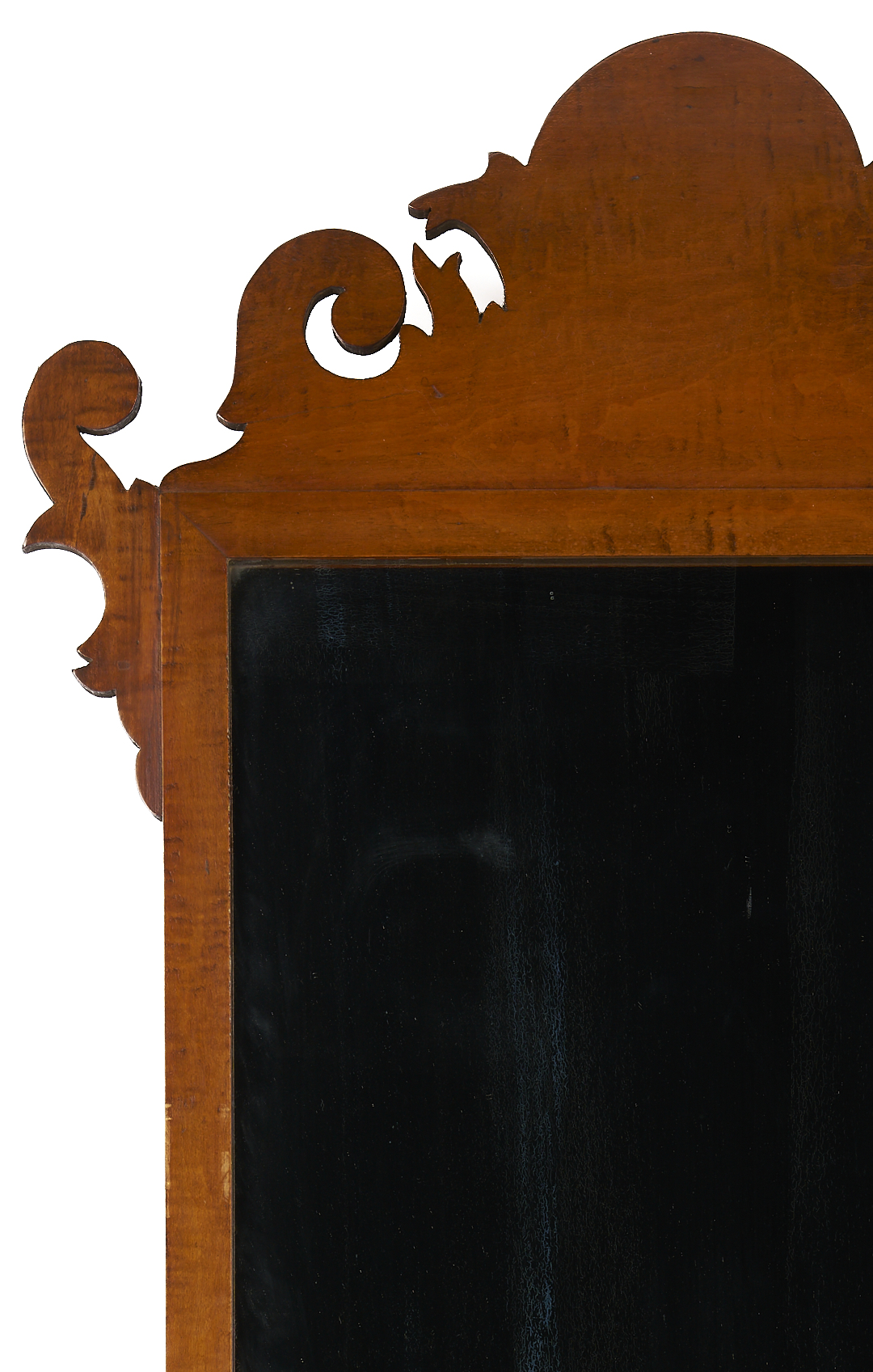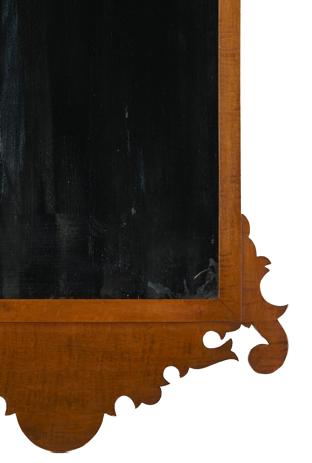 An American, possibly Mid-Atlantic, cherry Chippendale-style mirror, rectangular form consisting of one pane of glass, inner molding, and a fretwork crest and matching apron cut in a complex scroll pattern. 39 1/8 in. H x 19 1/2 in. W. 19th century.