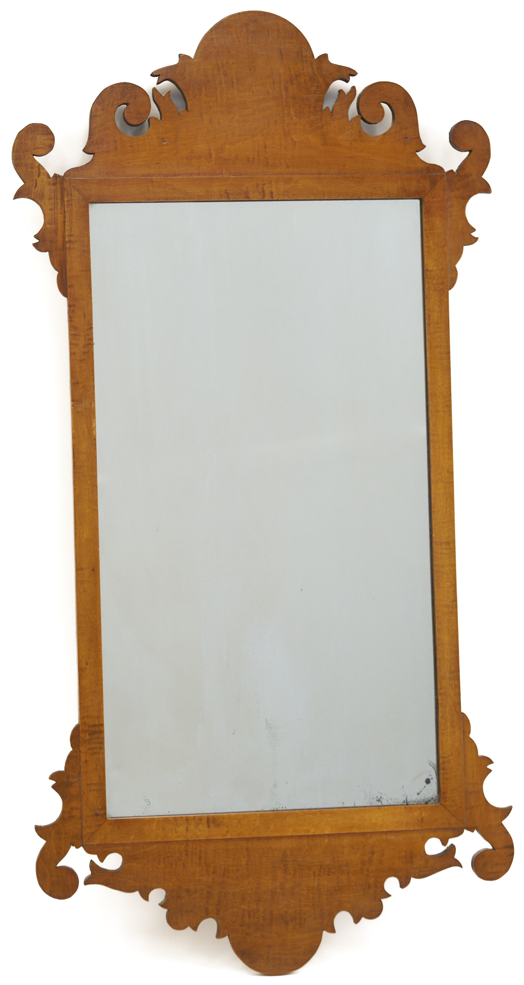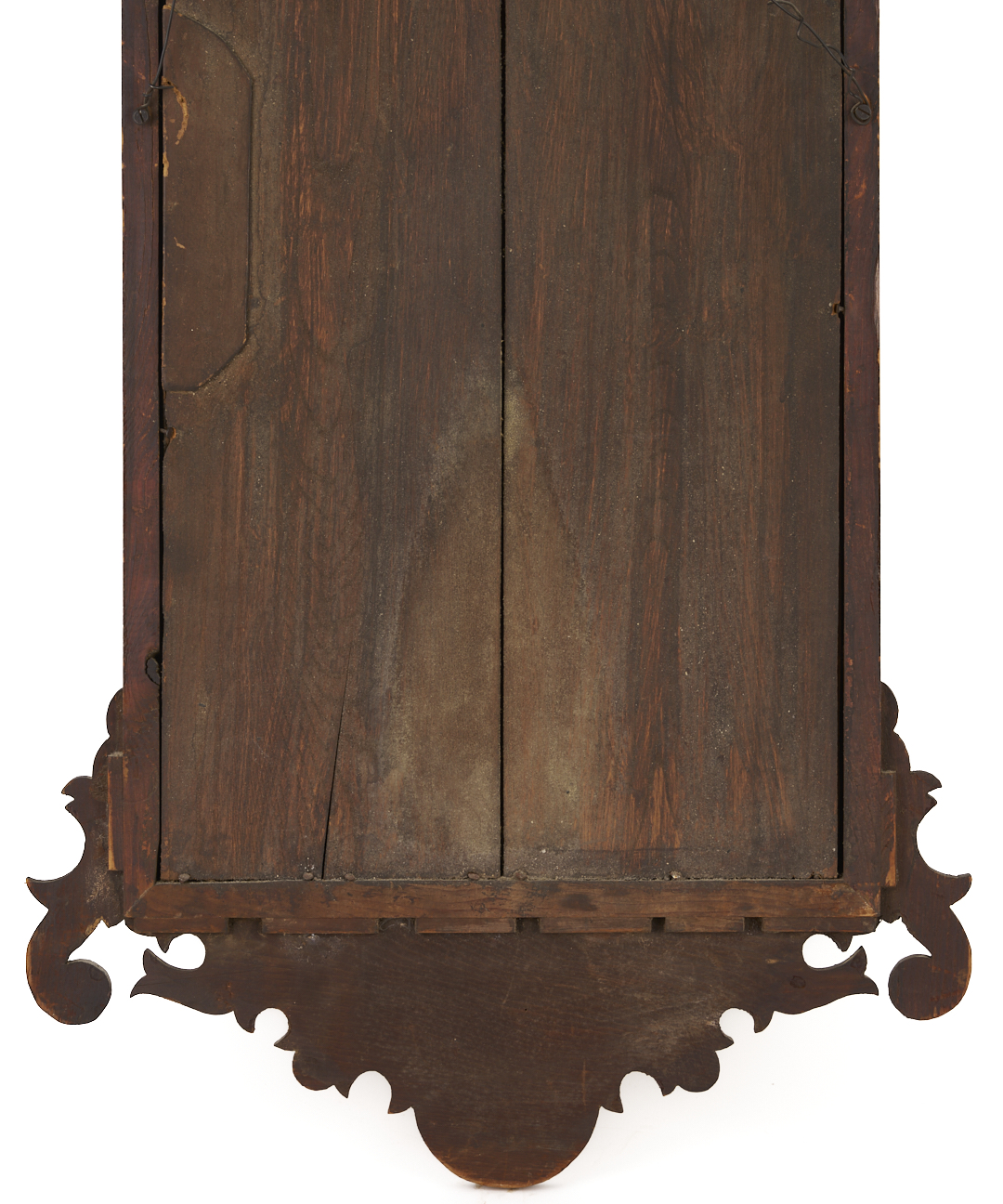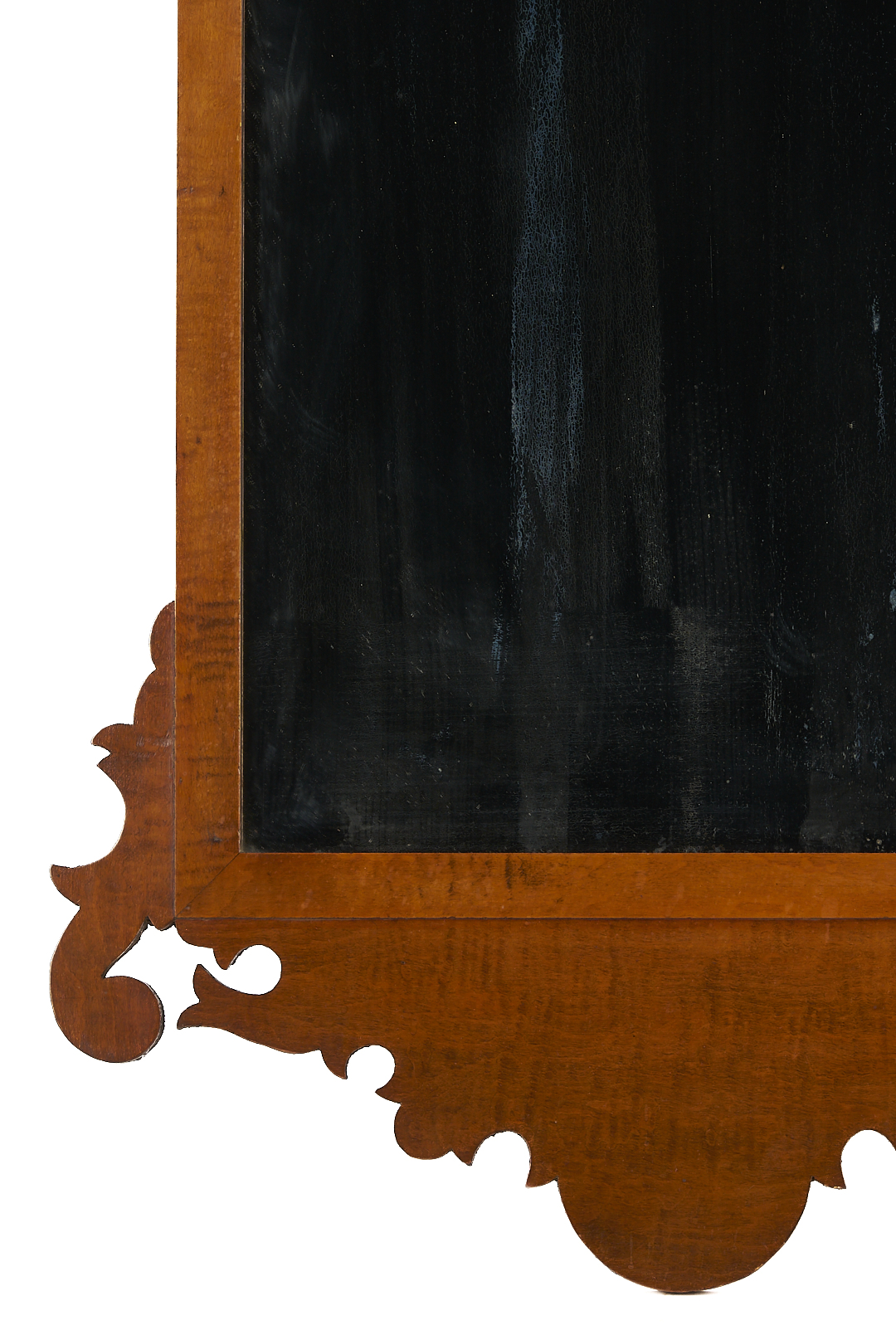 An American, possibly Mid-Atlantic, cherry Chippendale-style mirror, rectangular form consisting of one pane of glass, inner molding, and a fretwork crest and matching apron cut in a complex scroll pattern. 39 1/8 in. H x 19 1/2 in. W. 19th century.