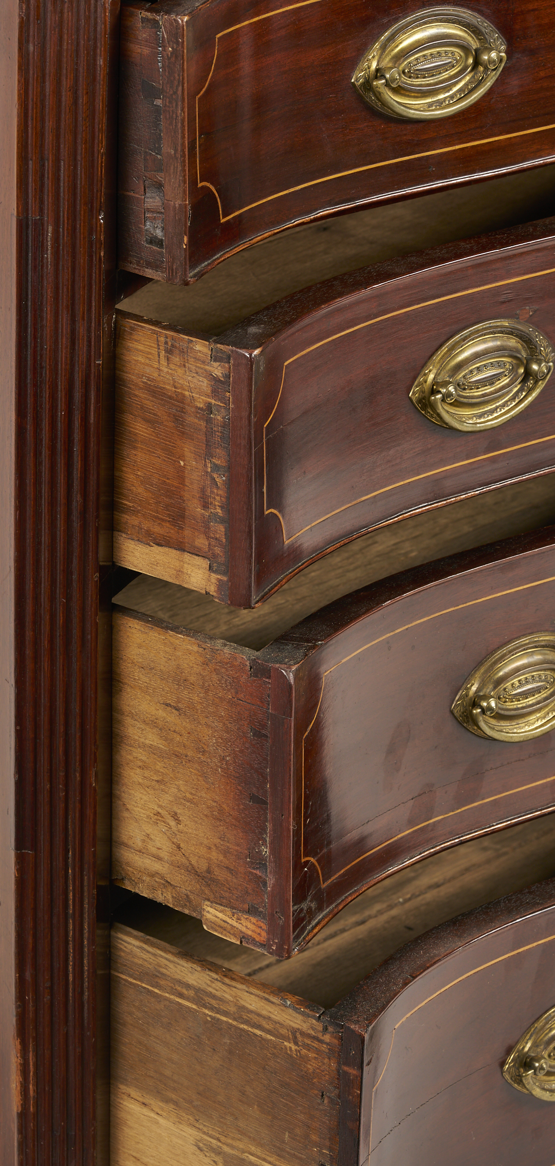 English Georgian-style serpentine chest consisting of a serpentine top above four string-inlaid, graduated, and dovetailed drawers flanked by canted and reeded stiles, and resting on bracket feet. 31 3/8 in. H x 40 1/2 in. W x 22 3/4 in. D. Late 19th/Early 20th century.