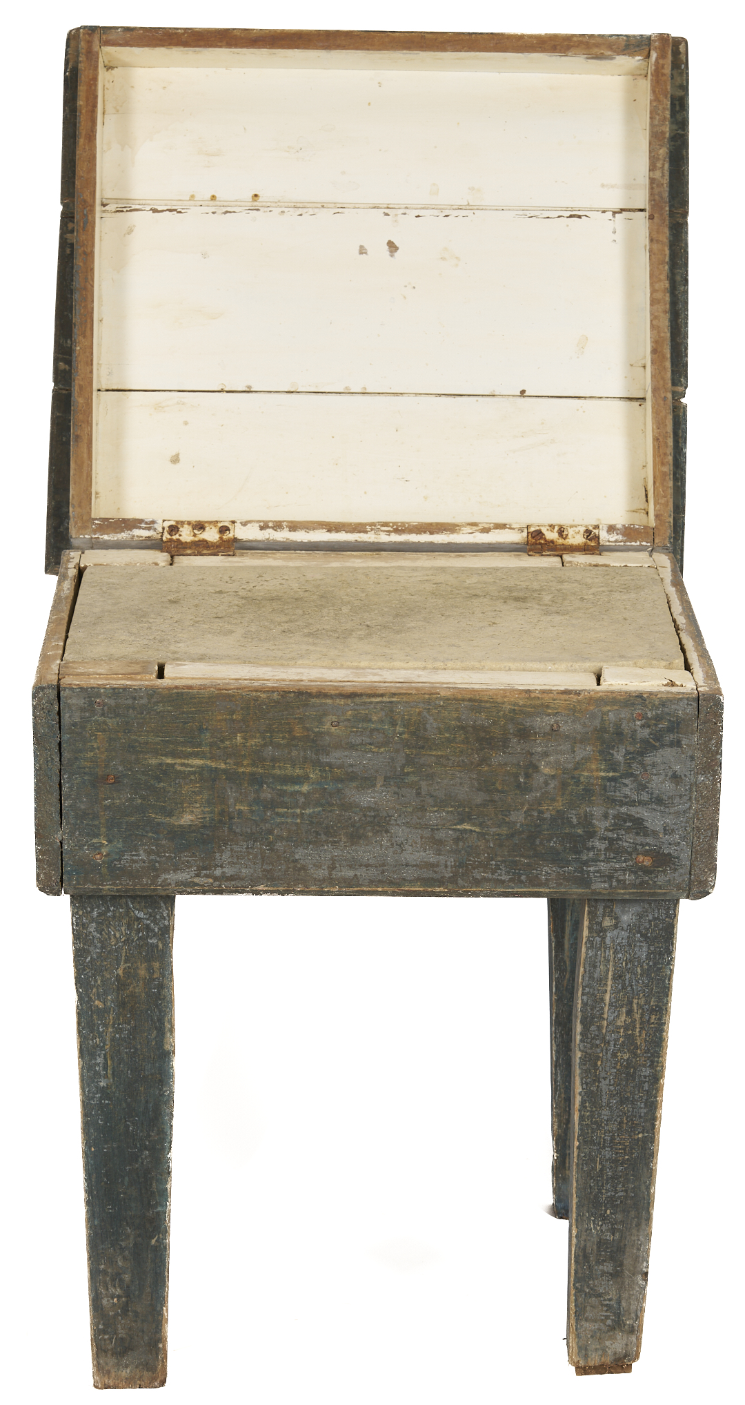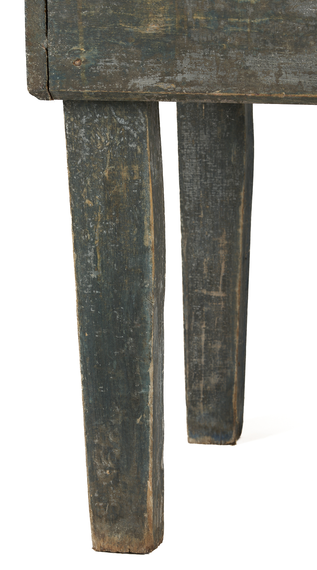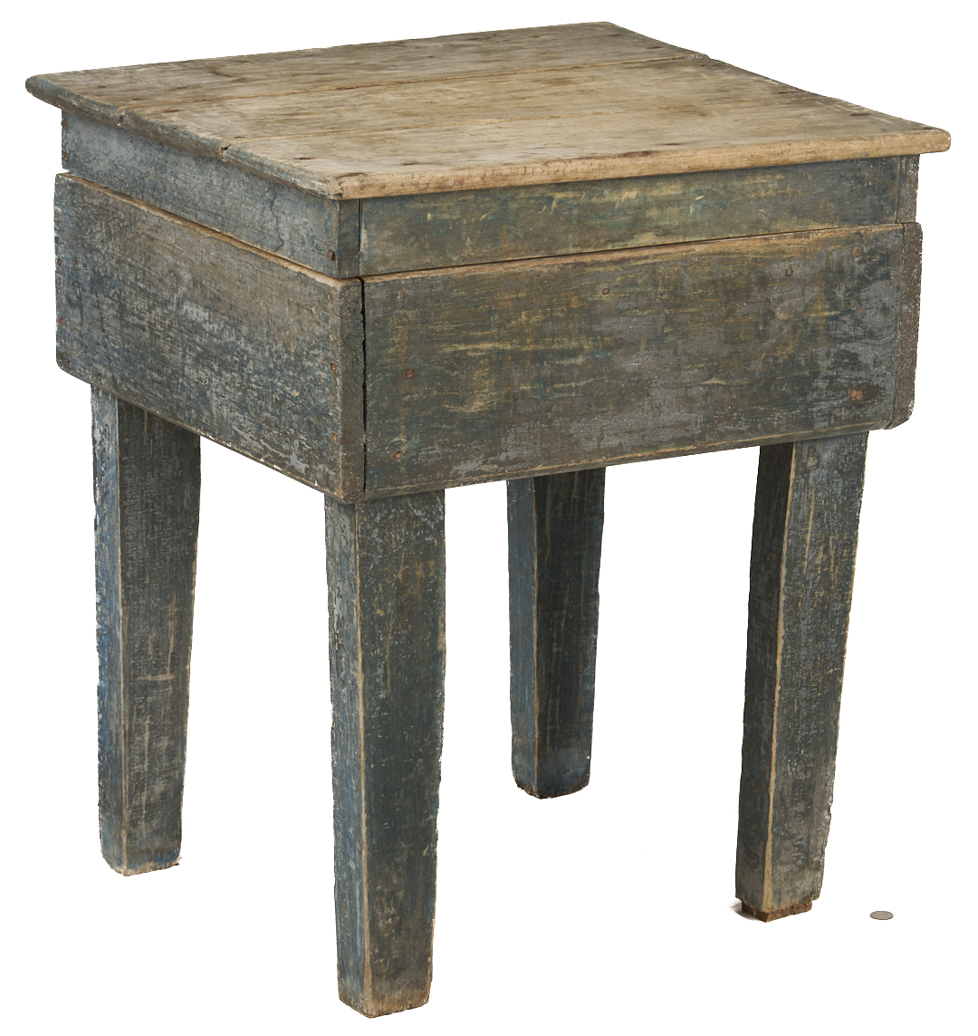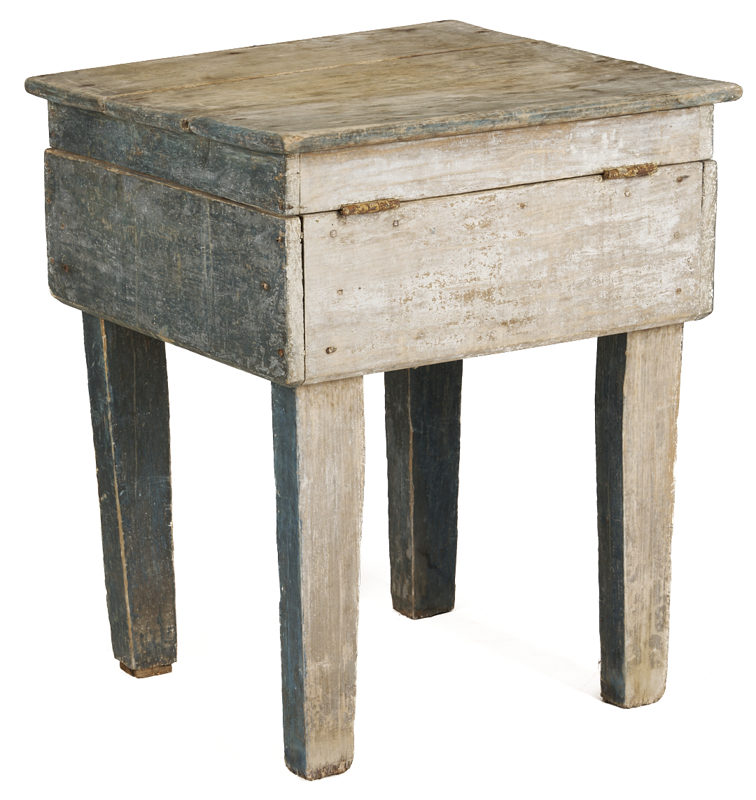 Tennessee beaten discuit board and cover in old blue and cream paint on poplar, with limestone slab. Old square nail construction. Three-board hinged cover with rounded edges lifts to reveal a central well with removable old honed limestone slab, surrounded by plain sides and supported on four substantial square legs. 33 in. H x 27 in. W x 25 in. D. Third quarter of the 19th century.