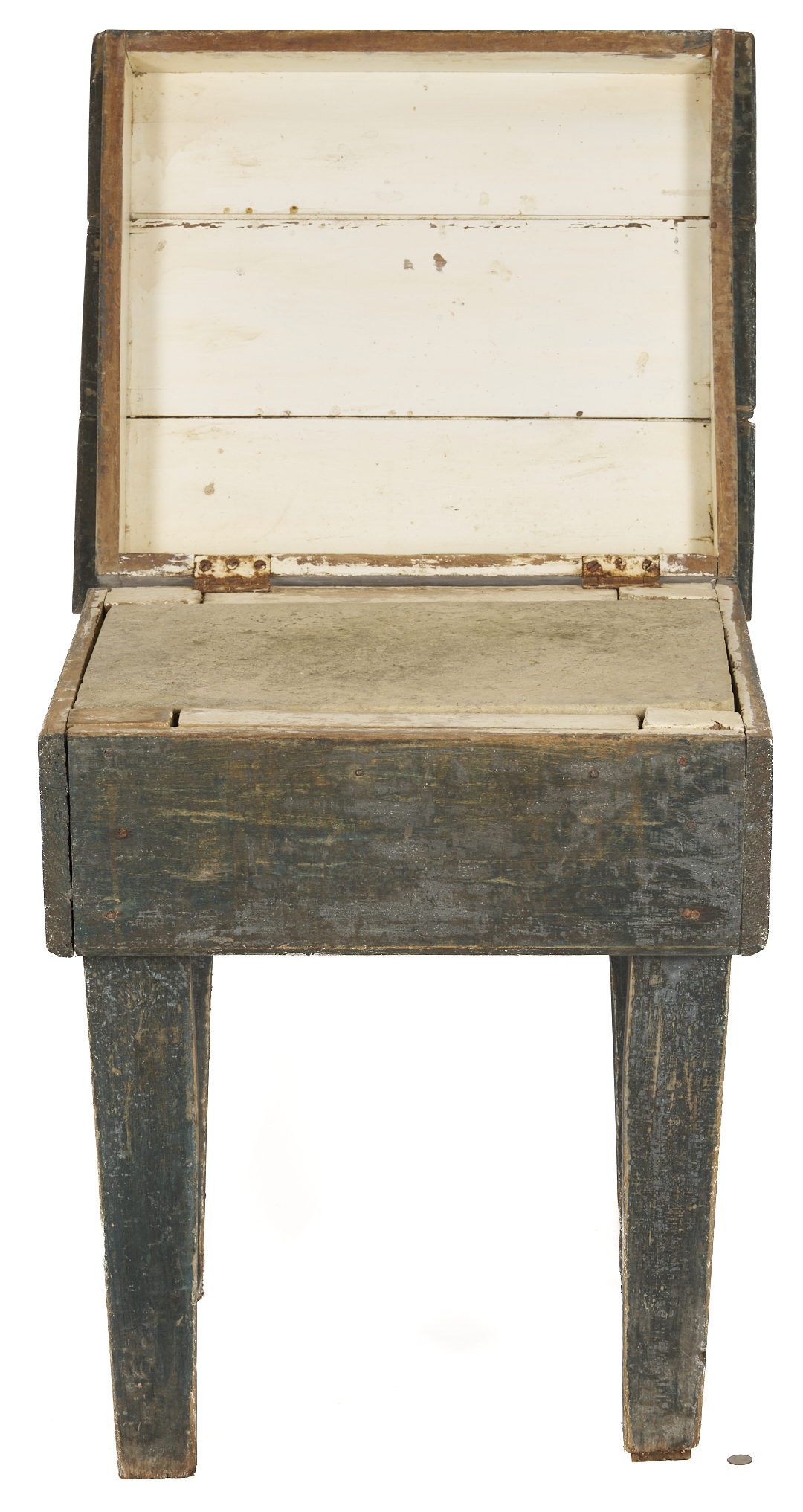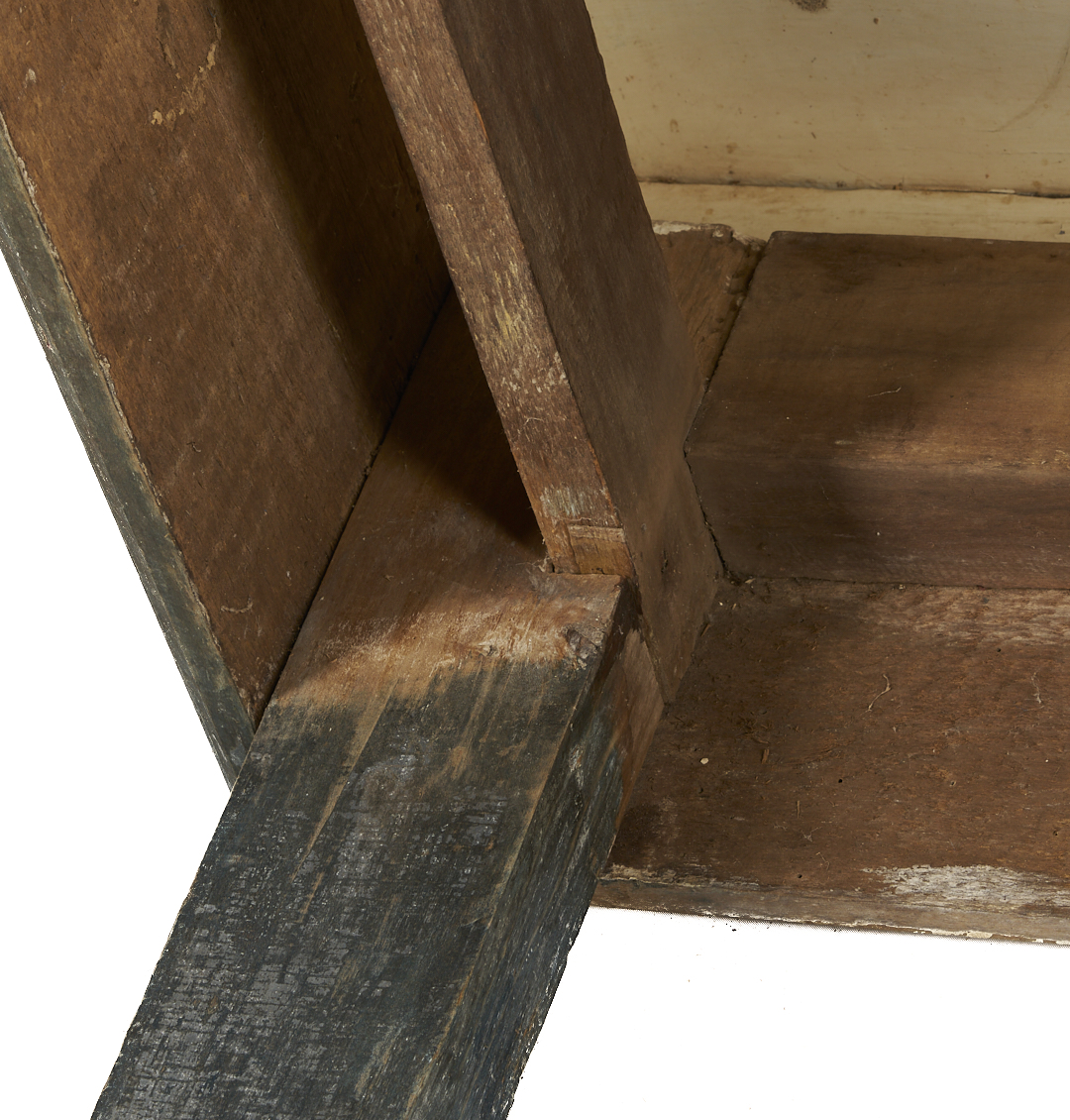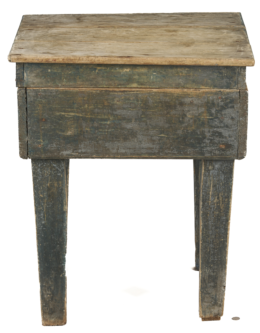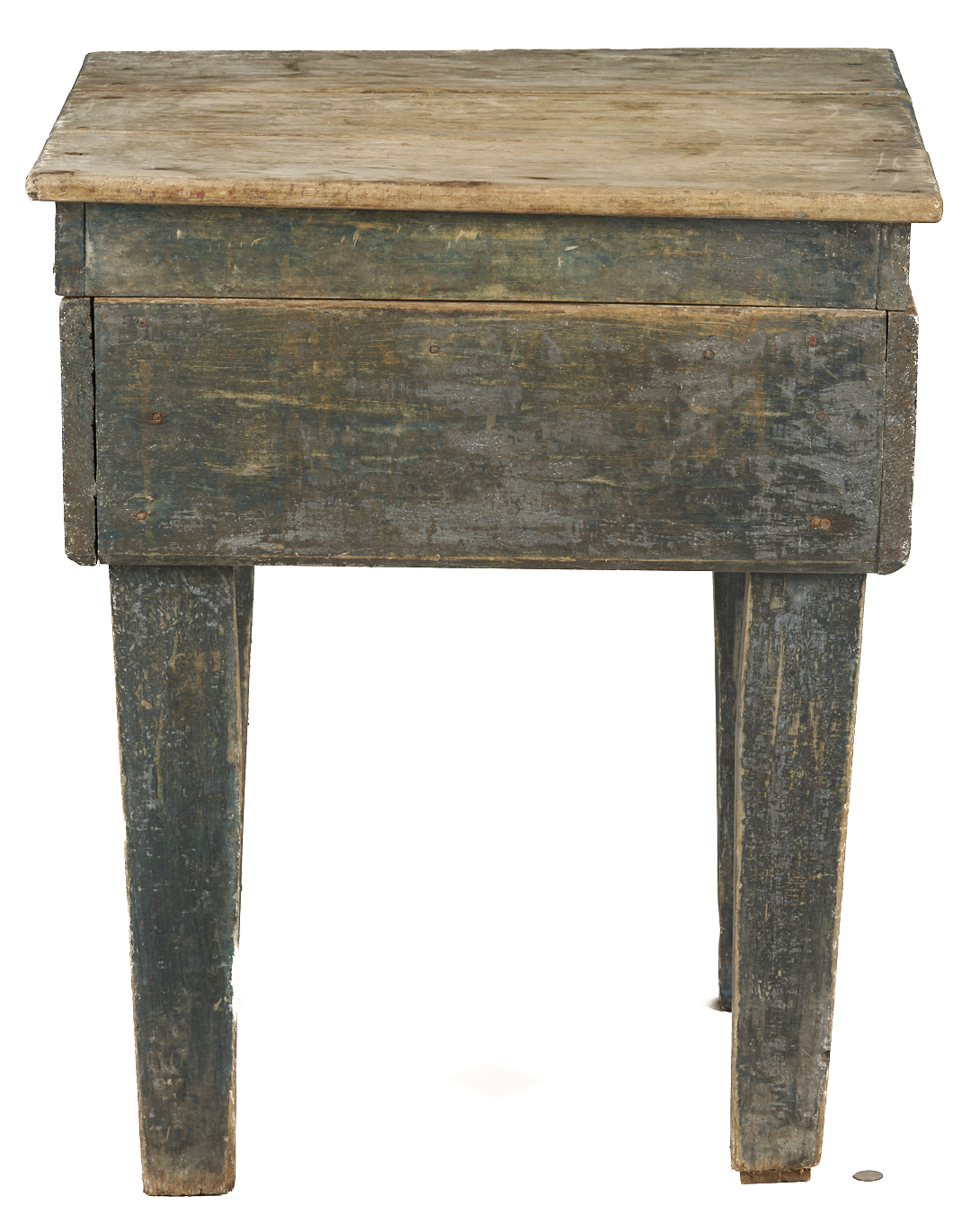 Tennessee beaten discuit board and cover in old blue and cream paint on poplar, with limestone slab. Old square nail construction. Three-board hinged cover with rounded edges lifts to reveal a central well with removable old honed limestone slab, surrounded by plain sides and supported on four substantial square legs. 33 in. H x 27 in. W x 25 in. D. Third quarter of the 19th century.