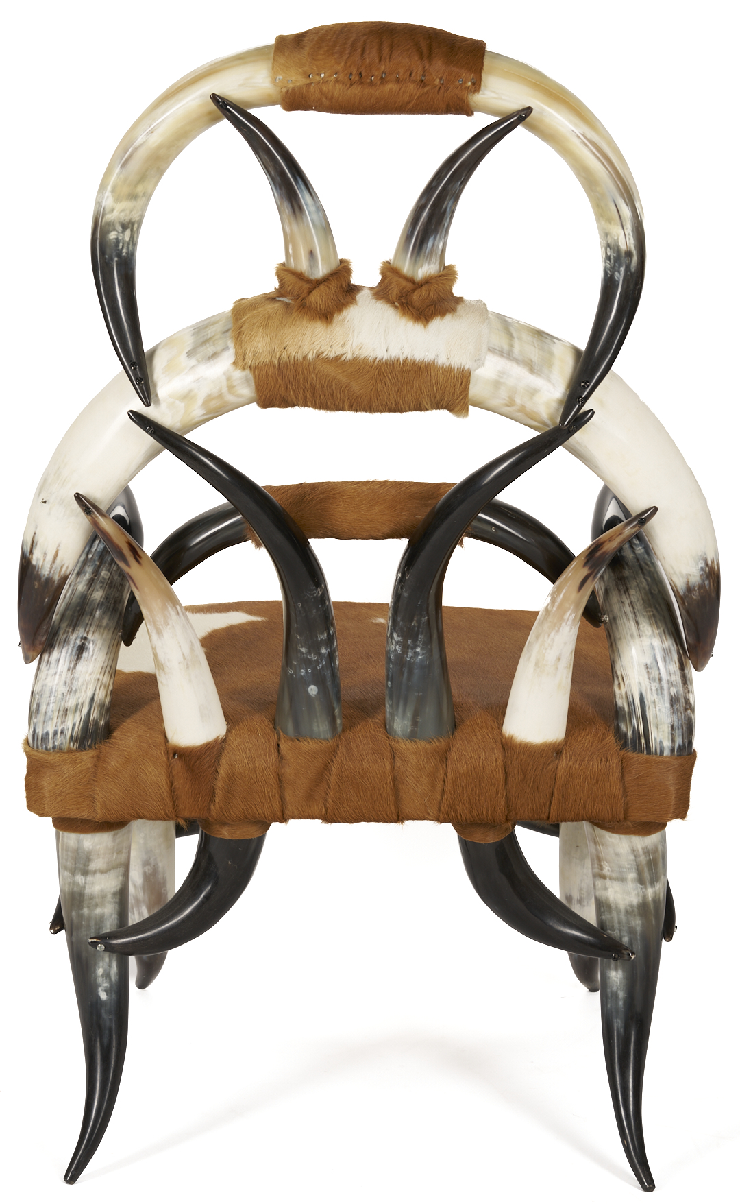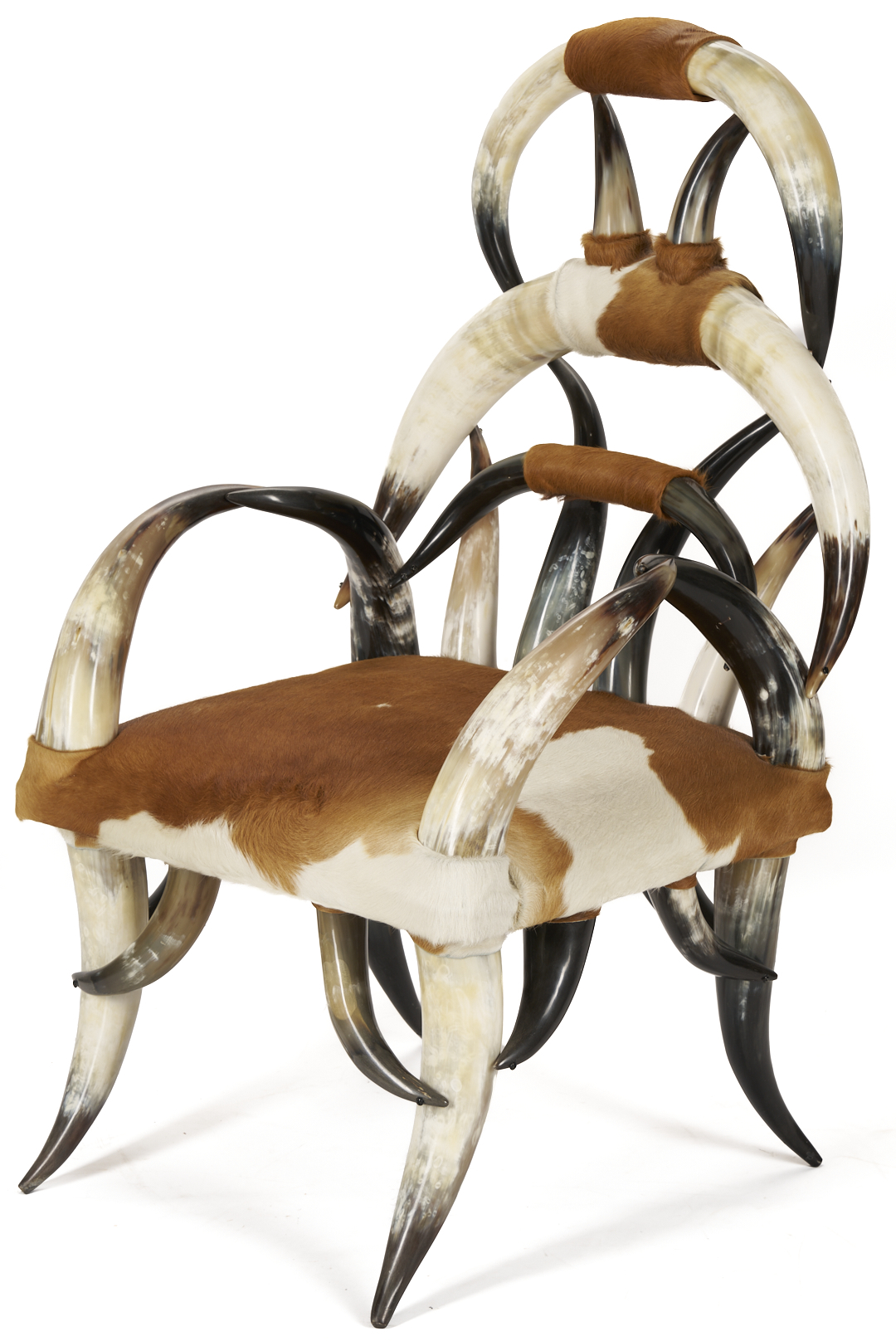 Southern highback steer horn armchair in the manner of William Mittmann, comprised of over 25 horns and featuring a cowhide upholstered seat. 46 1/4 in. H x 25 1/2 in. W x 22 1/4 in. D. Probably Texas, Early to Mid 20th century.