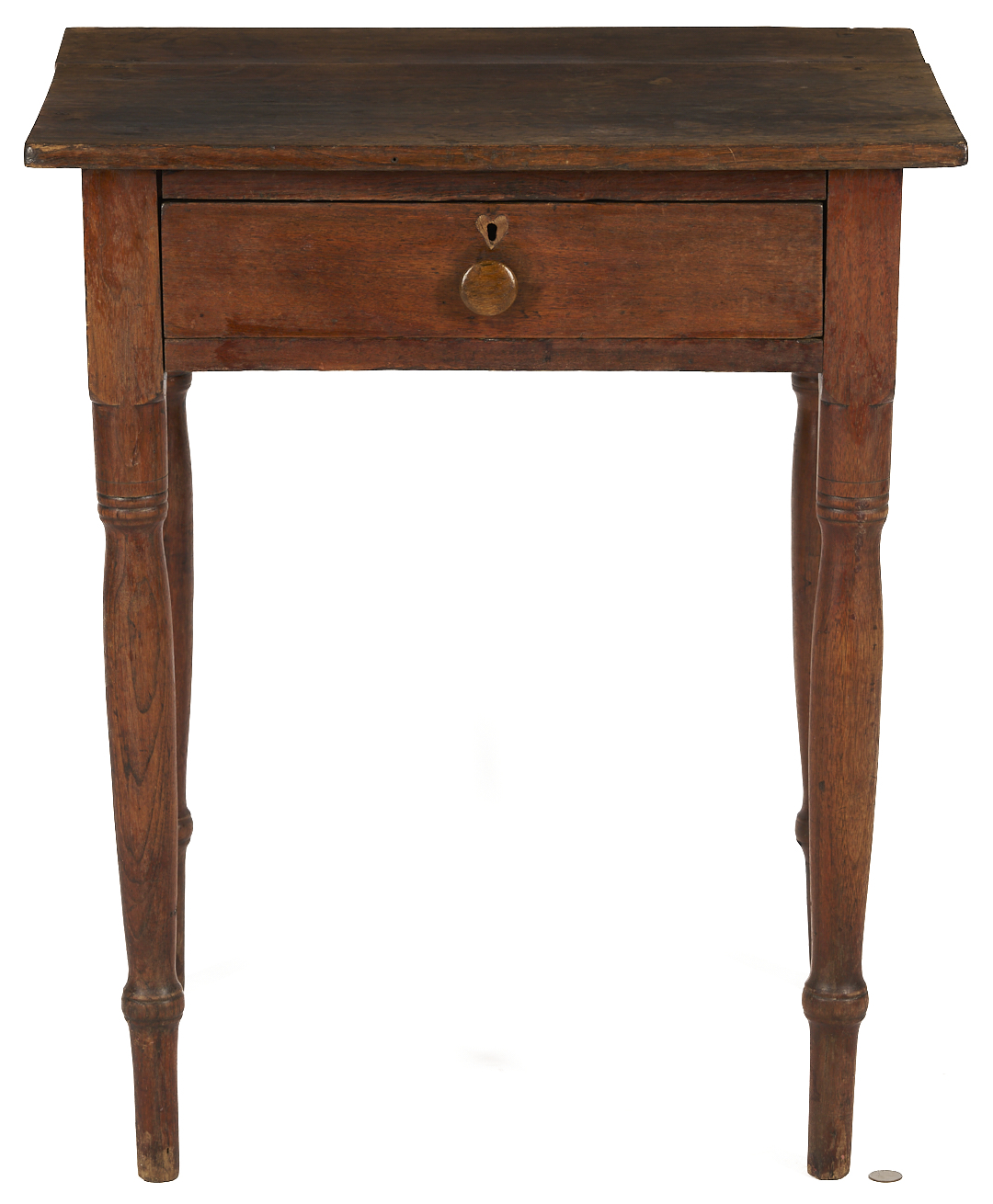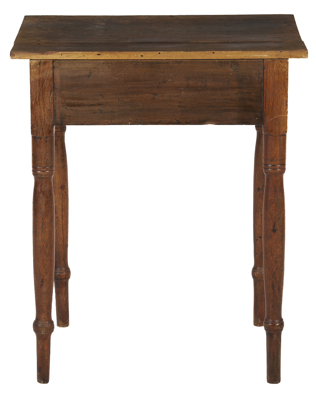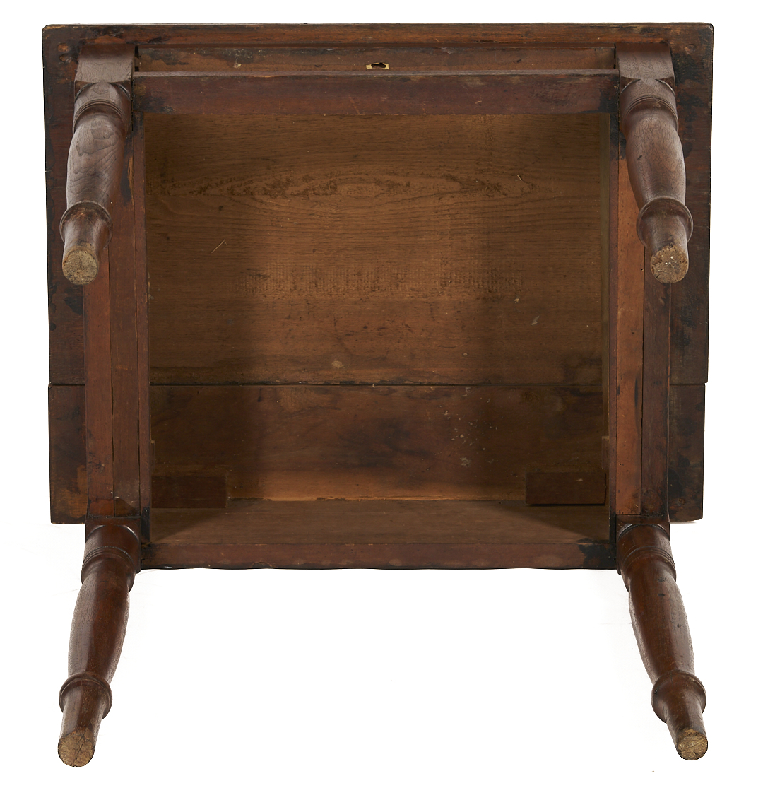 American walnut one-drawer inlaid work table or stand, white pine secondary. Rectangular plain top over a single dovetailed drawer having a later, crude inlaid heart escutcheon, and four ring-turned tapering legs ending in spike feet. 29 7/8 in. H x 25 in. W x 19 1/4 in. D. Mid 19th century.