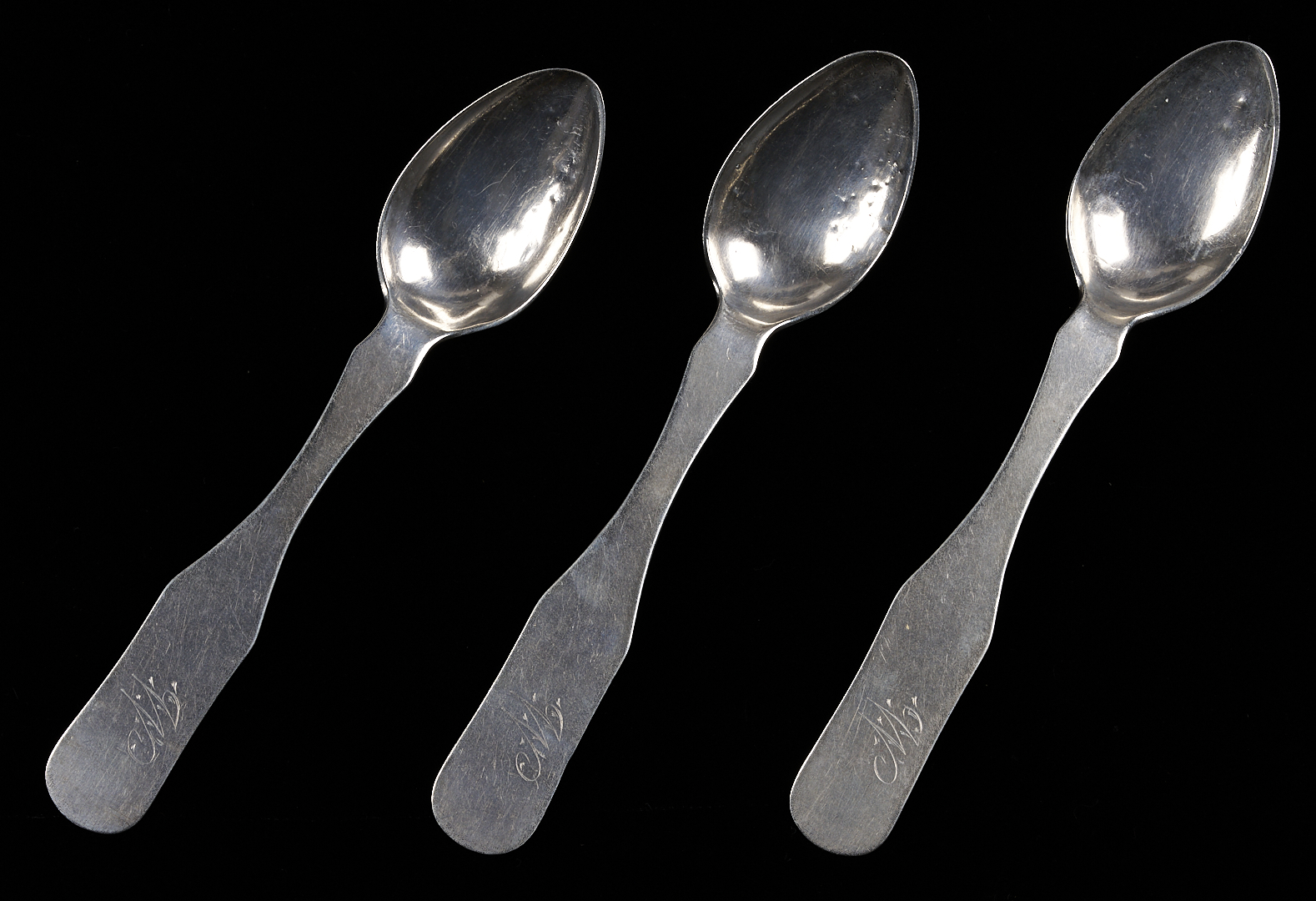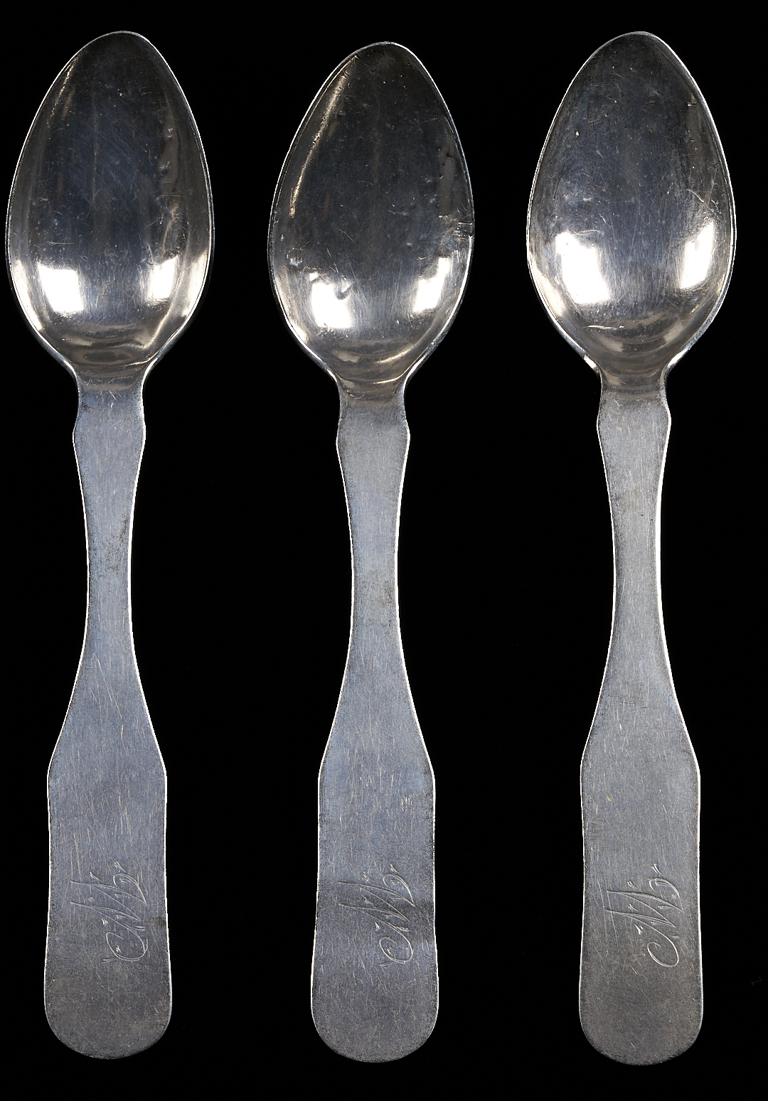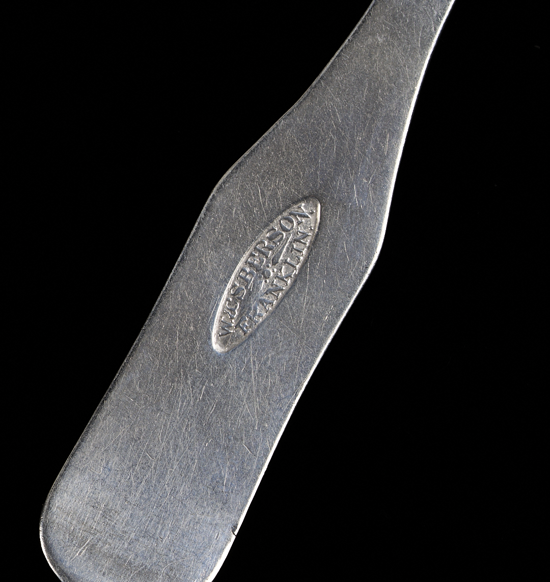 Three Middle Tennessee (3) fiddle handle coin silver teaspoons marked W & S BERSON / FRANKLIN for William and Solomon Berson, working Williamson County, TN from 1833-1838. William and Solomon were sons of the watch and clockmaker, jeweler, silversmith, and goldsmith William Berson, Sr., working in Franklin (Williamson County, TN) from 1833-1843. This mark is illustrated on page 39 (fig. 38a.) in the book Tennessee Silvermiths by Dr. Benjamin H. Caldwell. 5 1/4 in. L. 1.34 total troy ounces.