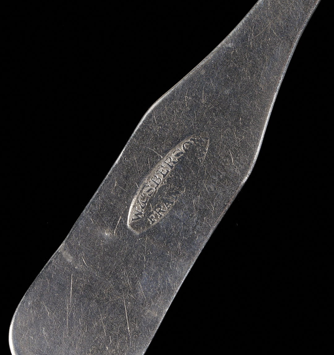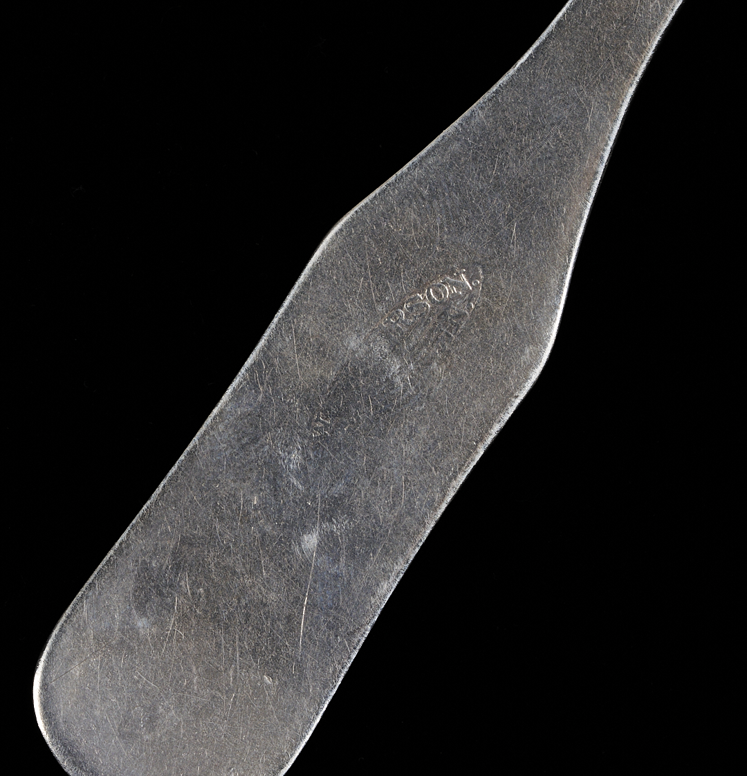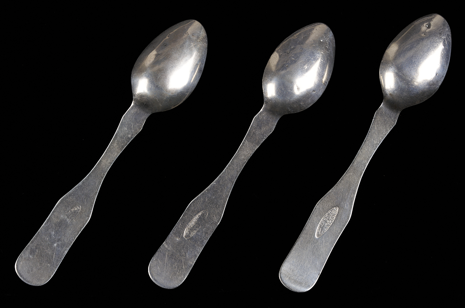 Three Middle Tennessee (3) fiddle handle coin silver teaspoons marked W & S BERSON / FRANKLIN for William and Solomon Berson, working Williamson County, TN from 1833-1838. William and Solomon were sons of the watch and clockmaker, jeweler, silversmith, and goldsmith William Berson, Sr., working in Franklin (Williamson County, TN) from 1833-1843. This mark is illustrated on page 39 (fig. 38a.) in the book Tennessee Silvermiths by Dr. Benjamin H. Caldwell. 5 1/4 in. L. 1.34 total troy ounces.