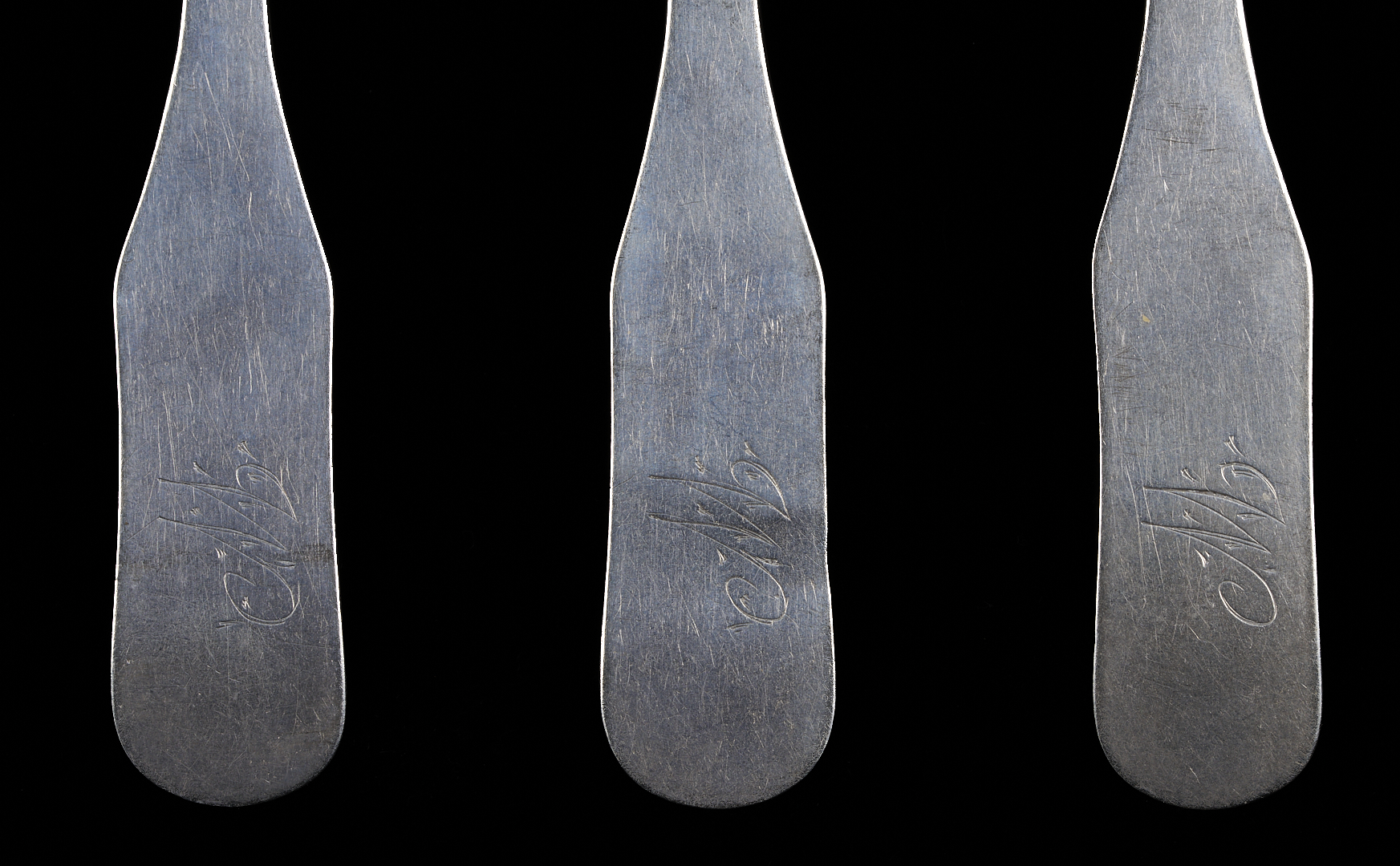 All with M script monogram to the handle, light surface scratching, and pitting to the bowls.