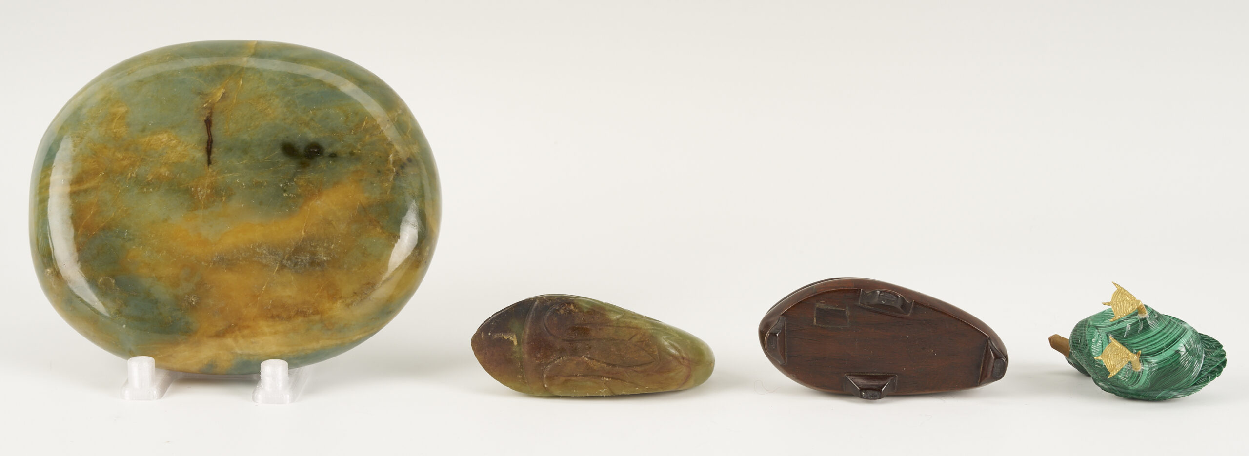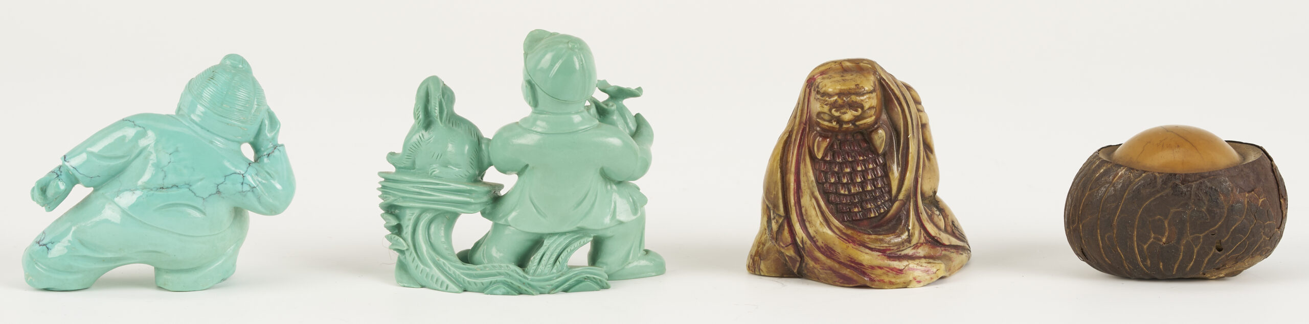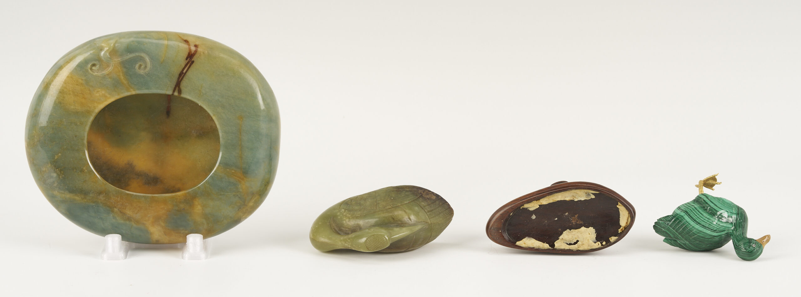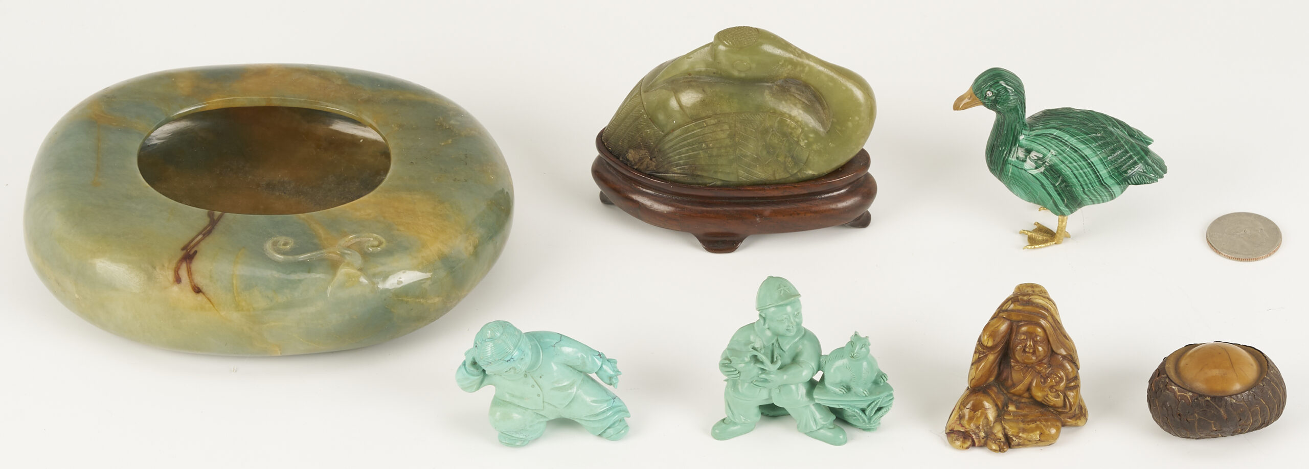 Seven (7) Asian carved items including one (1) celadon hardstone brush washer; one (1) celadon hardstone carved preening duck on a conforming wood stand; two (2) carved turquoise boy figures; one (1) carved vegetable ivory double-faced figural netsuke; one (1) carved vegetable ivory nut netsuke; and one (1) carved green malachite duck with gilt metal feet and applied eyes resembling diamond chips. All 20th century.