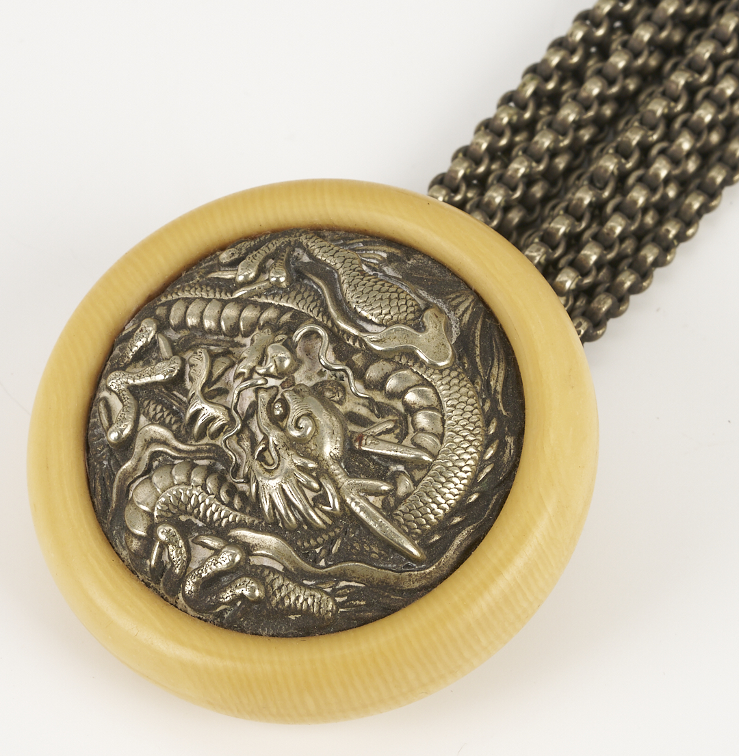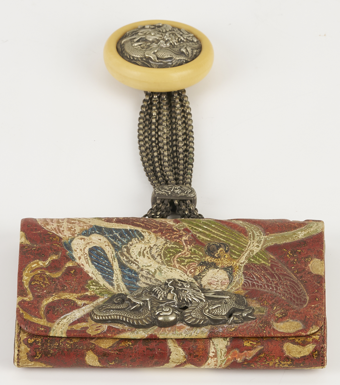 Five (5) Asian items, including one (1) mottled green and white jade snuff bottle; one (1) smoky gray jade or hardstone snuff bottle; and three (3) reverse-painted snuff bottles—one (1) large, tall, square tapered form with battle scene; one (1) round with figure in landscape; and one (1) ovoid with flowers and butterflies—together with a polychrome leather tobacco pouch having an unmarked repousse silver clasp decorated with dragons. Pouch: 6 in. x 3 1/2 in. Tallest bottle: 4 5/8 in. H. All items early to mid–20th century.