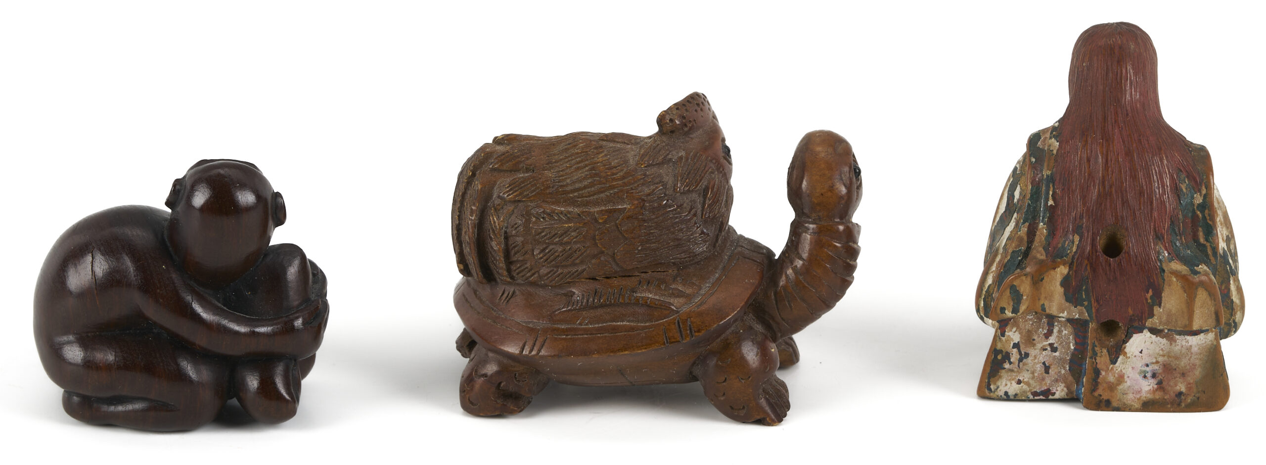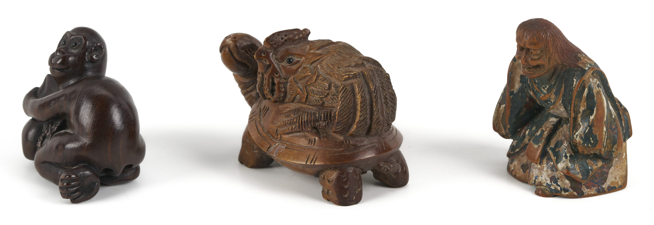 1st-6th items: Six (6) small Asian carved figural Netsukes, including 1 Tagua nut dog with stand; 1 signed hardwood turtle with chicken on its back; 1 jade crouching temple dog; 1 hardwood monkey clutching fruit on a branch; 1 bone seahorse; and 1 kneeling warrior with partial polychrome paint. Items range from 1/2 in. H to 2 in. H. All 20th century.7th-11th items: 5 Assorted Asian Decorative Arts objects. 7th item: Japanese painted bronze rooster head cane handle topper, 2 1/4 in. H. 8th and 9th items: Two blue and white porcelain snuff bottles, signed to base. 10th item: Chinese Blue and White double brush holder with landscape decoration, signed to underside. 4 in. H x 5 in. W x 2 3/4 in. D. 11th item: Japanese square cloisonne trinket box, depicting bijin in outdoor settings. Signed to underside. 3 in. H x 2 in. square. All items late 19th to mid 20th century.