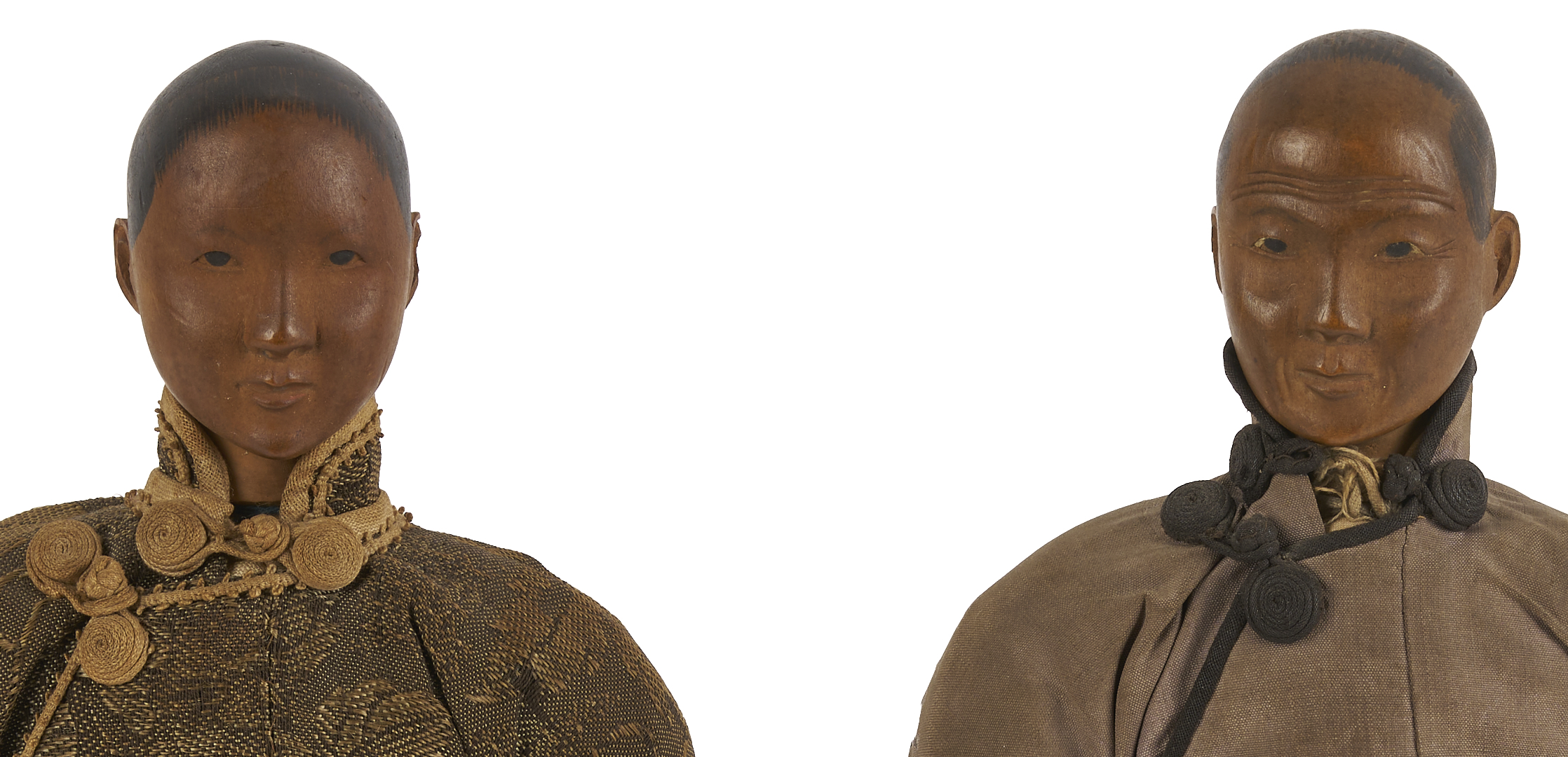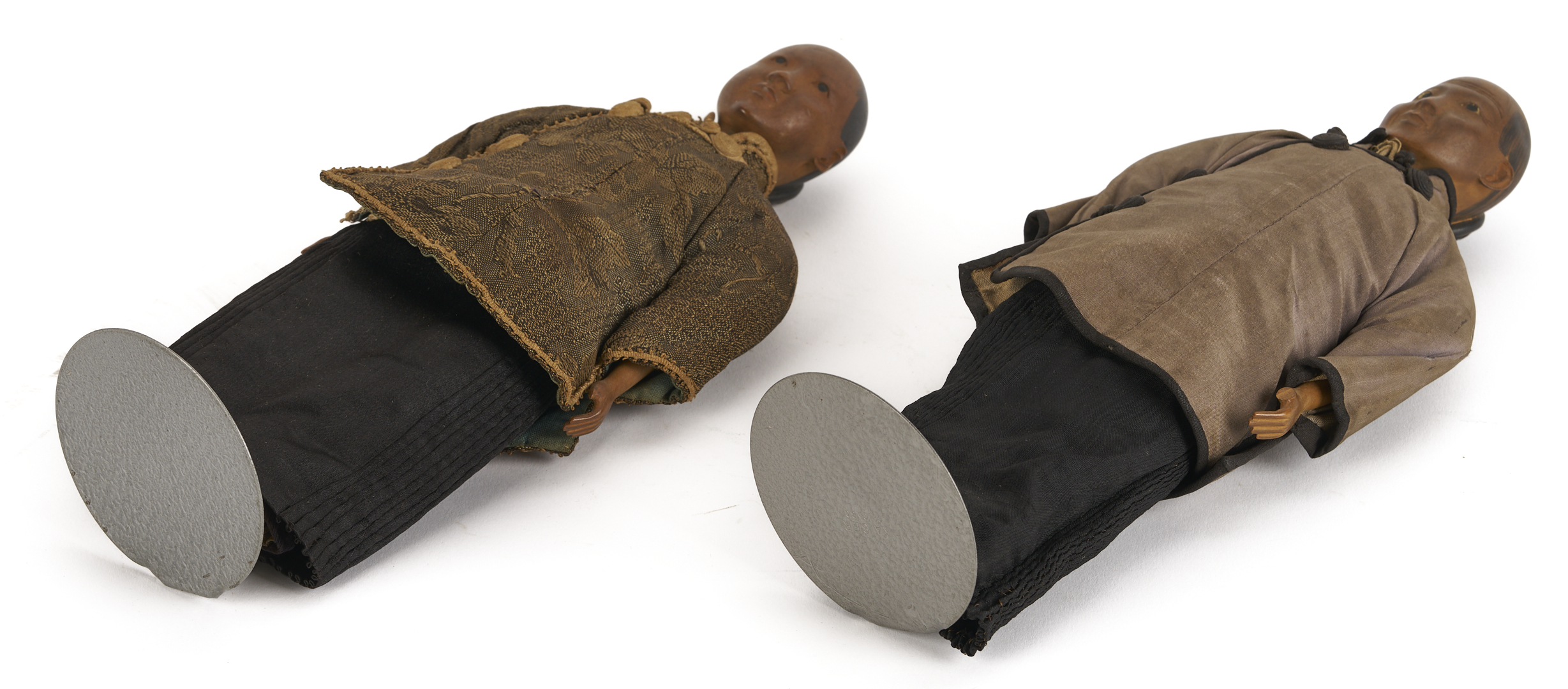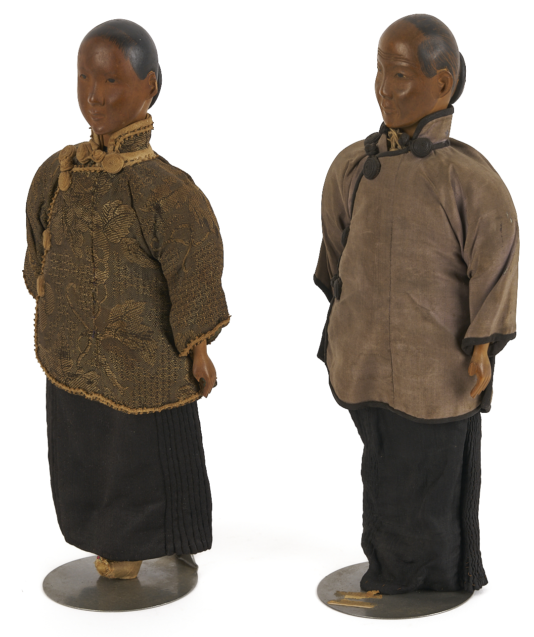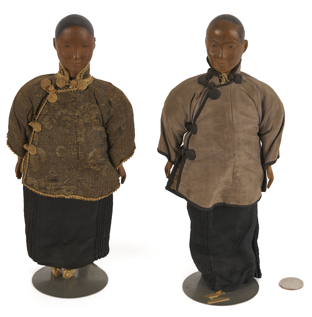 Pair of two (2) Chinese “Door of Hope” Mission Dolls, each with finely detailed carved heads and hands, handmade traditional silk coats and skirts, and pointed silk shoes, supported on detachable metal stands. Each approximately 11 in. H. Circa 1930s-40s. Note: the Door of Hope Mission opened in Shanghai in 1901 as a Protestant Mission to shelter, educate and teach life skills to Chinese girls. These girls were taught to dress the Door of Hope Mission dolls. In the process they learned to appreciate and be proud of their Chinese heritage, as the dolls’ clothing was designed to reflect the traditional costumes of the Chinese people, and the doll heads and hands were carved of pear wood by local carvers. The manufacture and sale of these dolls helped support the girls and fund the mission. When Chinese communists came into power in 1949, the Door of Hope Mission moved to Taipei and doll production declined. (Source: Dolls Magazine, May 1, 2007).