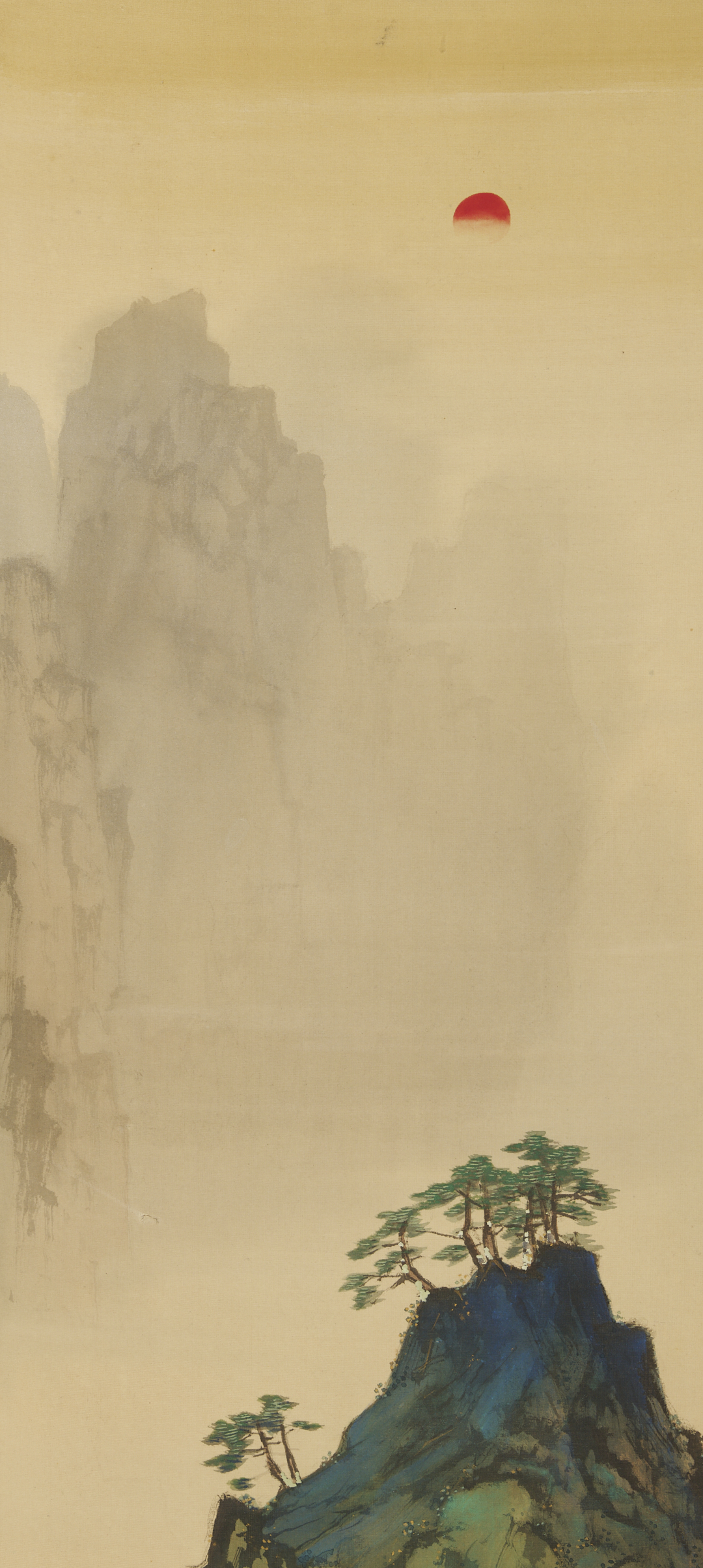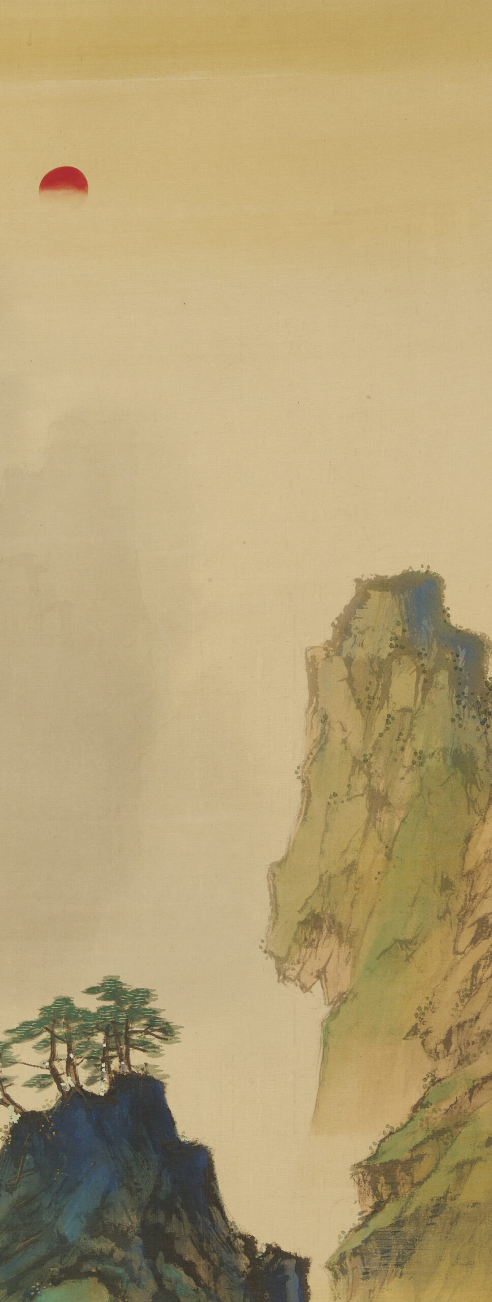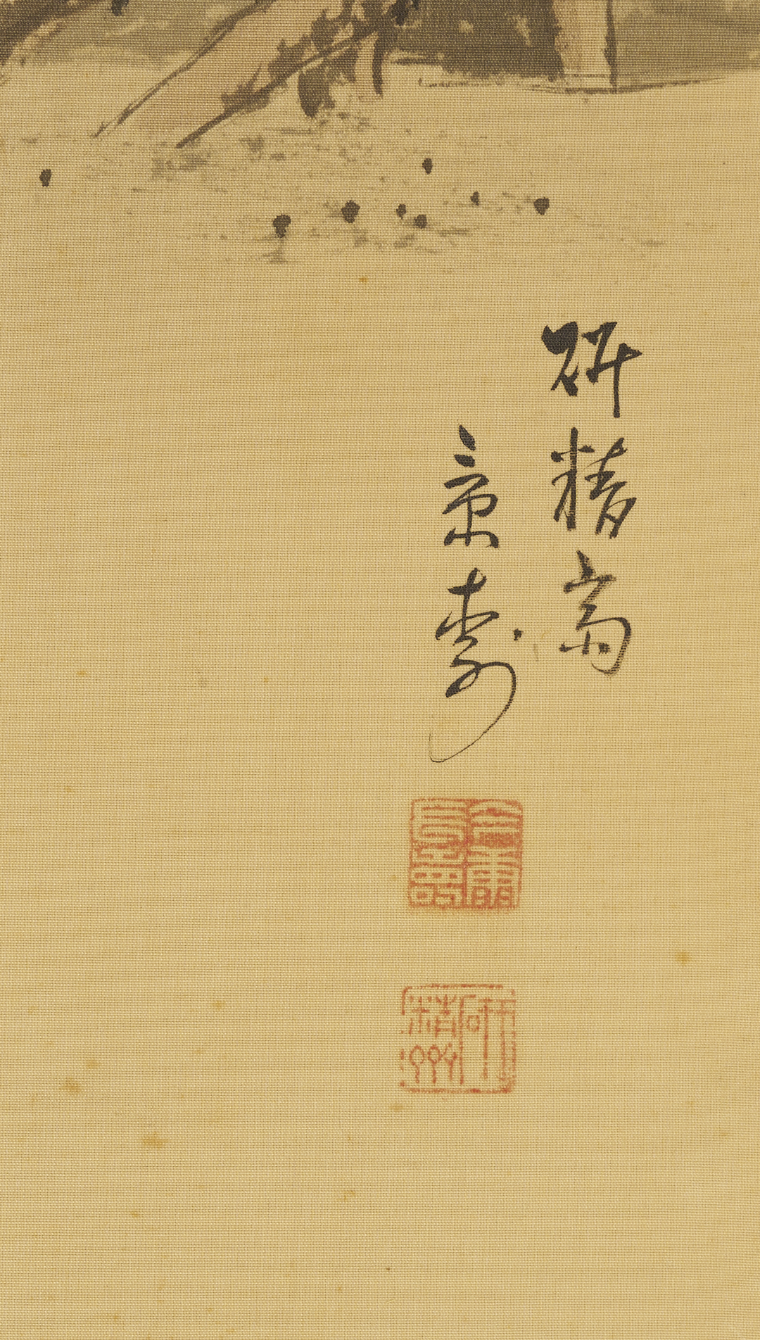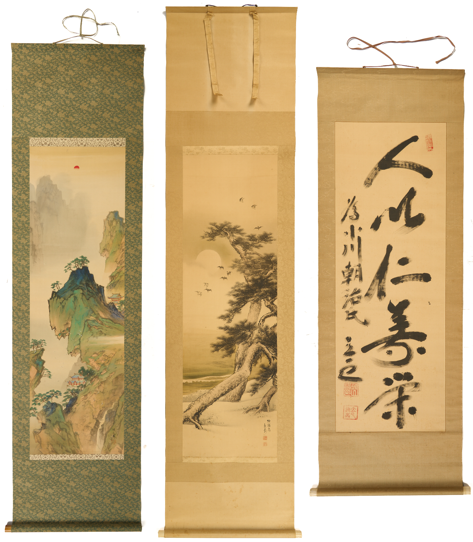 1st item: Ink and color on silk Chinese landscape scroll painting with buildings nestled within mountains and birds soaring throughout, late 19th/early 20th c. Mountains are described with long hemp fiber and axe-cut brush strokes typical of period. Inscription and seal to lower right. Housed in wooden box with calligraphic inscription. Image: 46 3/4 in. H x 14 1/2 in. W. Scroll: 73 1/4 in. H x 19 3/4 in. W. Box: 2 3/4 in. H x 22 3/4 in. W x 3 in. D. Chinese, Late 19th/Early 20th century. 2nd item: Ink and color on silk Chinese landscape scroll painting with a pine tree by the ocean, full moon, and a flock of birds, 20th c. Inscribed lower right, with two red seals. Label with text affixed to backing. Housed in a wooden box. Image: 46 in. H x 14 1/4 in. W. Scroll: 80 in. H x 19 5/8 in. W. Box: 2 3/4 in. H x 22 3/4 in. W x 3 in. D. 3rd item: Ink on paper Chinese calligraphy scroll painting with three red seals, 20th c.. Additional seal with inscription en verso. Image: 46 1/8 in. H x 14 1/2 in. W. Scroll: 63 1/2 in. H x 21 3/4 in. W.
