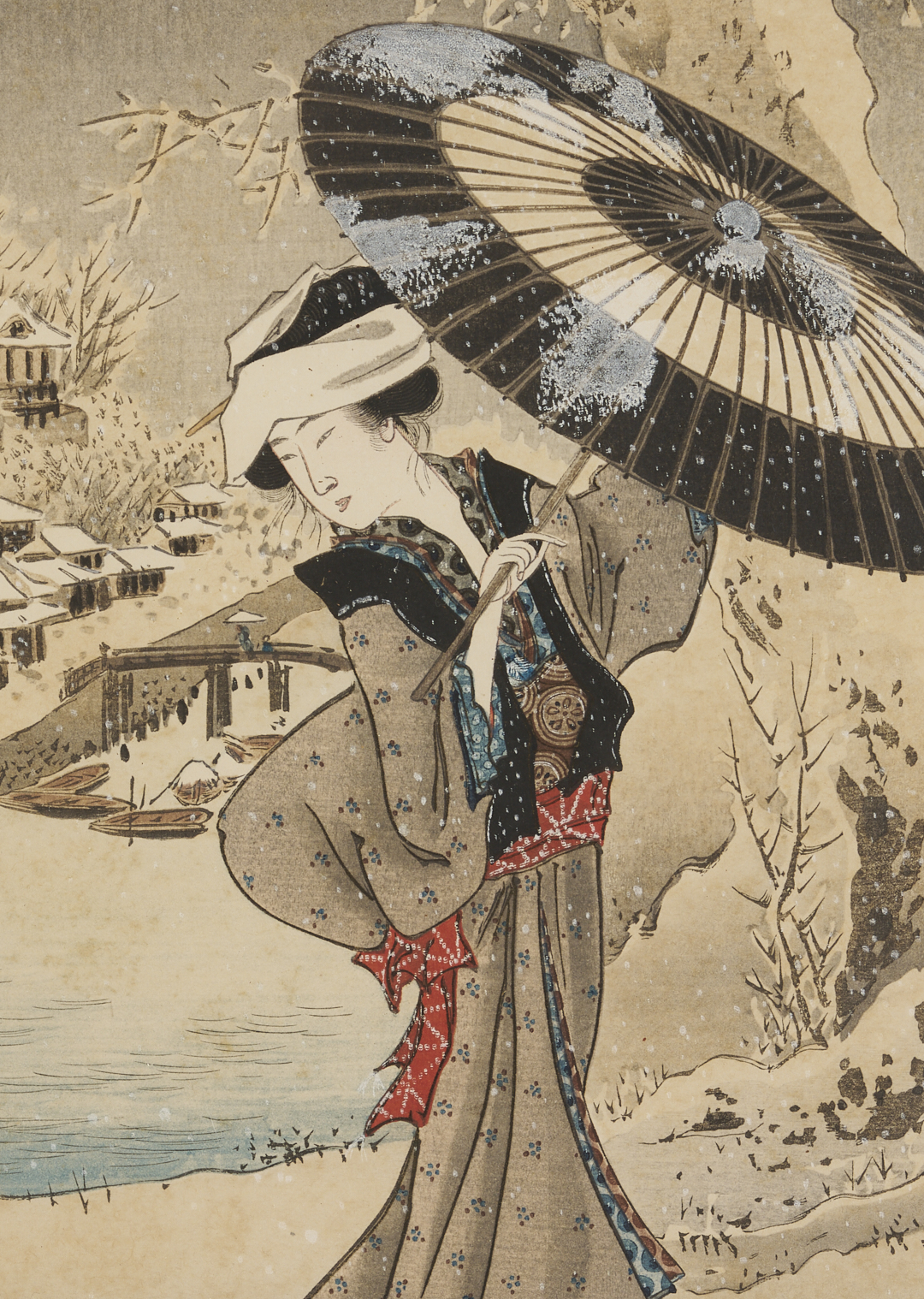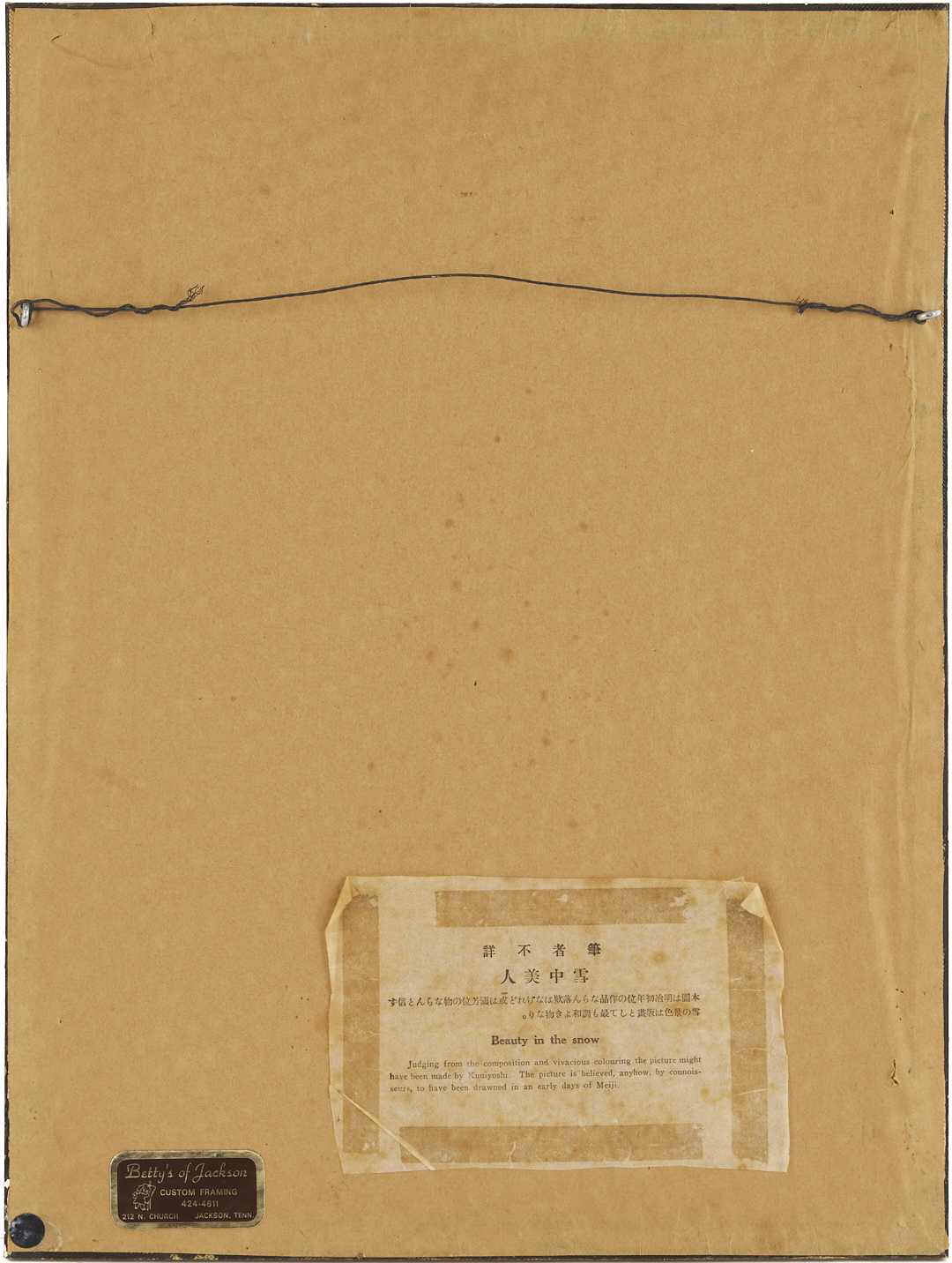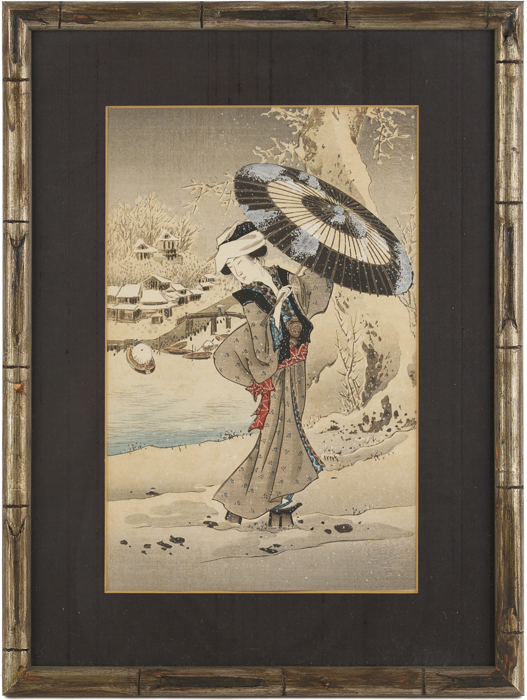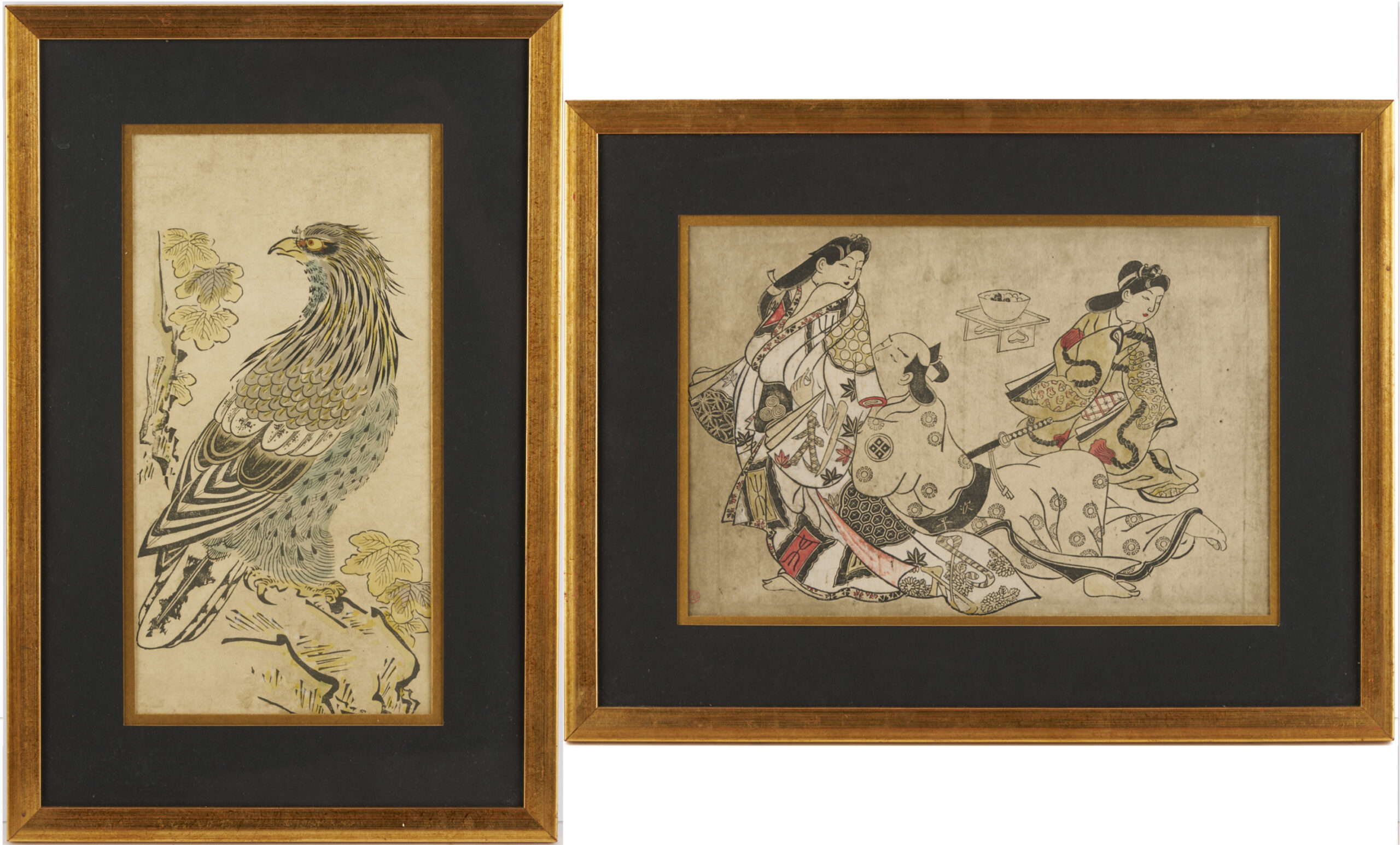 1st item: Mitsui Atsuo (Japan, 1900-2000) shin hanga color woodblock print, “Kawarasaki Gonjuro,” 1957, possibly a later printing. The actor Kawarasaki Gonjuro III holds an inro, with passages of embossing throughout. From the series Figures on the Stage (Butai sugata). Housed in a decorative window mat. Sight: 13 1/2 in. H x 9 7/8 in. W. Mat: 19 1/4 in. H x 15 in. W. 2nd item: Unknown artist, possibly Kitagawa Fujimaro (Japan, 1790-1850) or after Utagawa Kuniyoshi (Japan, 1797-1861) bijin-ga color woodblock print that depicts a woman in a snowy landscape, with a body of water and village beyond, early 20th century. Housed under glass in a silvered wood frame with black textile mat. Sight: 11 3/4 in. H x 7 5/8 in. W. Framed: 17 1/8 in. H x 12 7/8 in. W. 3rd-4th items: Two (2) framed facsimiles of early Japanese woodblock prints: “A Hawk on a Cliff near a Kiri Tree,” after Torii Kiyomasu I (Japan, fl. 1704-18), c. 1718, and “The Insistent Lover,” Sugimura Jihei (Japan, fl. 1681-1698), c. 1684/98, from an untitled series of erotic prints. Both from the 1955 portfolio “12 Woodcuts, The Clarence Buckingham Collection of Japanese Prints,” issued to accompany Helen Gunsaulus, THE CLARENCE BUCKINGHAM COLLECTION OF JAPANESE PRINTS (Chicago: The Art Institute of Chicago, 1955), itself published in a limited edition of 500 copies. Both housed under glass in giltwood frames with black mats and gold reveals. “A Hawk…” Sight: 12 1/2 in. H x 6 7/16 in. W. “A Hawk…” Framed: 18 1/4 in. H x 12 in. W. “Insistent Lover” sight: 8 3/8 in. H x 12 3/4 in. W. “Insistent Lover” framed: 14 in. H x 18 1/4 in. W.