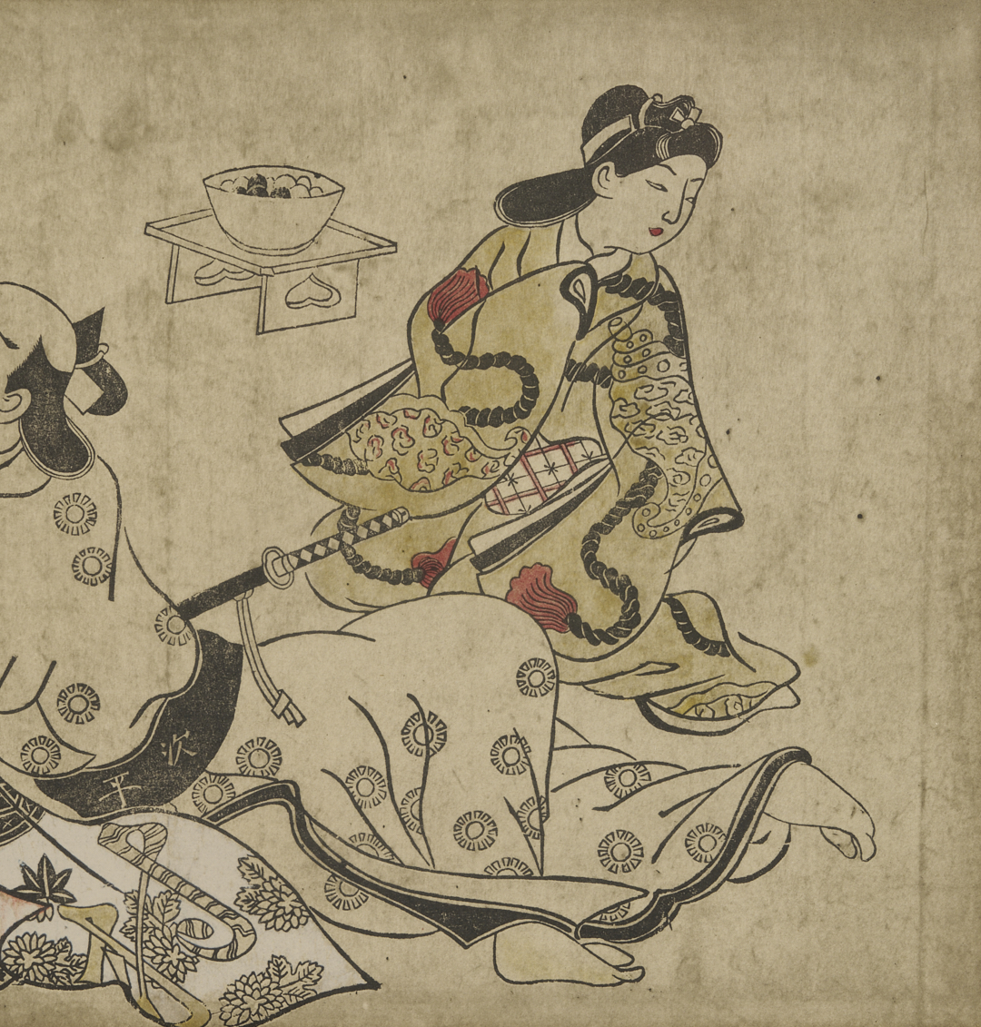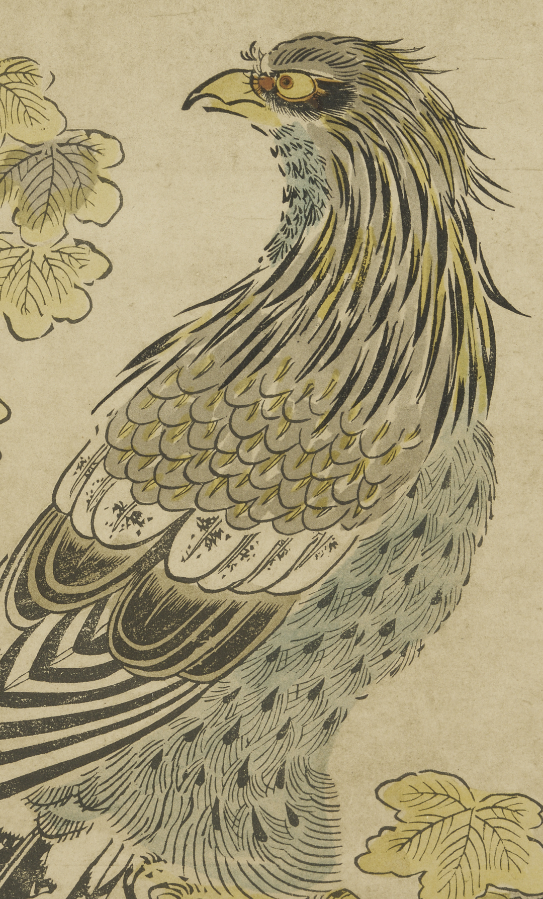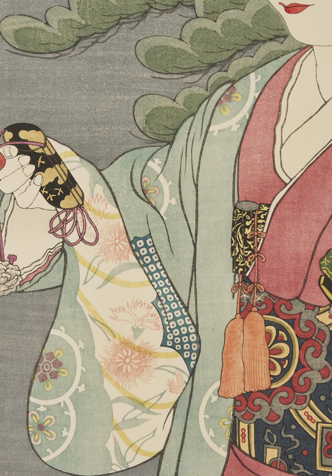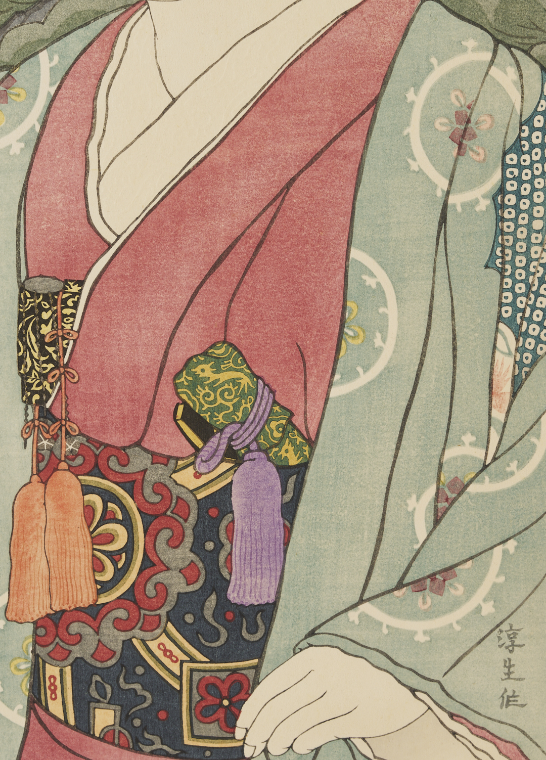 1st item: Mitsui Atsuo (Japan, 1900-2000) shin hanga color woodblock print, “Kawarasaki Gonjuro,” 1957, possibly a later printing. The actor Kawarasaki Gonjuro III holds an inro, with passages of embossing throughout. From the series Figures on the Stage (Butai sugata). Housed in a decorative window mat. Sight: 13 1/2 in. H x 9 7/8 in. W. Mat: 19 1/4 in. H x 15 in. W. 2nd item: Unknown artist, possibly Kitagawa Fujimaro (Japan, 1790-1850) or after Utagawa Kuniyoshi (Japan, 1797-1861) bijin-ga color woodblock print that depicts a woman in a snowy landscape, with a body of water and village beyond, early 20th century. Housed under glass in a silvered wood frame with black textile mat. Sight: 11 3/4 in. H x 7 5/8 in. W. Framed: 17 1/8 in. H x 12 7/8 in. W. 3rd-4th items: Two (2) framed facsimiles of early Japanese woodblock prints: “A Hawk on a Cliff near a Kiri Tree,” after Torii Kiyomasu I (Japan, fl. 1704-18), c. 1718, and “The Insistent Lover,” Sugimura Jihei (Japan, fl. 1681-1698), c. 1684/98, from an untitled series of erotic prints. Both from the 1955 portfolio “12 Woodcuts, The Clarence Buckingham Collection of Japanese Prints,” issued to accompany Helen Gunsaulus, THE CLARENCE BUCKINGHAM COLLECTION OF JAPANESE PRINTS (Chicago: The Art Institute of Chicago, 1955), itself published in a limited edition of 500 copies. Both housed under glass in giltwood frames with black mats and gold reveals. “A Hawk…” Sight: 12 1/2 in. H x 6 7/16 in. W. “A Hawk…” Framed: 18 1/4 in. H x 12 in. W. “Insistent Lover” sight: 8 3/8 in. H x 12 3/4 in. W. “Insistent Lover” framed: 14 in. H x 18 1/4 in. W.