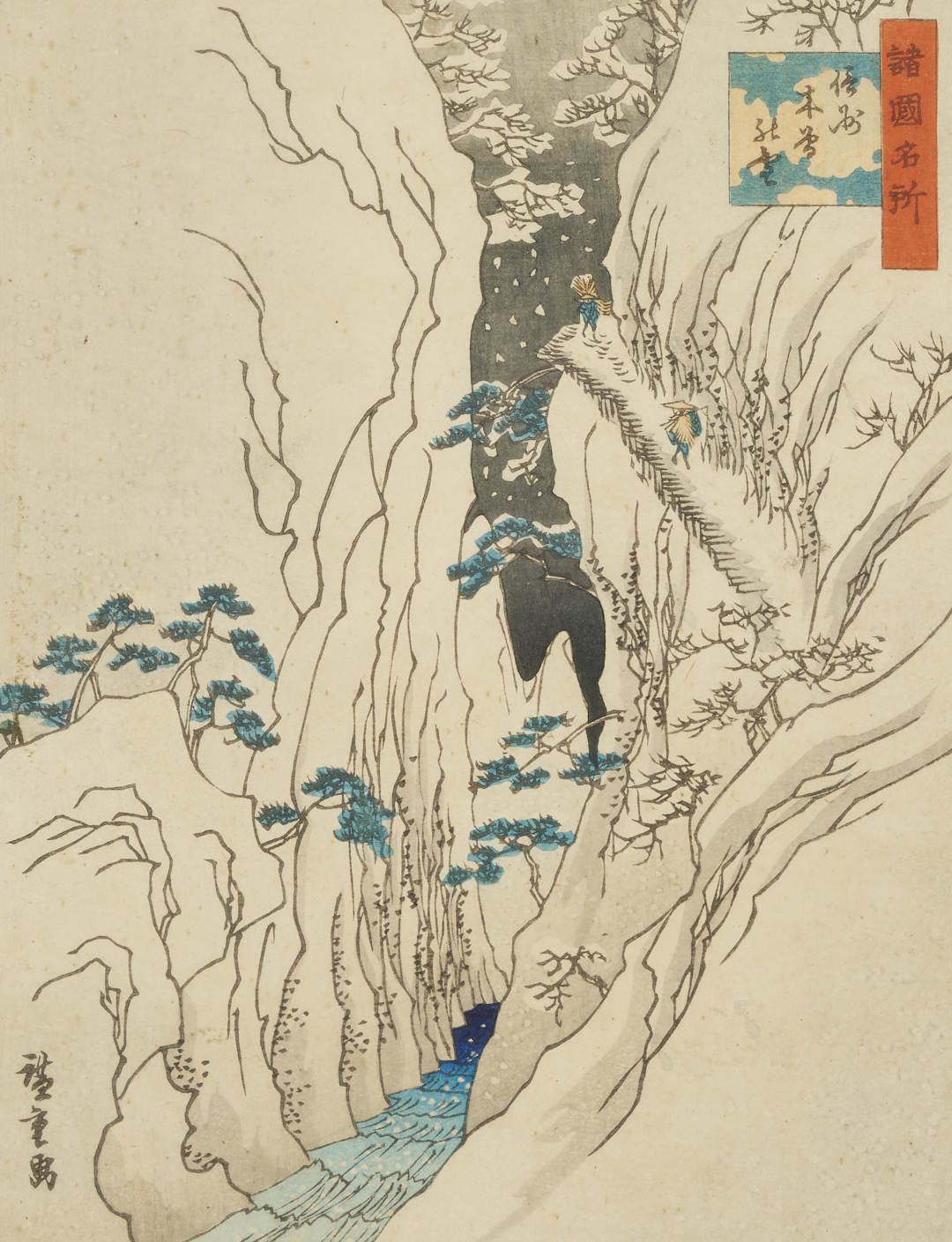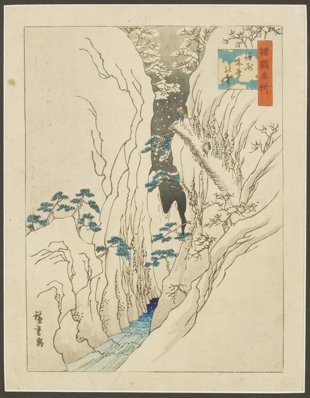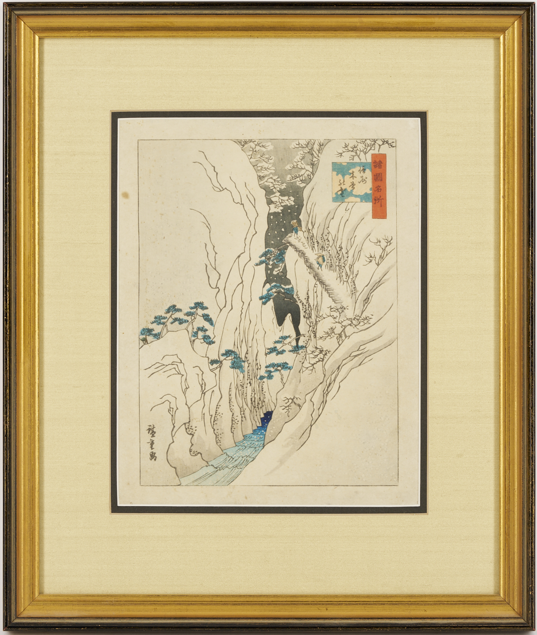 Item 1: Utagawa Hiroshige (Japan, 1797-1858) horizontal oban woodblock print entitled “Visiting the Fudo Temple in Meguro (Meguro Fudo mode)” from the series Famous Places in Edo, 1827-1839. Signed and sealed in the image, upper left, and titled to margin, upper right (under frame). With red feather-within-a-square stamp en verso, lower left, likely an unidentified collector’s mark. An envelope containing a note with artist and title information is taped to backing. Housed under glass in a gilt and ebonized wood frame with beige mat. Sheet: 9 7/16 in H x 14 5/16 in W. Frame: 17 1/4 in H x 21 1/2 in W. Item 2: Woodblock print in colors by unknown artist, after Utagawa Hiroshige II’s (Japan, 1826-1869) “Snow at Kiso in Shinano Province” from the series One Hundred Famous Views in Various Provinces, 1859. 19th or early 20th c. impression. Signed in the image, lower left, and titled upper right. Housed under glass in a gilt and ebonized wood frame with beige mat and black reveal. Sheet: 9 7/16 in H x 7 1/8 in W. Frame: 14 1/2 in H x 12 1/4 in W.