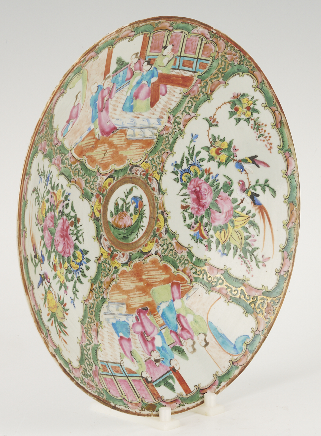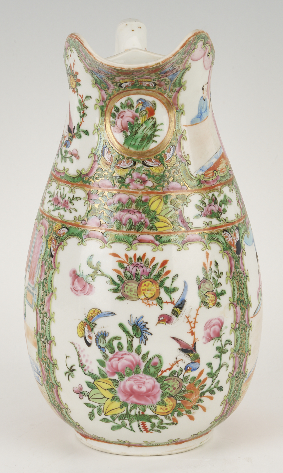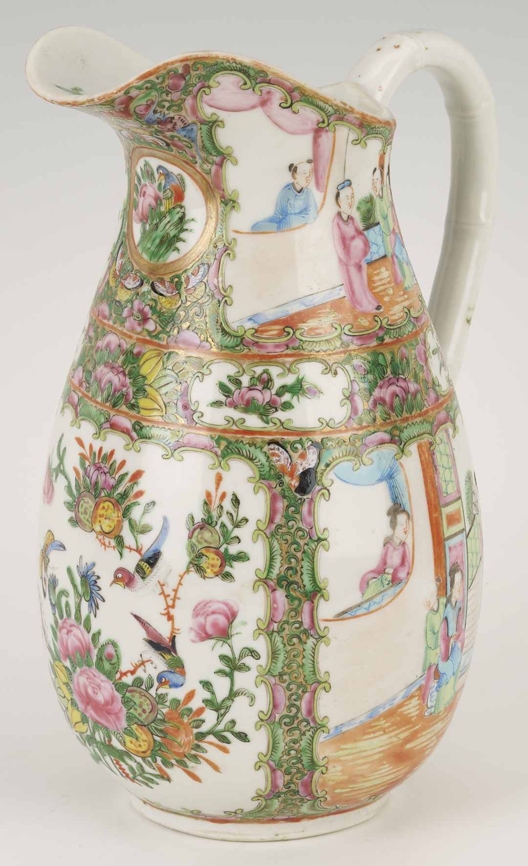 Three (3) Chinese Export Rose Medallion porcelain items, including a tall water pitcher with a bamboo handle, a round charger, and an oval platter, each decorated with alternating polychrome enamel vignettes of court and landscape scenes, with birds, insects, and flowers, with gilt highlights throughout. Pitcher: 12 7/8 in. H. Round charger: 13 1/2 in. dia. Oval platter: 12 3/4 in. H x 16 in. W. All pieces Late 19th century.