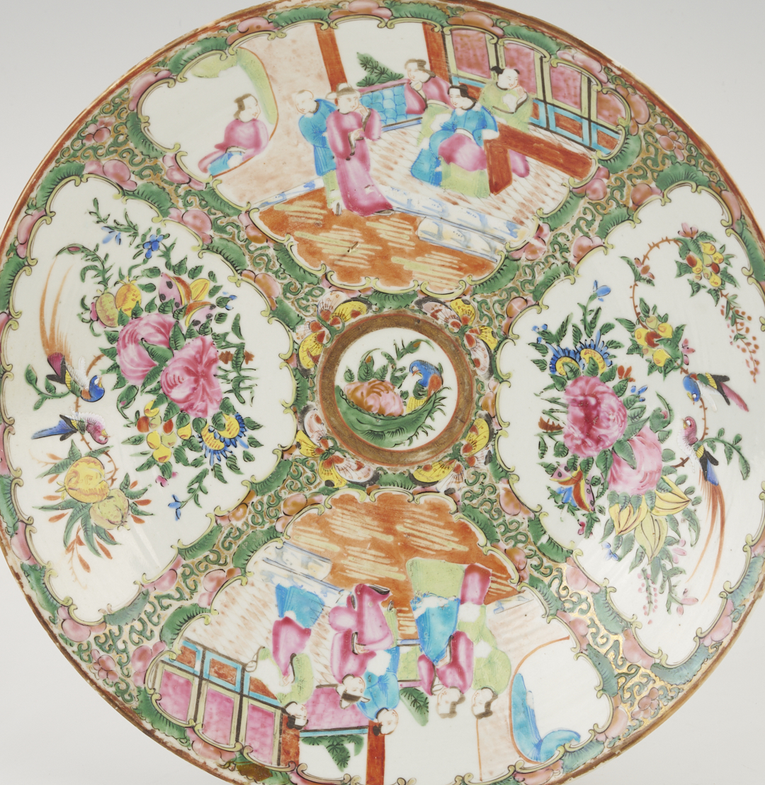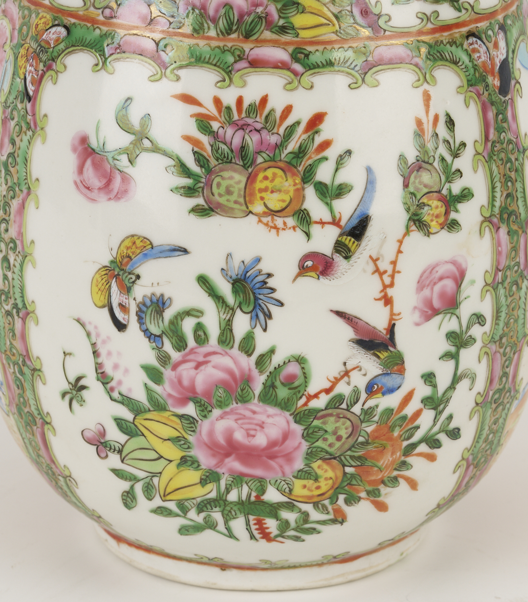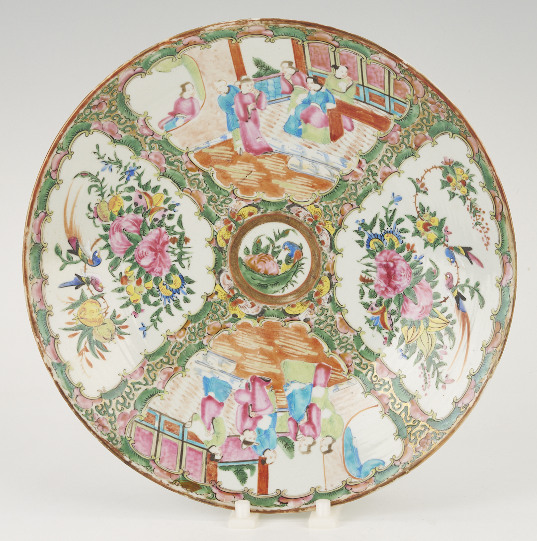 Three (3) Chinese Export Rose Medallion porcelain items, including a tall water pitcher with a bamboo handle, a round charger, and an oval platter, each decorated with alternating polychrome enamel vignettes of court and landscape scenes, with birds, insects, and flowers, with gilt highlights throughout. Pitcher: 12 7/8 in. H. Round charger: 13 1/2 in. dia. Oval platter: 12 3/4 in. H x 16 in. W. All pieces Late 19th century.