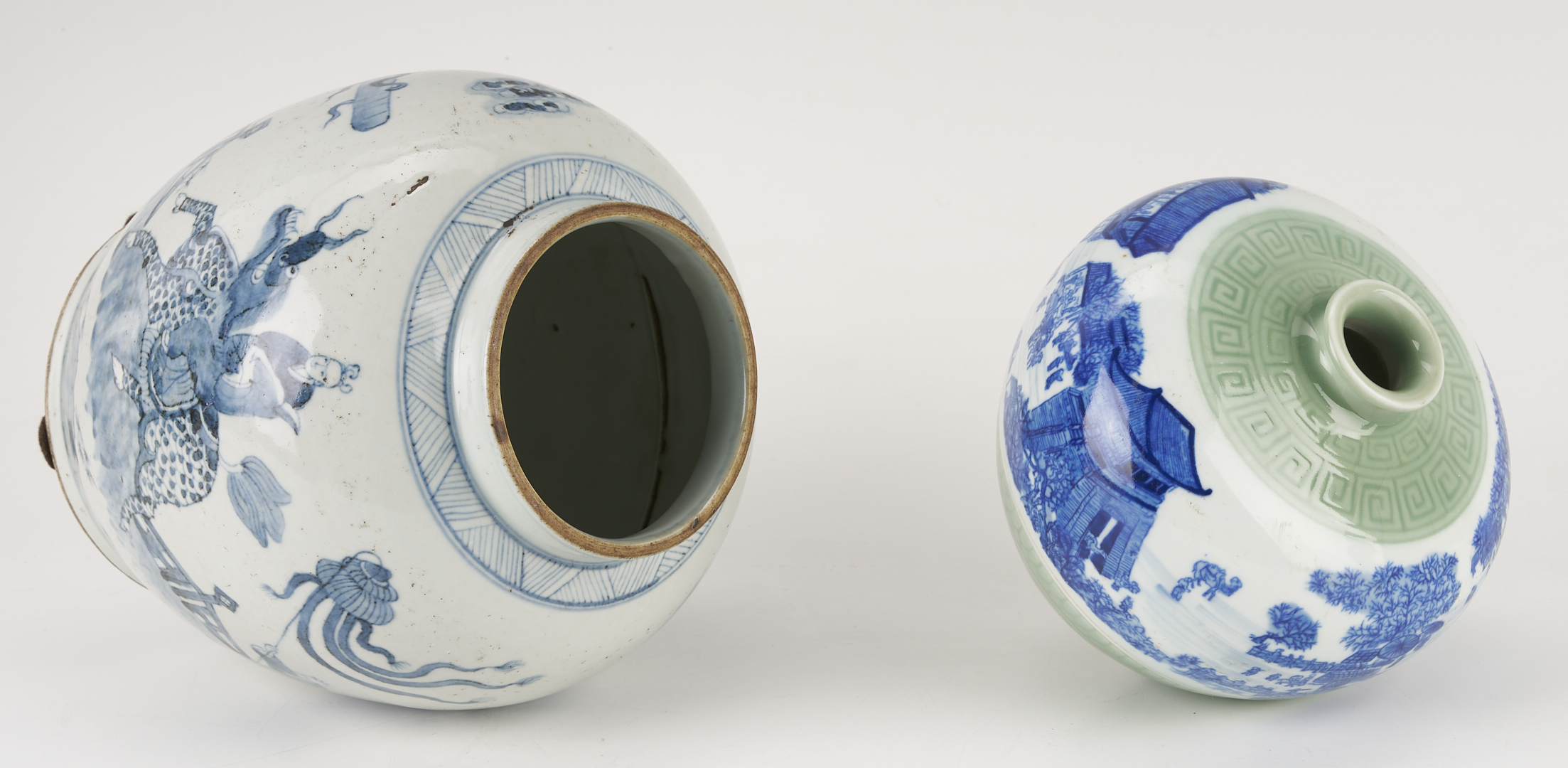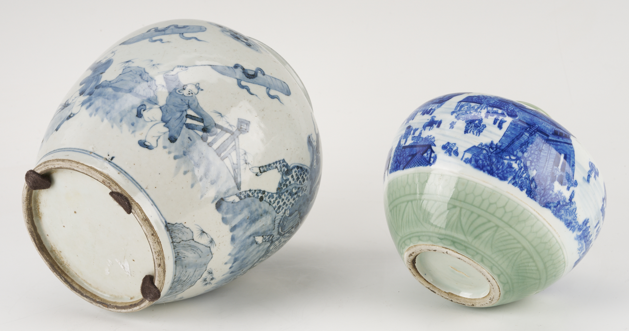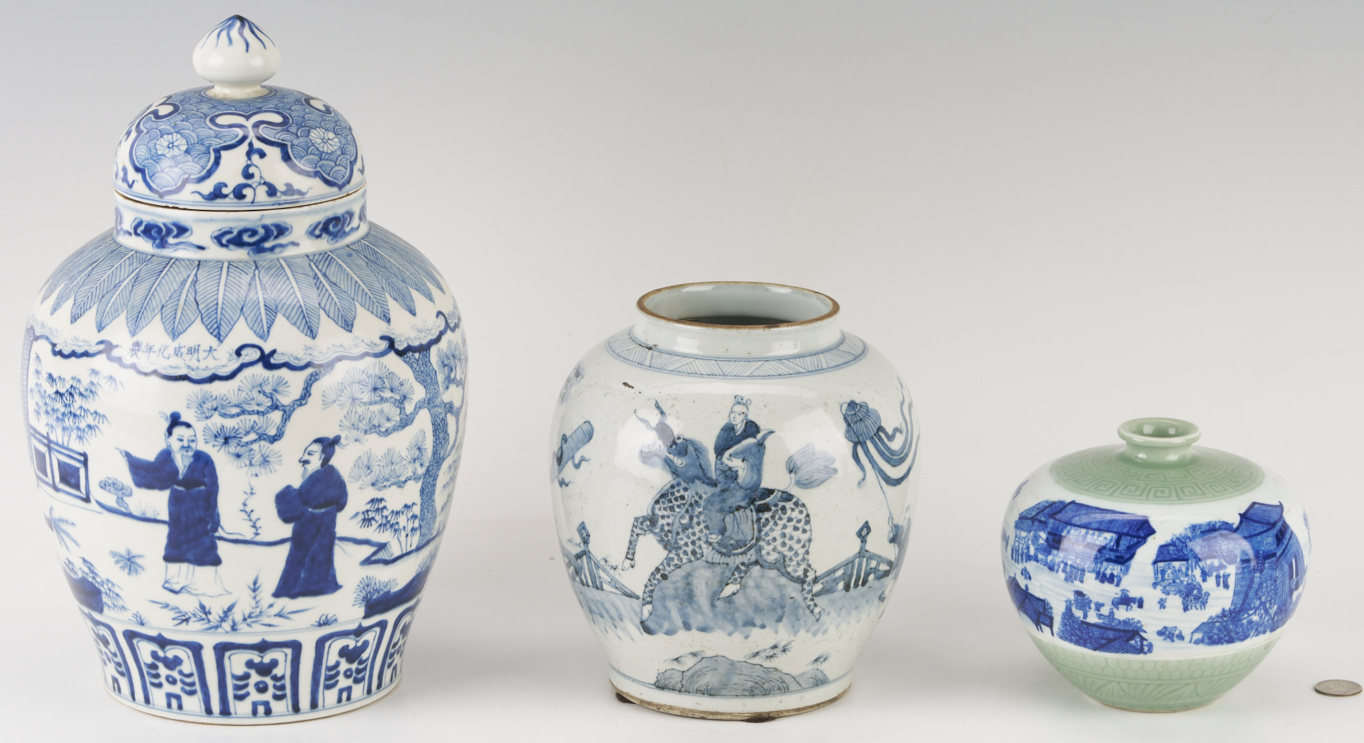 Three (3) Chinese blue and white porcelain items, including a lidded ginger jar depicting warriors and scholars in a landscape setting, a vase depicting a royal procession, and a small vase with blue and white figural decoration to the central body with carved celadon glazed designs around the top and base. Ranging in size from 5 1/4 in. H to 13 1/2 in. H. All Late 19th/Early 20th century.