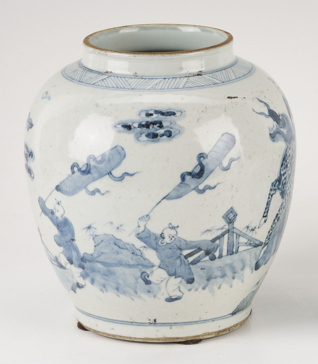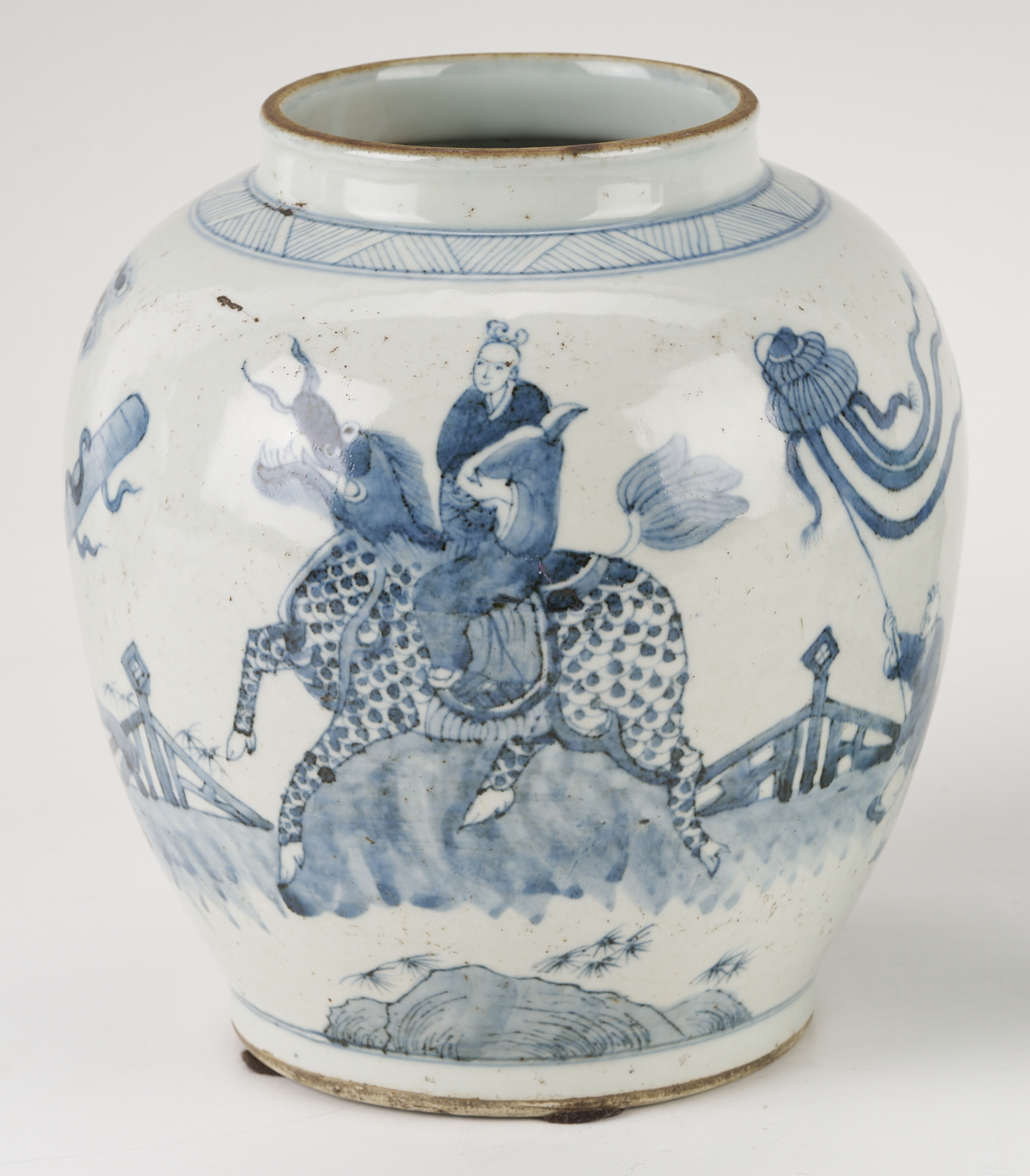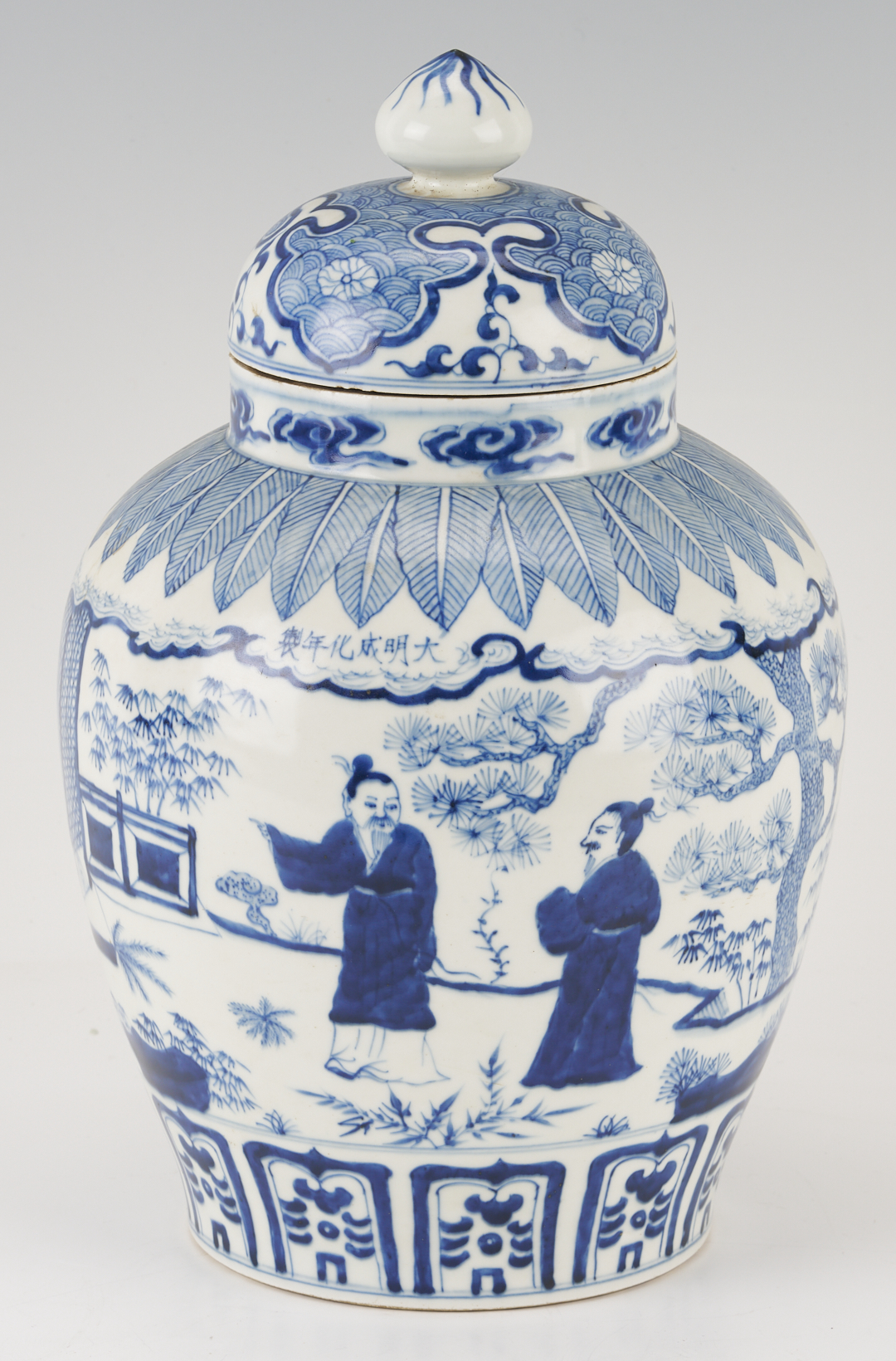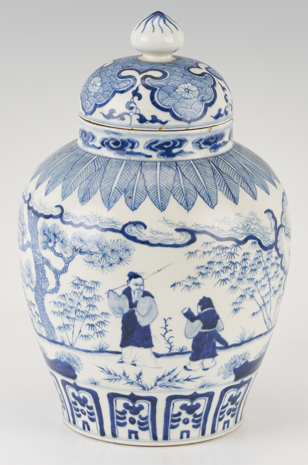 Three (3) Chinese blue and white porcelain items, including a lidded ginger jar depicting warriors and scholars in a landscape setting, a vase depicting a royal procession, and a small vase with blue and white figural decoration to the central body with carved celadon glazed designs around the top and base. Ranging in size from 5 1/4 in. H to 13 1/2 in. H. All Late 19th/Early 20th century.