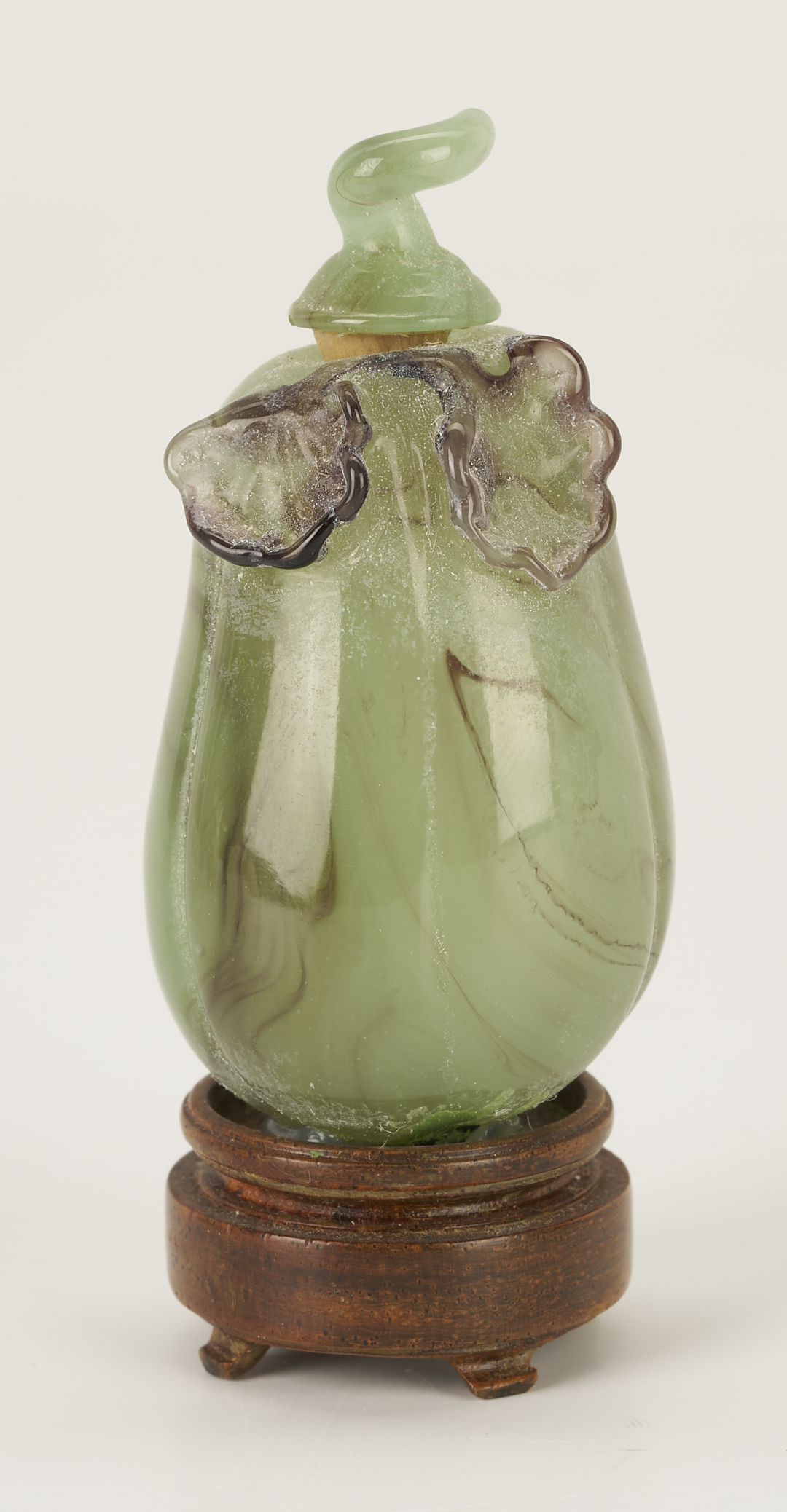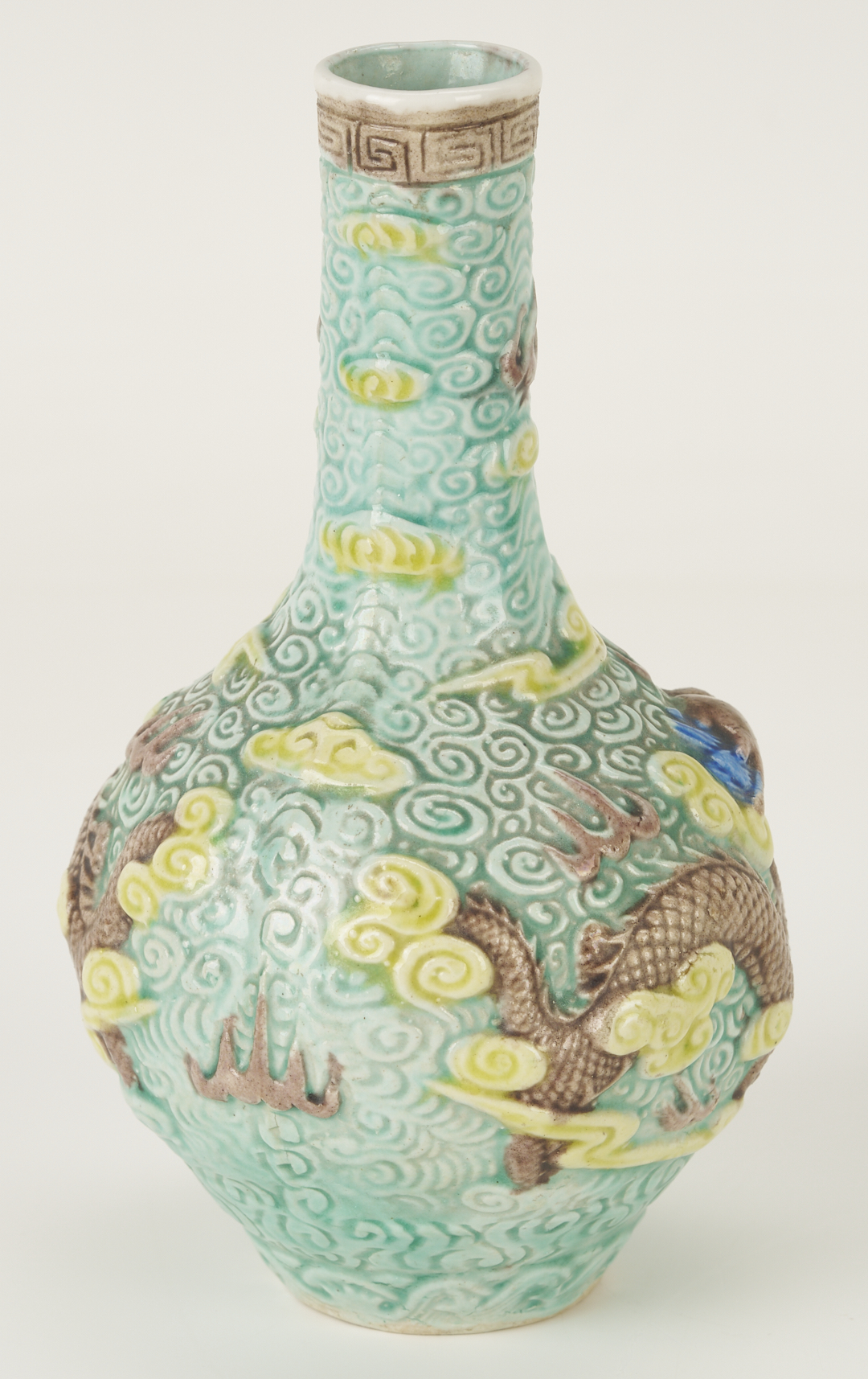 Chinese Export molded porcelain vase with dragon, pearl and cloud decoration, incised seal mark and CHINA to underside, 6 in. H, together with 2 painted porcelain and 1 fruit carved hardstone snuff bottles, 2 1/4 in. to 3 1/4 in. H. All items early to mid 20th century.