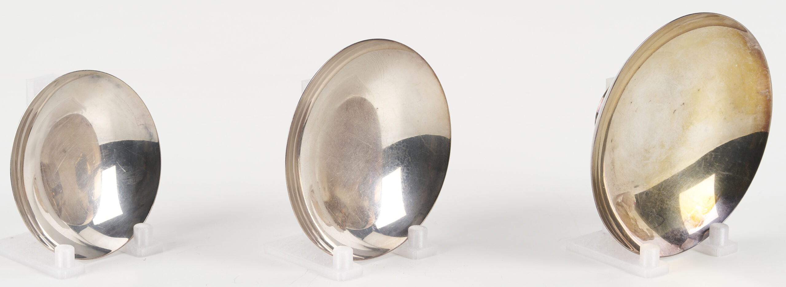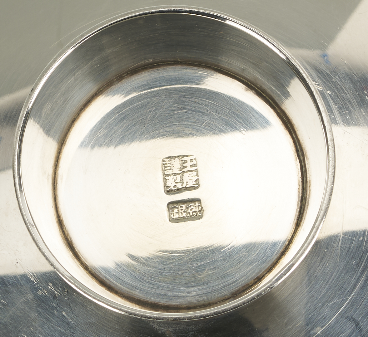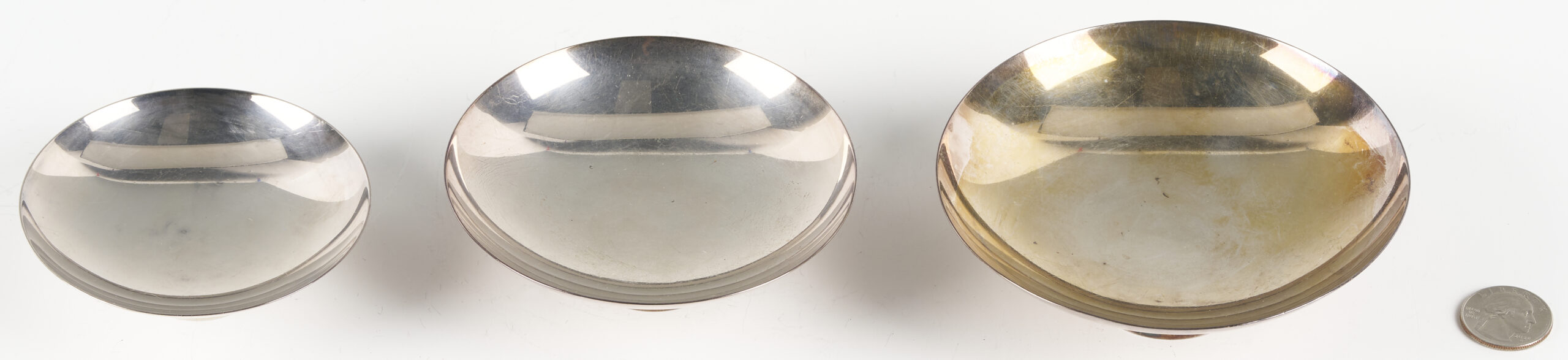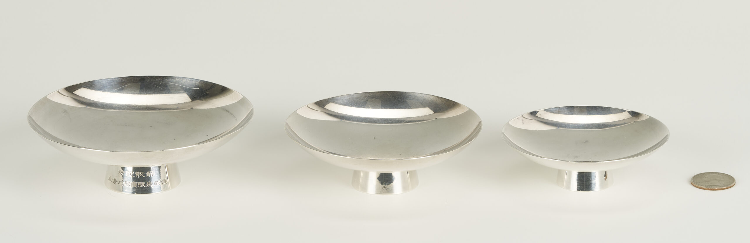 Set of 3 graduated Japanese silver sake bowls, each of circular form with pedestal foot, hallmarked with Jungin mark for pure silver (.950/1000 +), ranging from 3 1/2 to 4 3/4 in. diameter. Stacked: 2 1/2 in. H. Combined weight: 9.38 oz. Circa 1900.