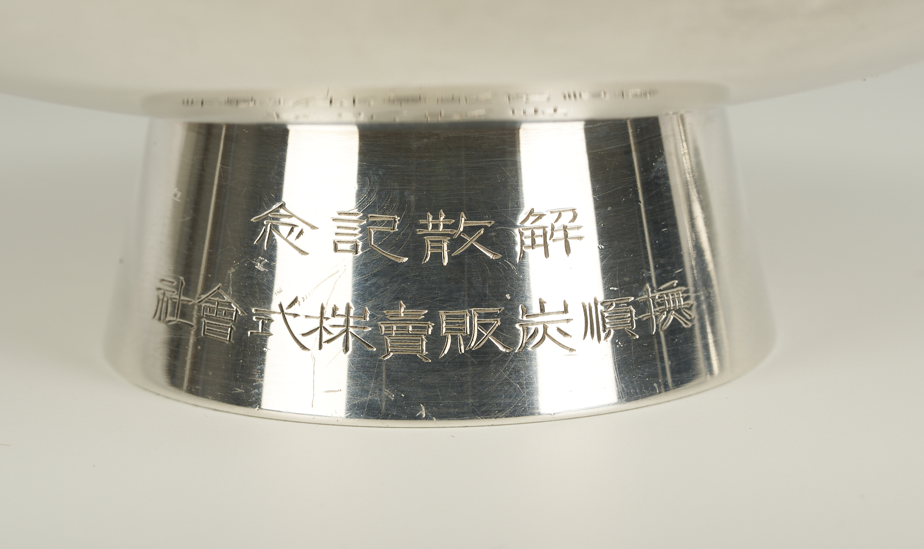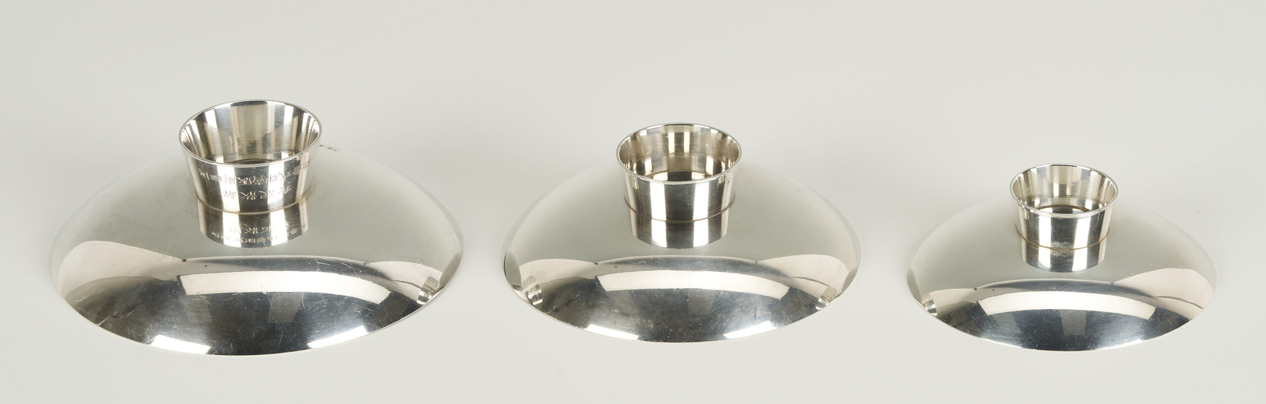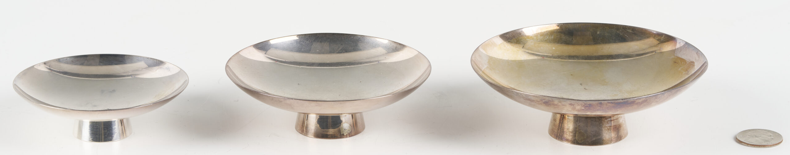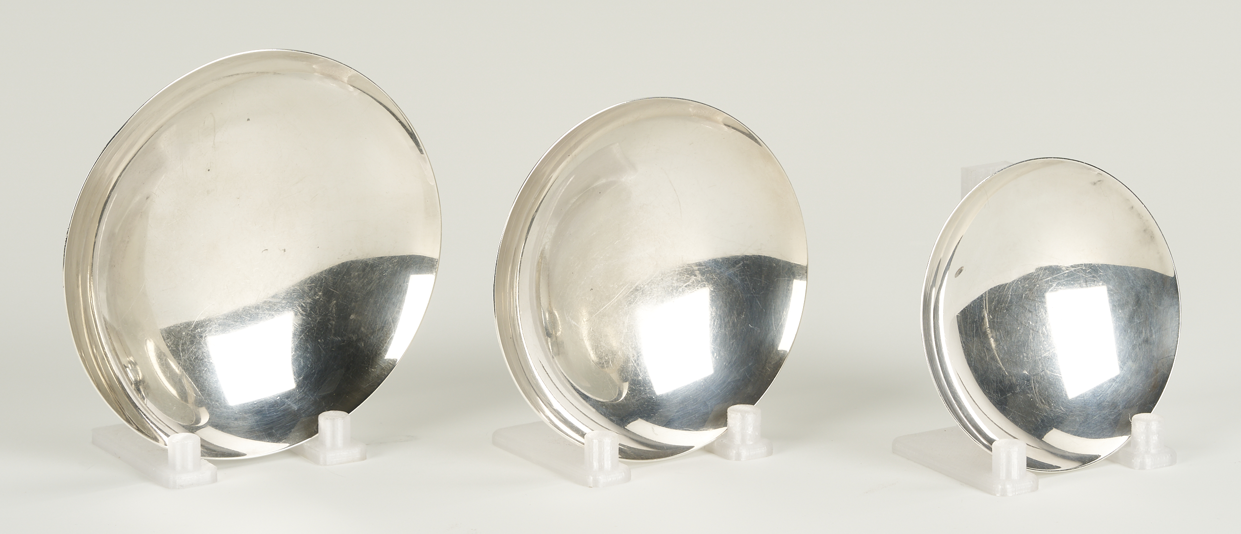 Set of 3 graduated Japanese silver sake bowls, each of circular form with pedestal foot, hallmarked with Jungin mark for pure silver (.950/1000 +), ranging from 3 1/2 to 4 3/4 in. diameter. Stacked: 2 1/2 in. H. Combined weight: 9.38 oz. Circa 1900.