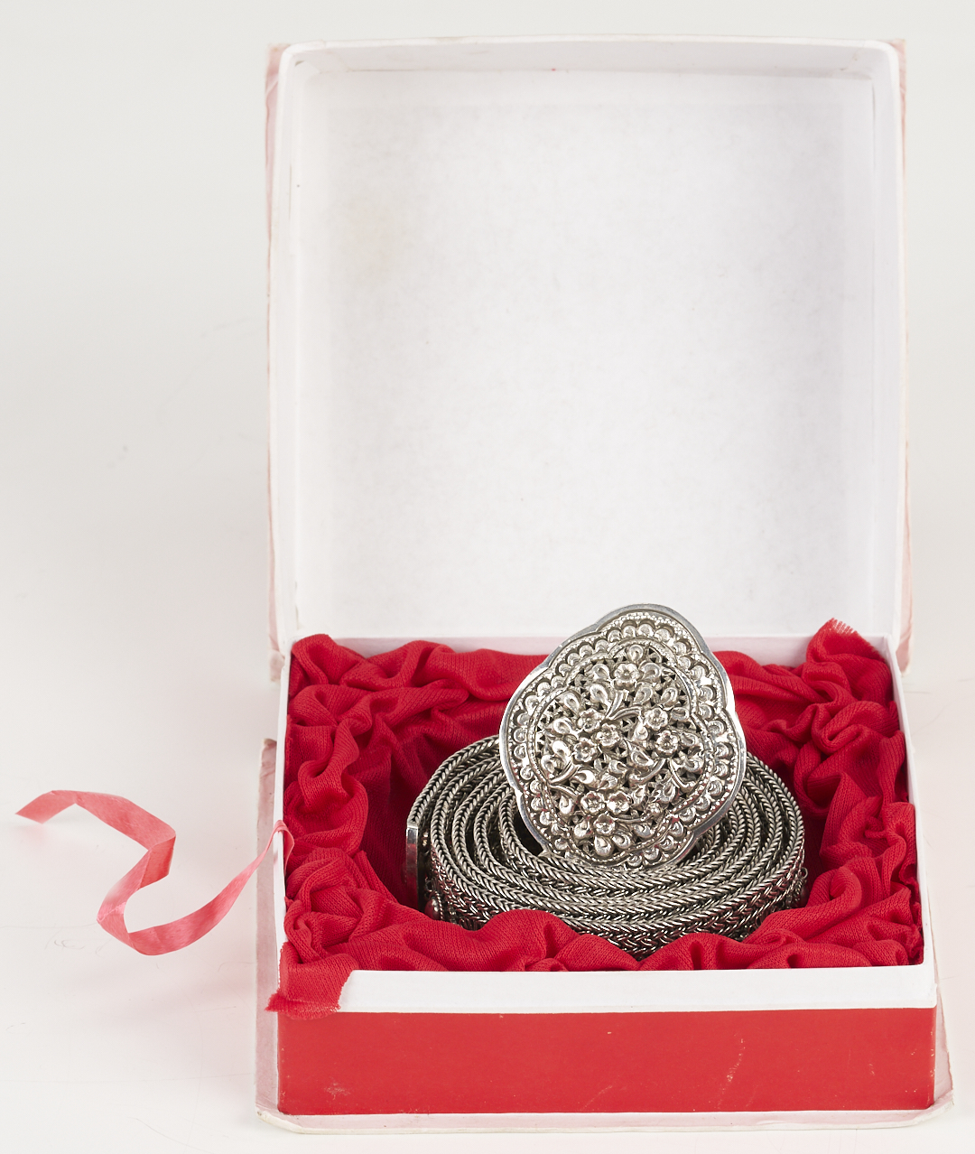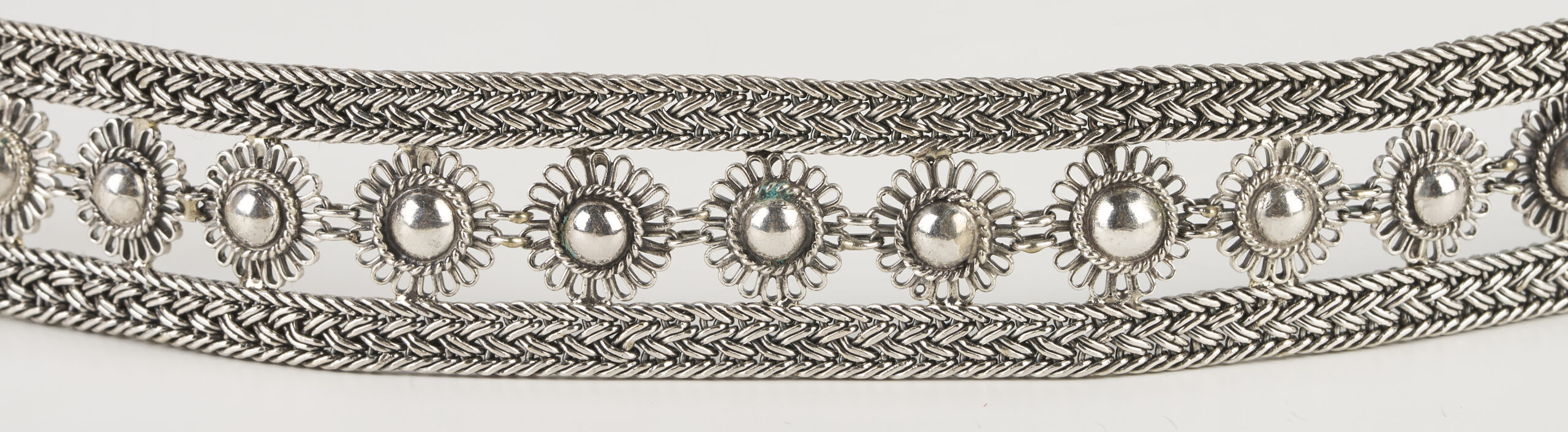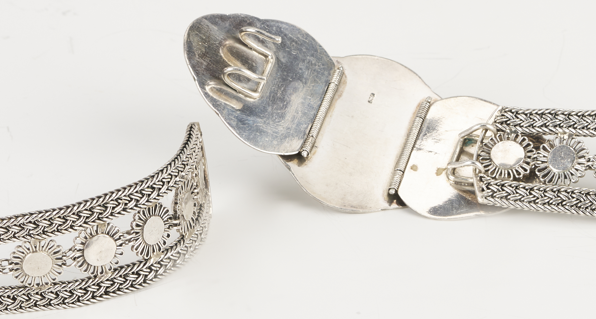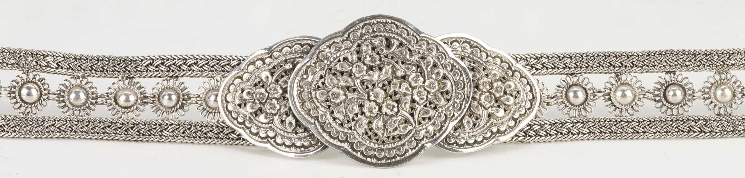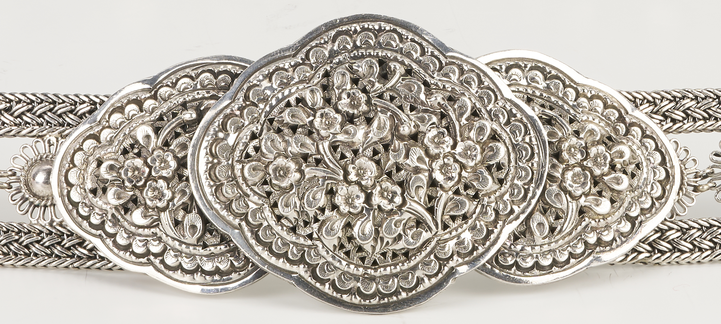 Southeast Asian sterling silver belt featuring braided edges with repeating center sun motifs and a pierced and floral repousse buckle stamped 925. Belt width 33 in. Buckle 4 in. W x 2 in. H. Original red fabric lined box. 9.86 oz troy. Mid 20th century.