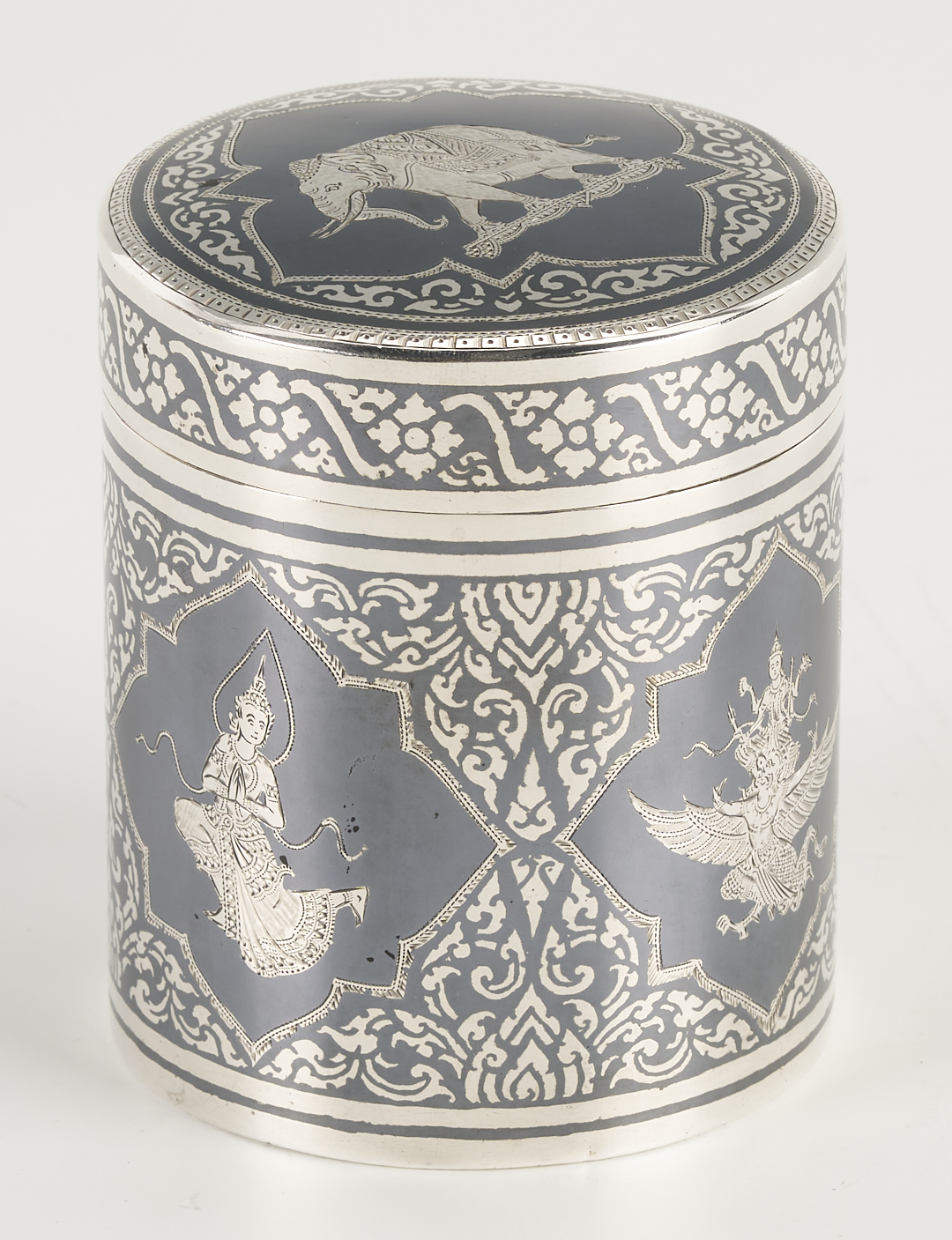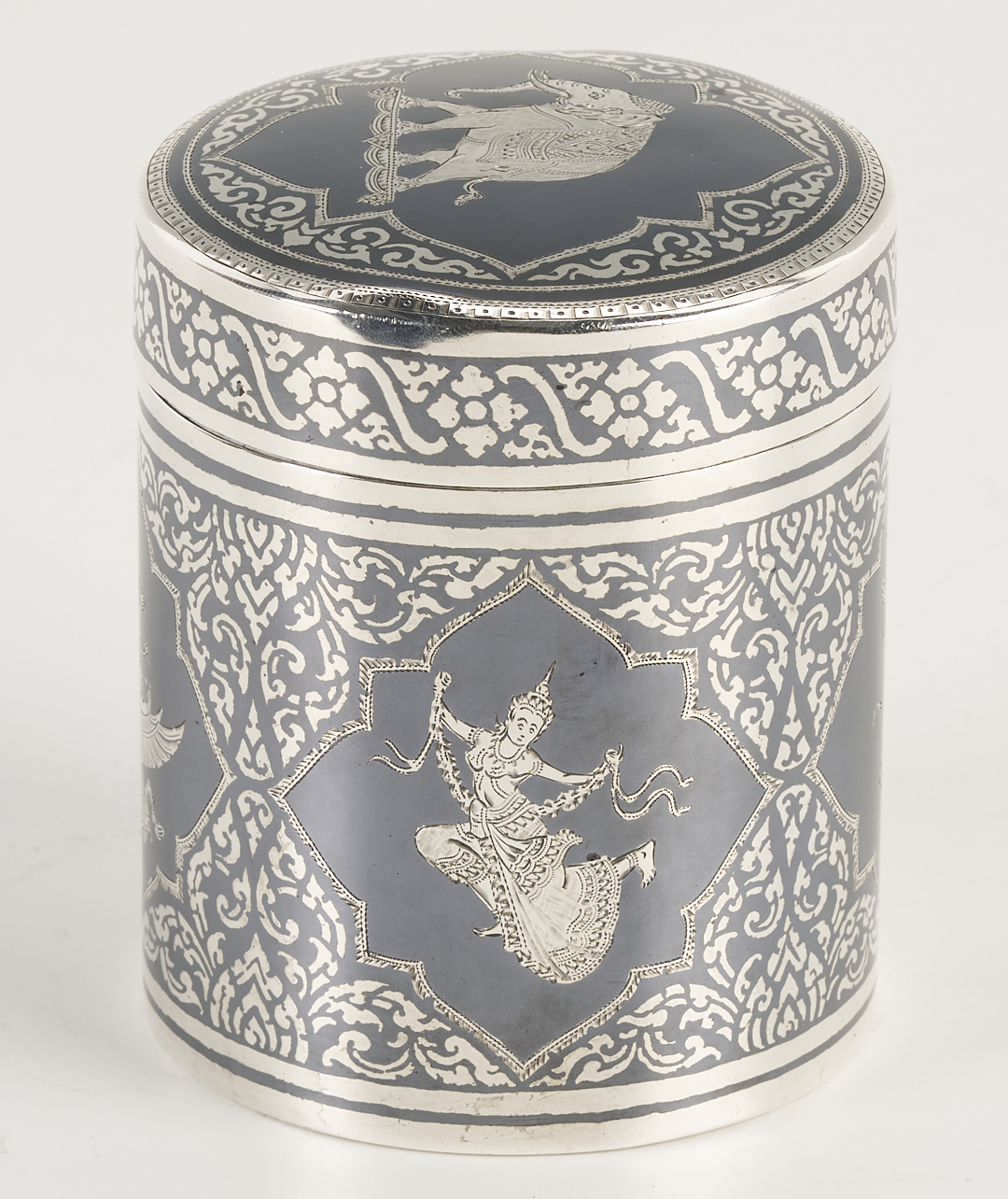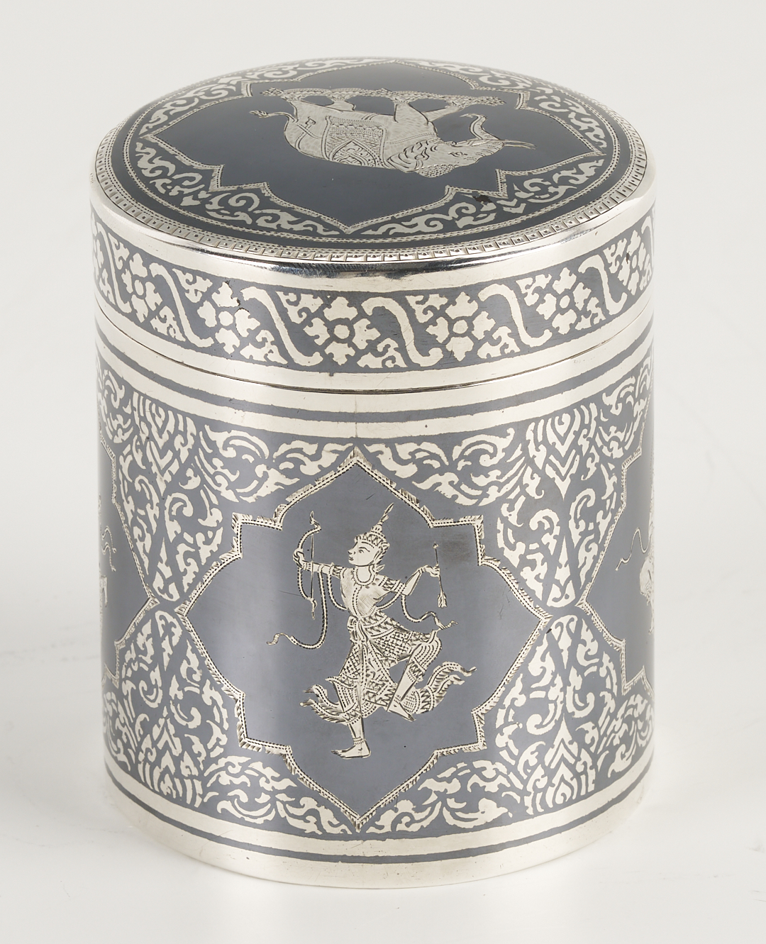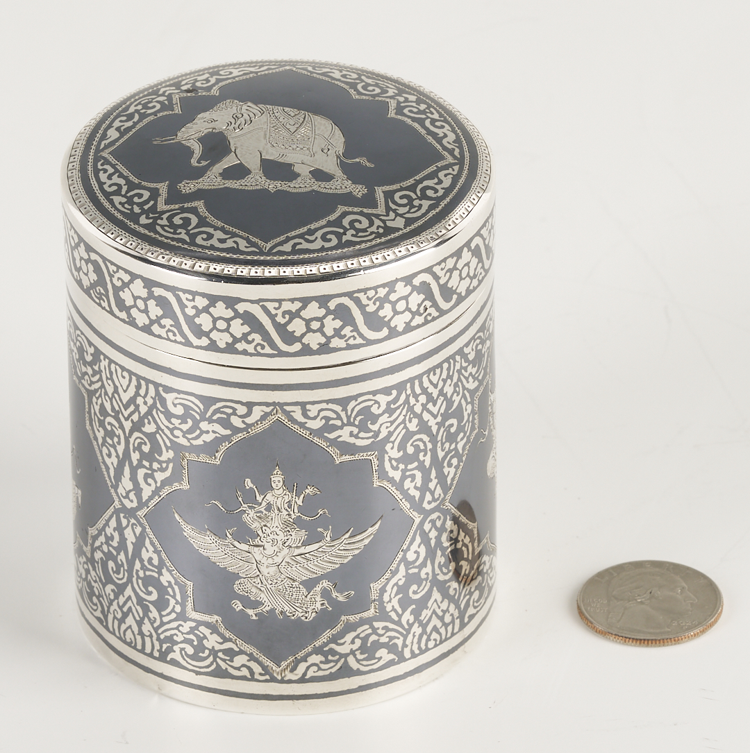 Southeast Asian, Thai sterling silver cylindrical box with niello cartouche decoration depicting an elephant on the lid, and dancing figures on the body. Base marked “Silver Bangkok”. XRF tests as sterling. 3 3/4 in. H. 4.74 troy ounces.