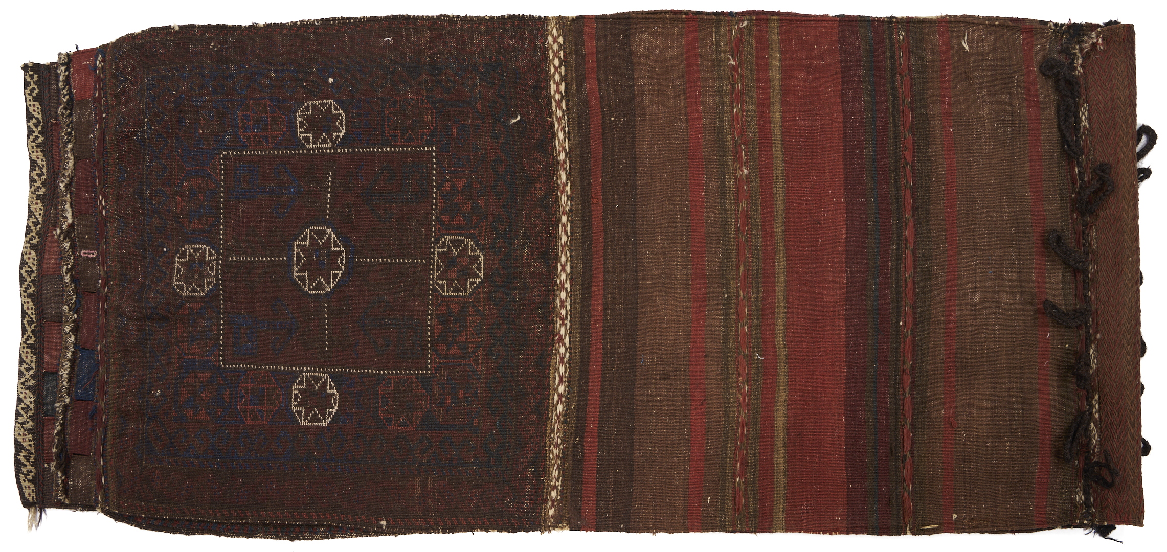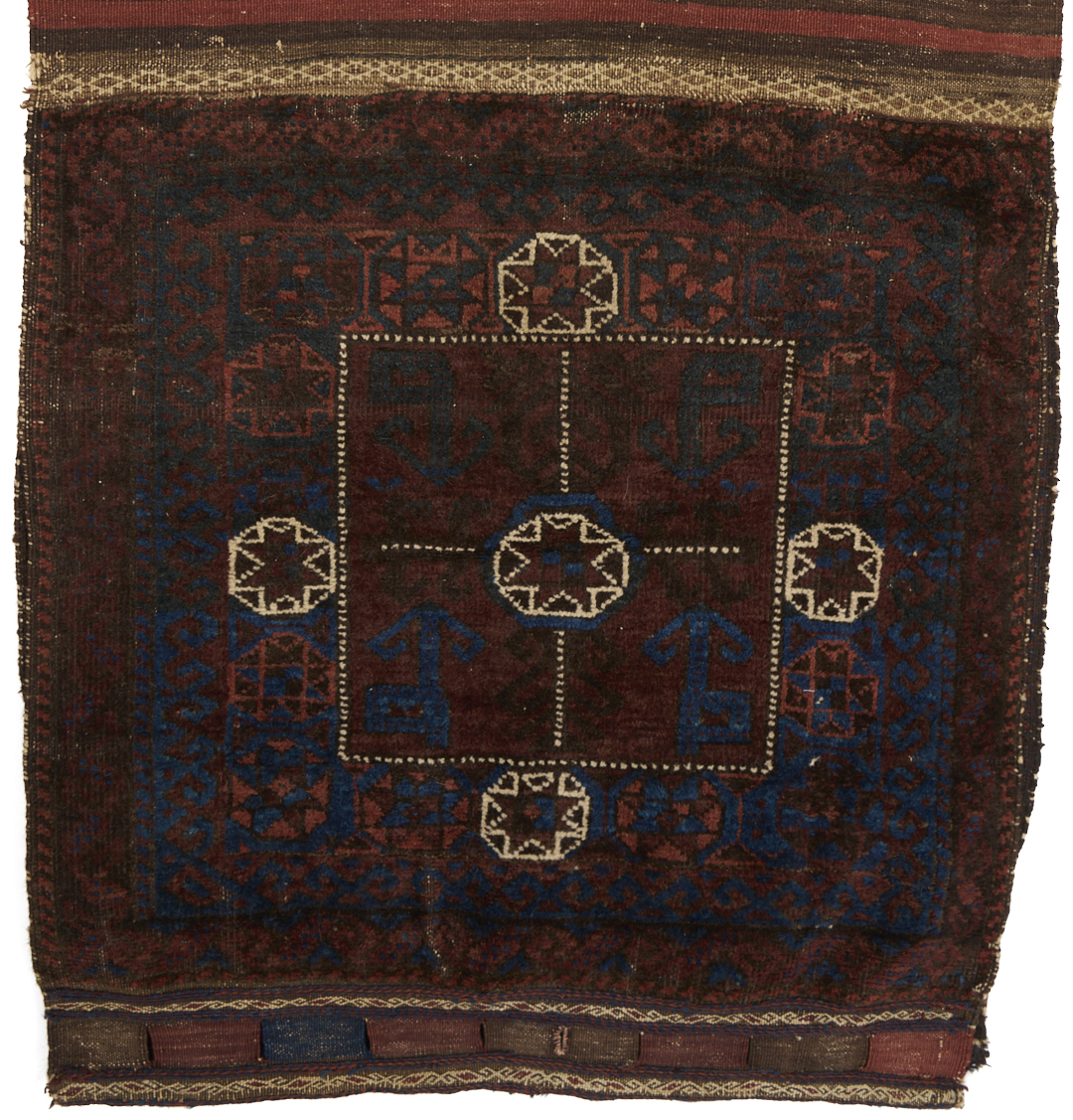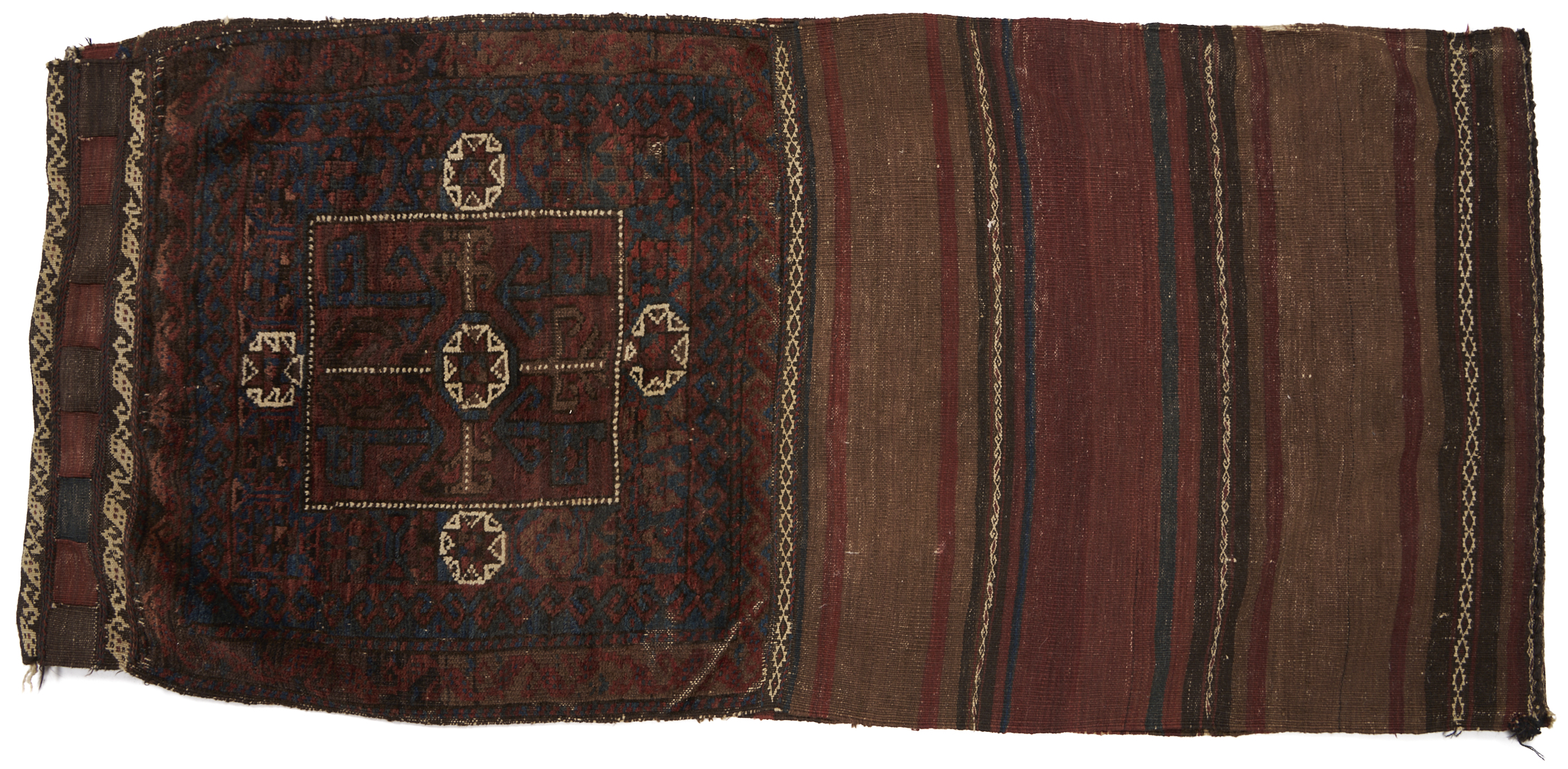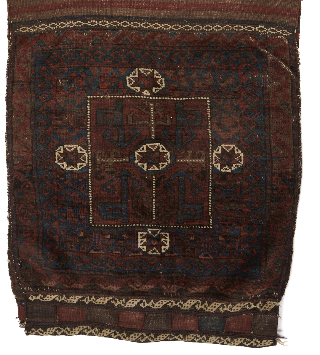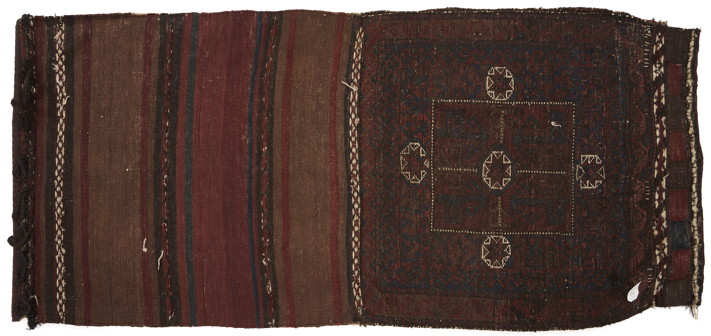 Two (2) Turkmen Tribal Bag weavings, both wool on wool in colors of red, blue, and cream, including: an Arabatchi full bag face with central gul designs, 3 ft. 9 in. x 2 ft. 6 in., circa 1900, and a Baluch bag complete with backing with geometric and striped decoration, 11 ft. 7 in. x 2 ft. 9 in., circa 1880s.