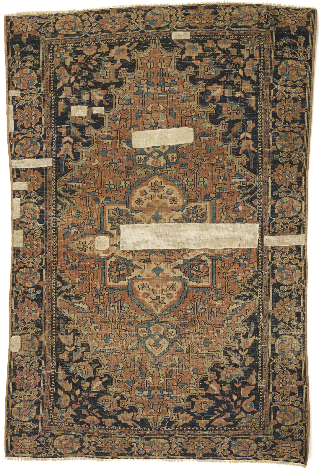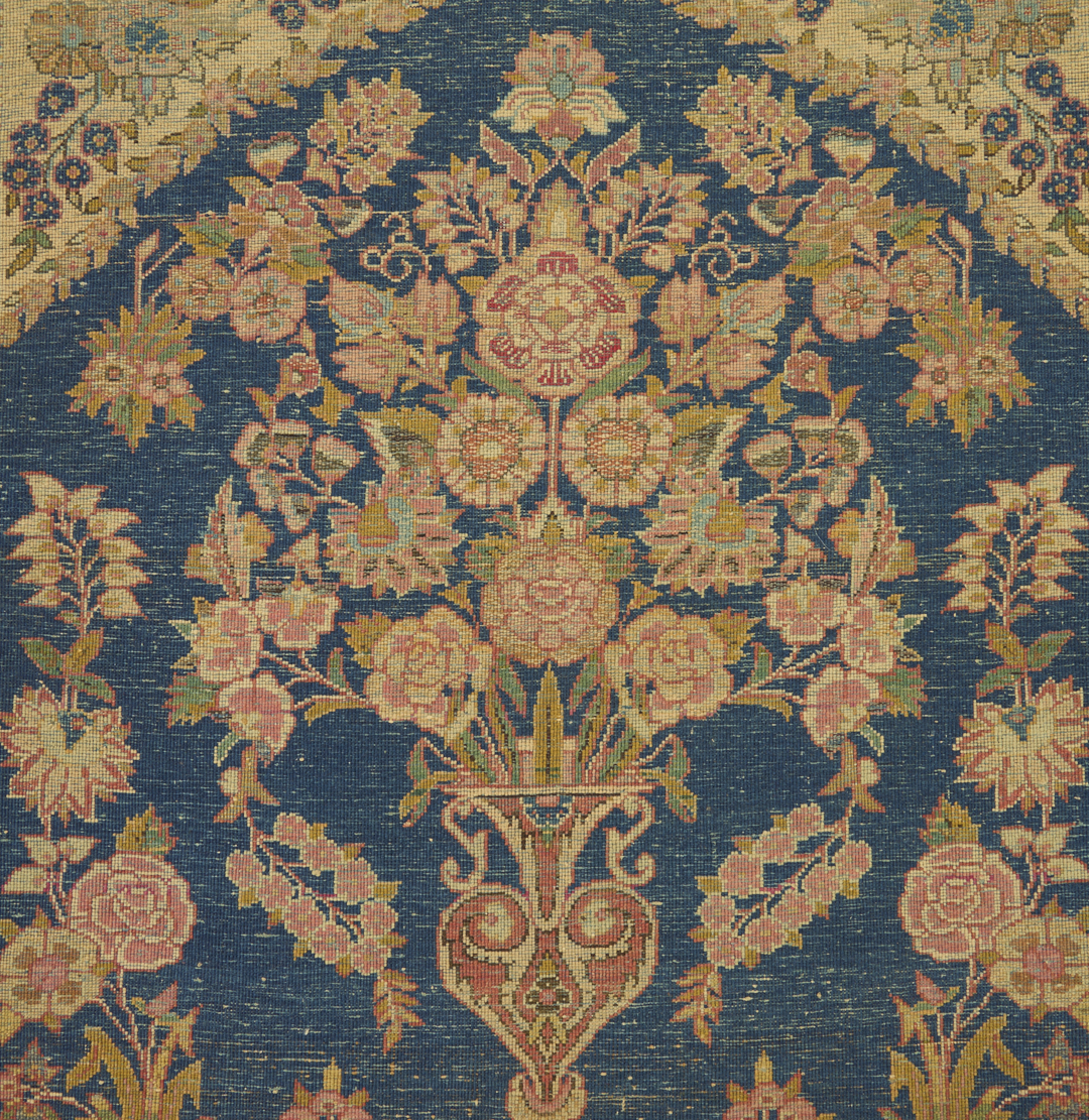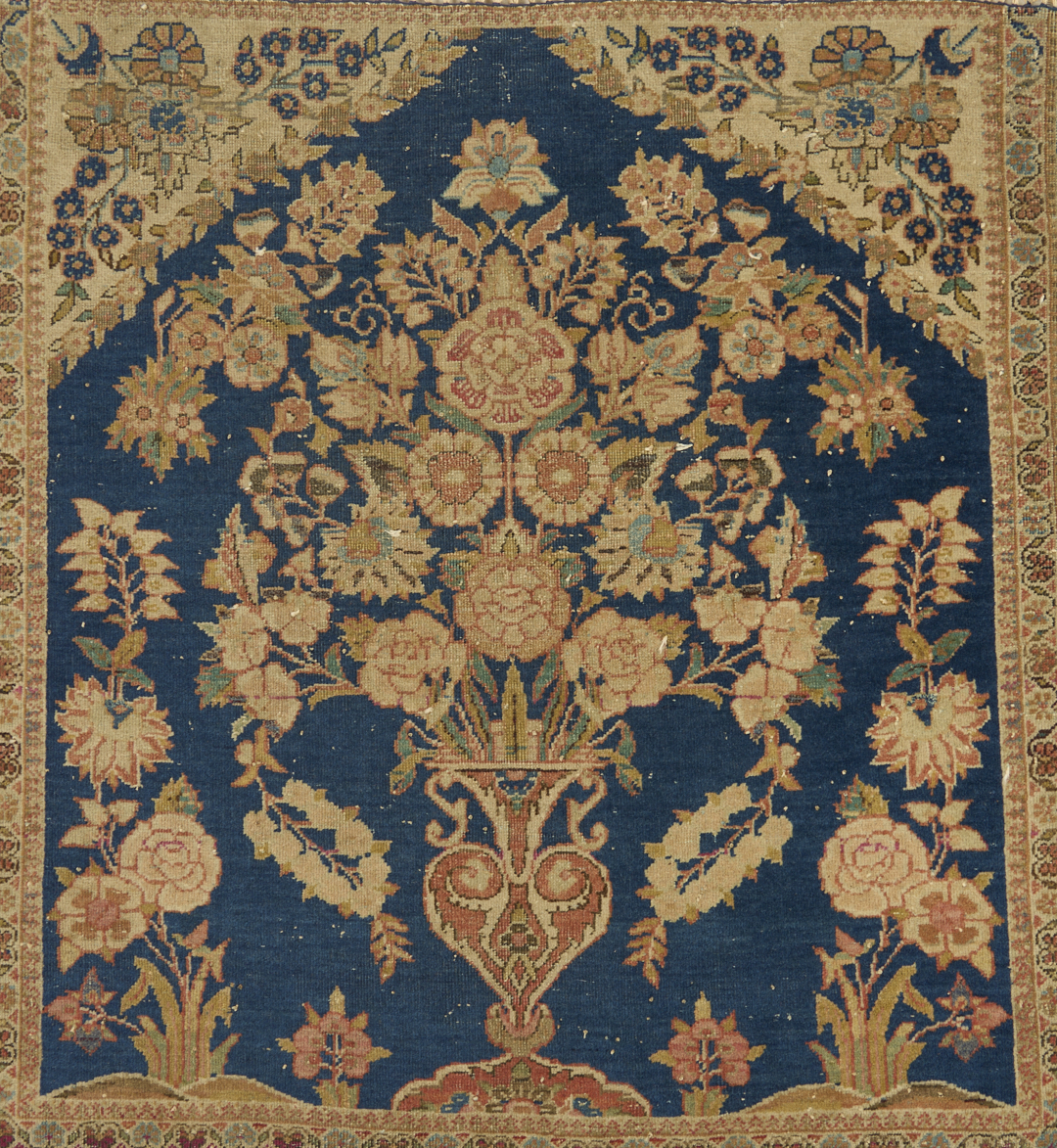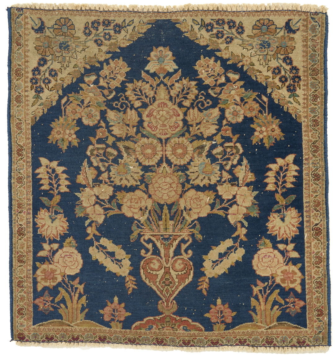1st item: Antique Persian Farahan rug, wool on wool, with a central cream ground stylized medallion on a larger salmon field flanked by blue ground spandrels within two primary borders, scrolling foliate designs throughout. Woven in blue, salmon, tan, and cream colors. 59 in. x 39 1/4 in. 2nd item: Antique Persian Kashan vase rug, wool on wool, with a central flowering vase design on a blue field with two primary borders. Woven in blue, salmon, and cream colors. 28 in. x 26 in. Both rugs early 20th century.