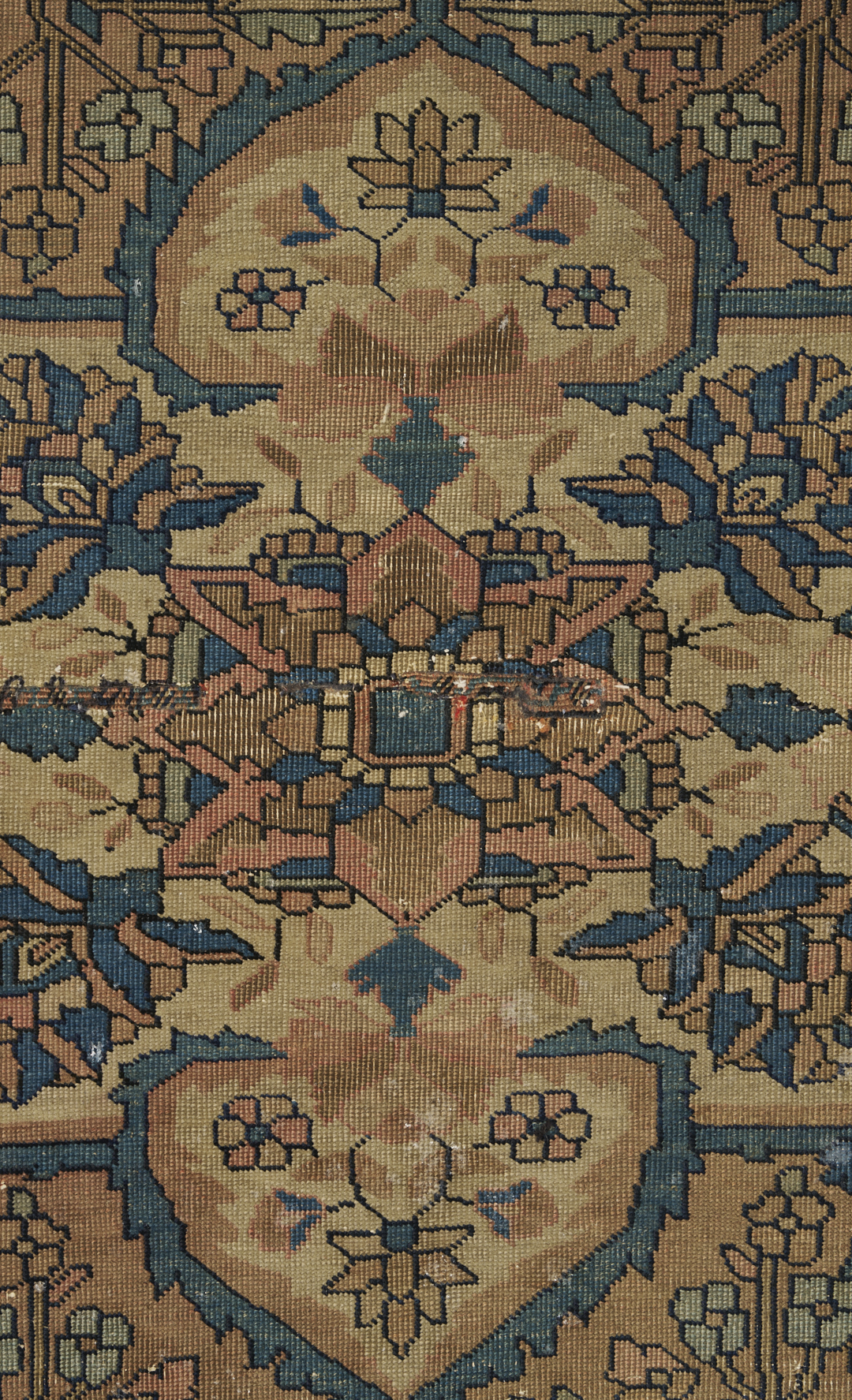 1st rug: Heavy pile wear along with patch and tear repairs. Worn fringes. 2nd item: Heavy pile wear with some visible knot heads. Worn fringes.