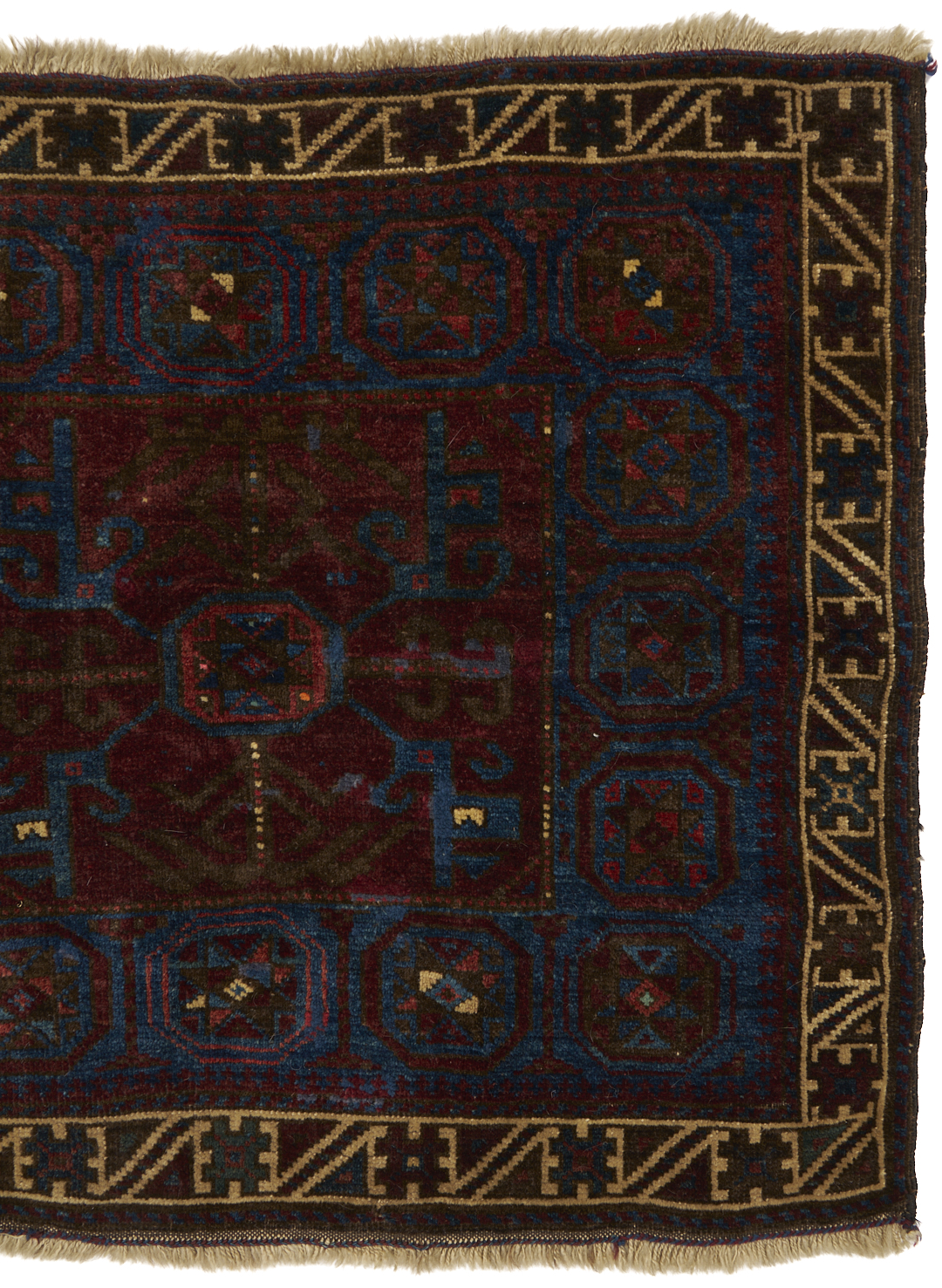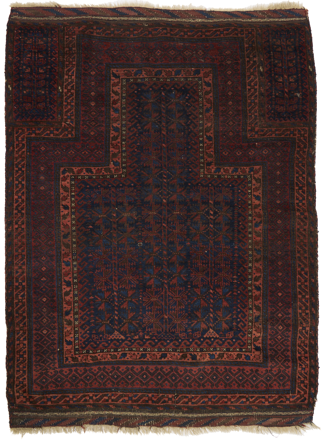 Group of three (3) Antique Afghan Baluch weavings, including a prayer rug and two bag face weavings, all wool on wool construction, woven in traditional tribal designs in colors of red, blue, and cream. 4 ft. 10 in. x 3 ft. 8 in., 2 ft. 7 in. x 2 ft. 1 in., and 2 ft. 11 in. x 2 ft. 7 in. All weavings from the Last Quarter of the 19th century.