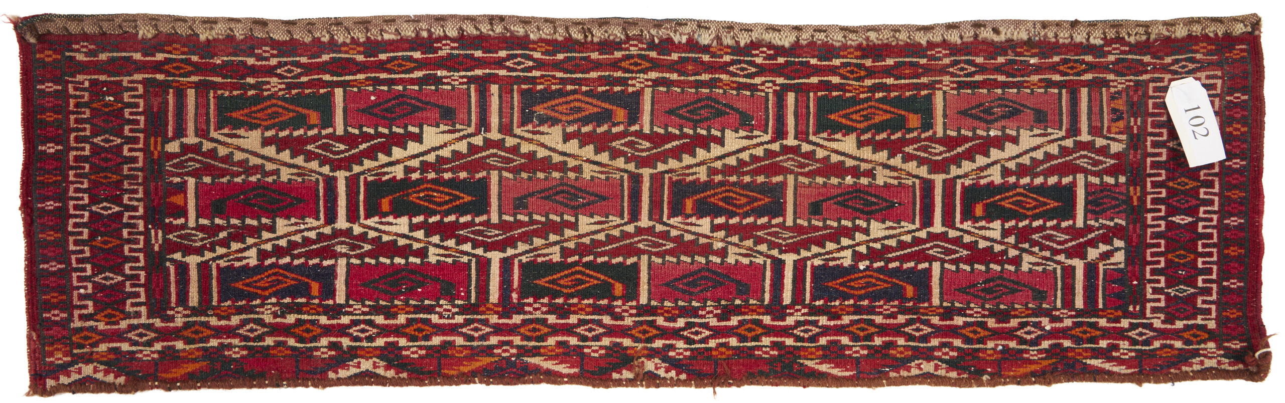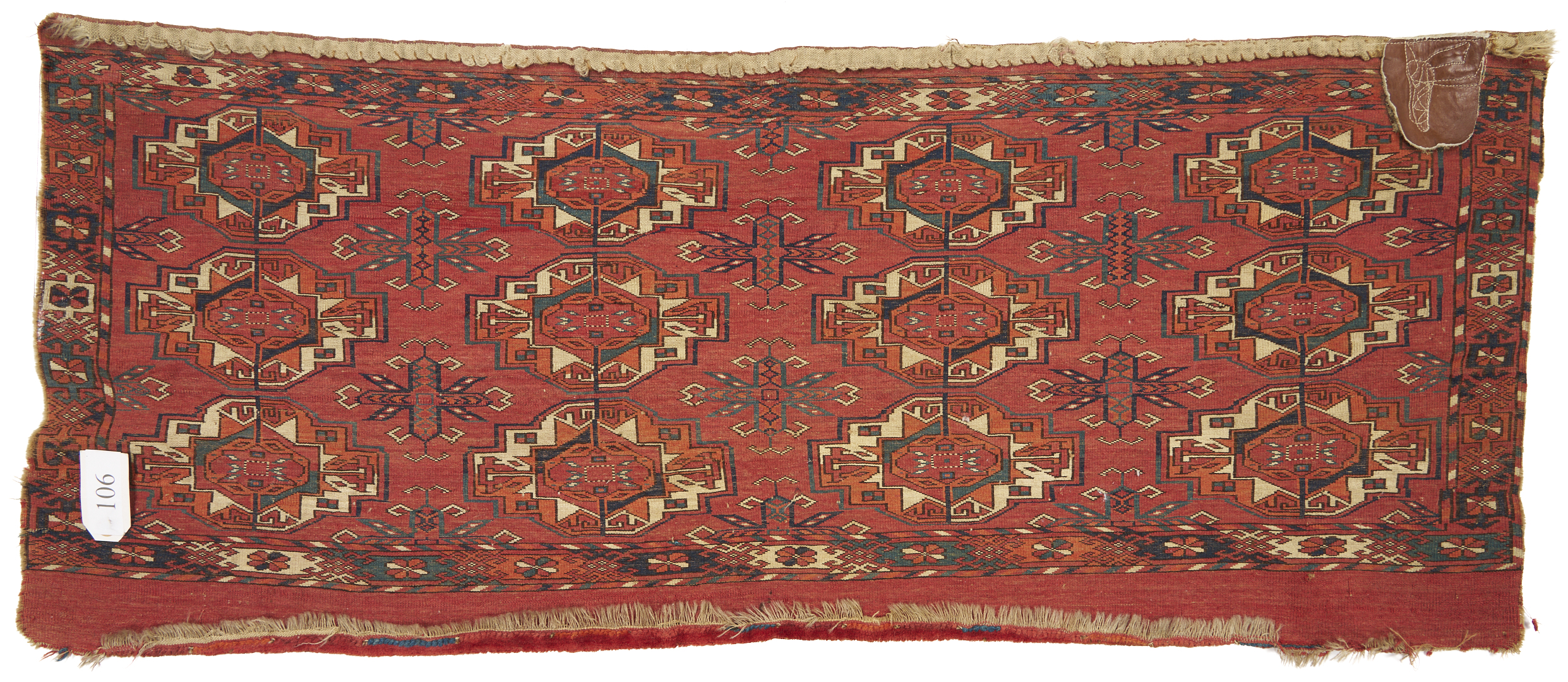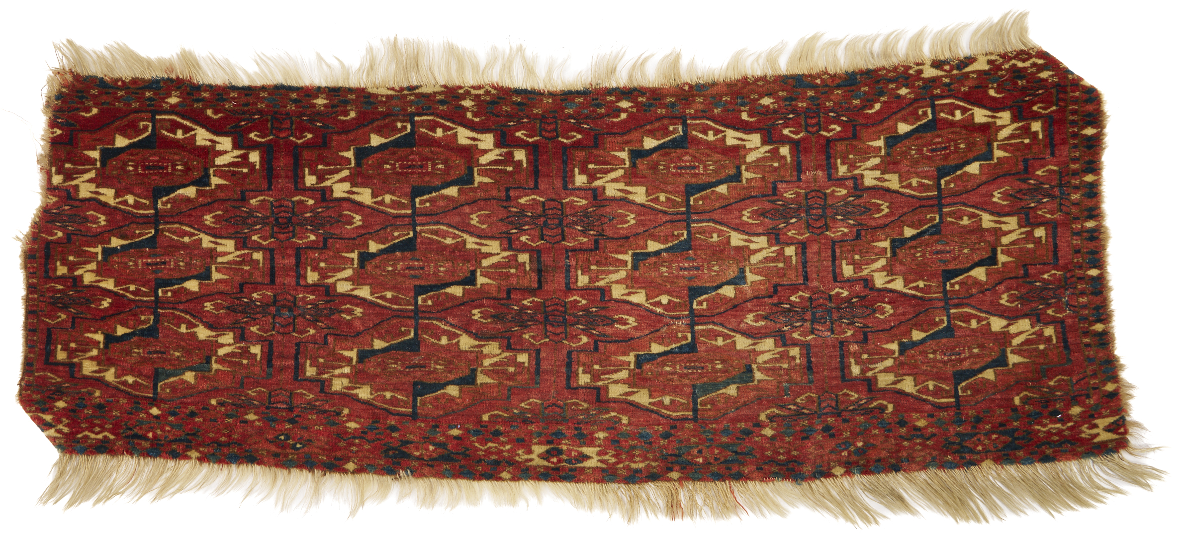 Six (6) antique Turkman weavings, all wool on wool and woven in traditional designs and colors including: Yomud or Yomut Torba Turning Leaf design, 3 ft. 3 in. x 1 ft., circa 1890s; Tekke Torba, 3 ft. 10 in. x 1 ft. 7 in., circa 1880s; Tekke Torba, 3 ft. x 1 ft. 1 in., circa 1850s; a Baluch bag face, 2 ft. x 1 ft. 9 in., circa 1875; a Turkish mat, 2 ft. 7 in. x 1 ft. 6 in., circa 1880s; and a Yomud or Yomut camel knee cover, 1 ft. 7 in. x 10 in., circa 1800.
