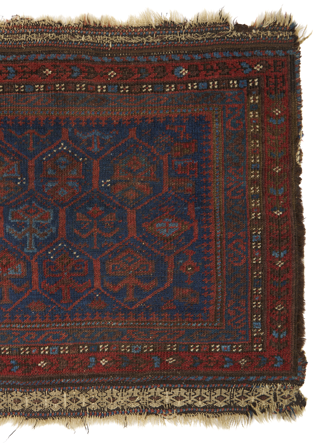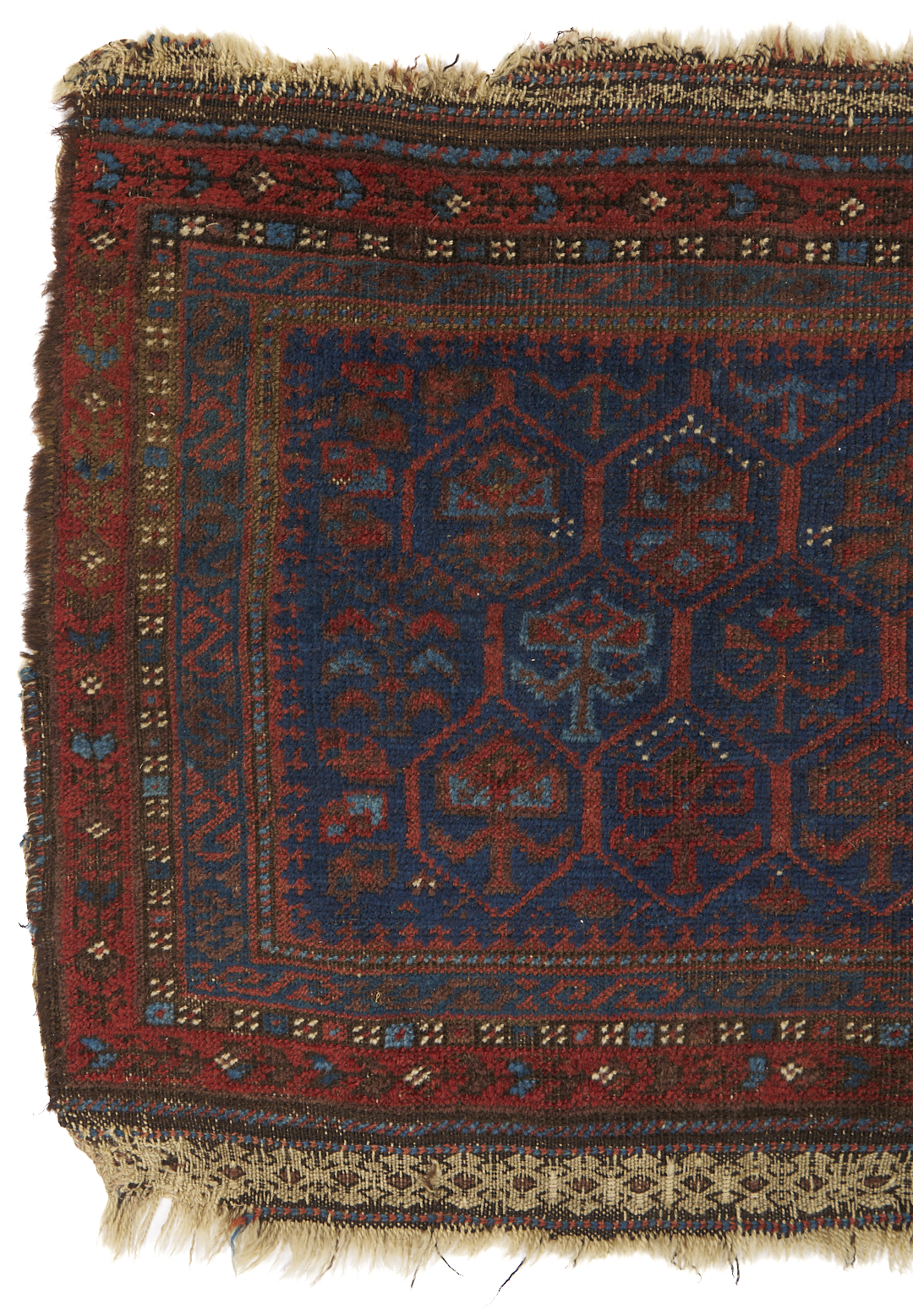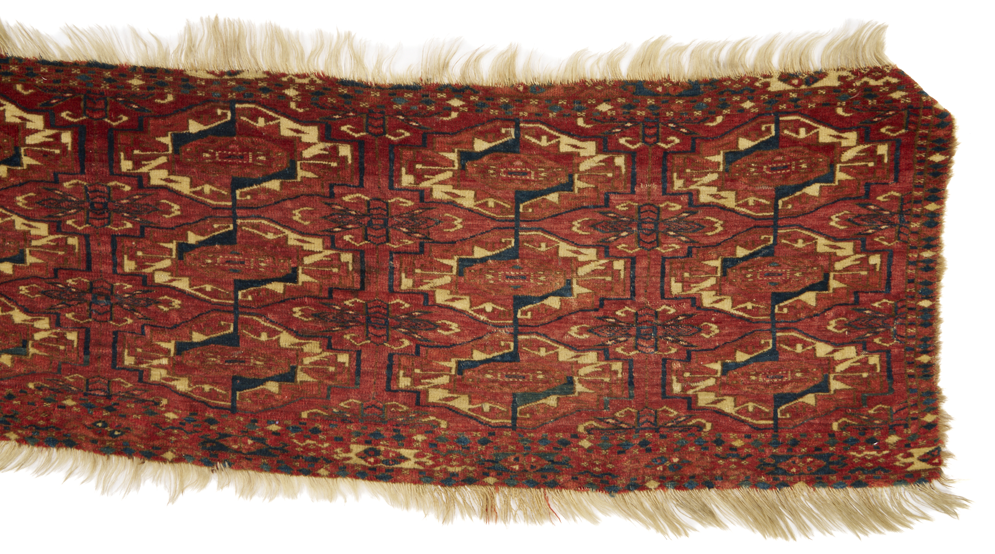 Six (6) antique Turkman weavings, all wool on wool and woven in traditional designs and colors including: Yomud or Yomut Torba Turning Leaf design, 3 ft. 3 in. x 1 ft., circa 1890s; Tekke Torba, 3 ft. 10 in. x 1 ft. 7 in., circa 1880s; Tekke Torba, 3 ft. x 1 ft. 1 in., circa 1850s; a Baluch bag face, 2 ft. x 1 ft. 9 in., circa 1875; a Turkish mat, 2 ft. 7 in. x 1 ft. 6 in., circa 1880s; and a Yomud or Yomut camel knee cover, 1 ft. 7 in. x 10 in., circa 1800.