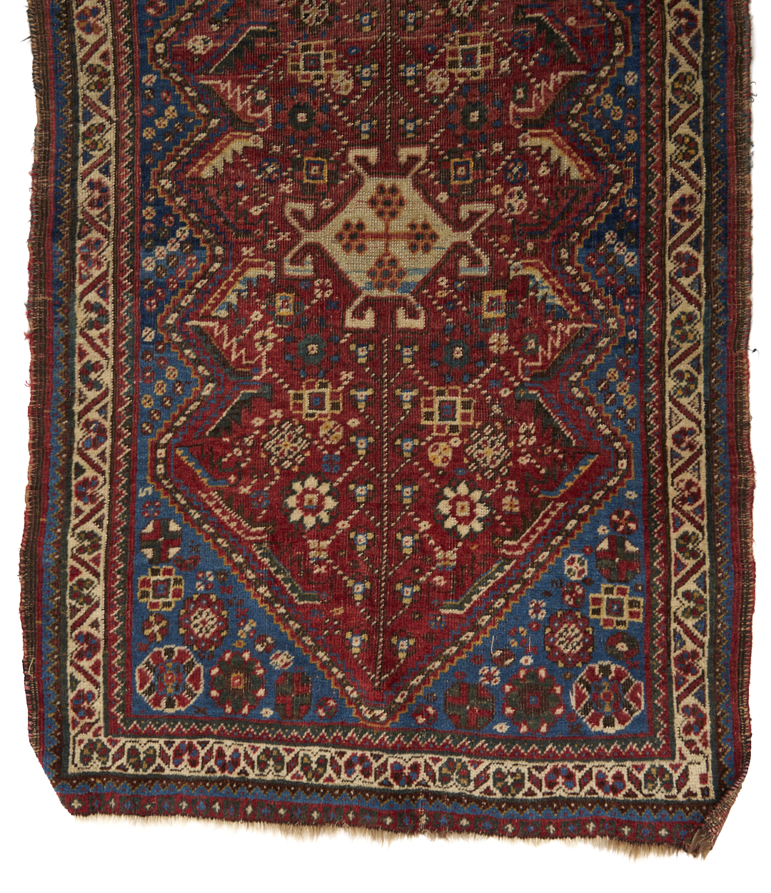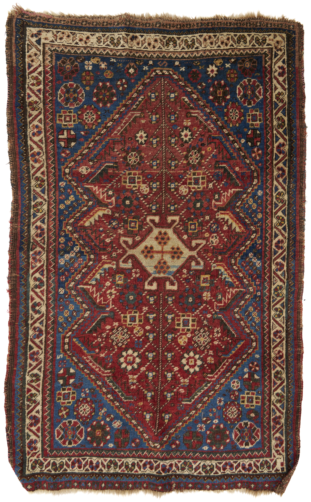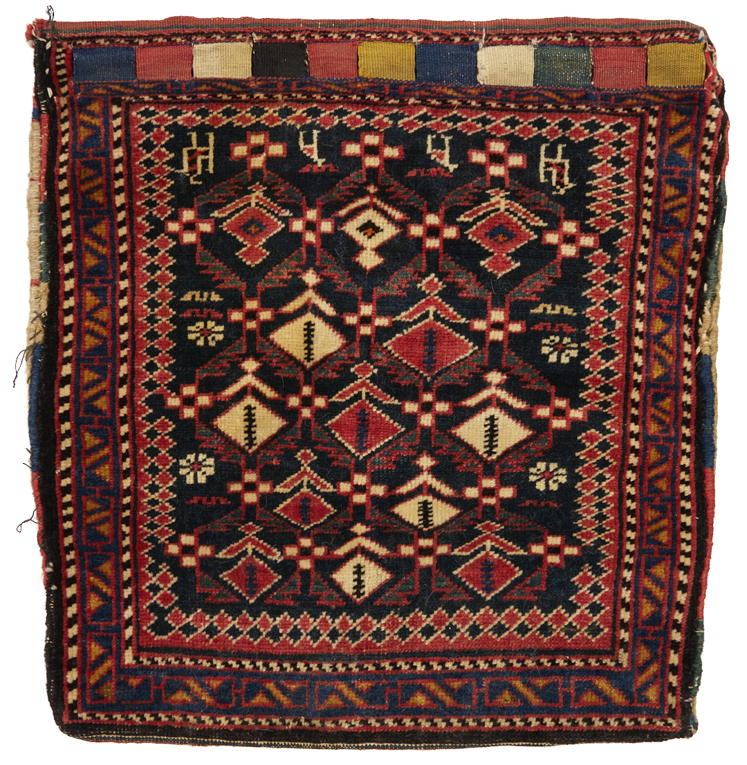 Four (4) assembled antique weavings, all wool on wool, including: a small Persian Quashqai rug with central medallion design in red, blue, and cream colors, 4 ft 2 in x 2 ft 7 in., circa 1880s; a Persian bag face with central figural medallion design in colors of blue, burnt red (or brown), and cream designs, 2 ft 4 in x 1 ft 10 in., circa 1930s; a Kurdish bag face with diamond designs in colors of red, blue, and cream, 1 ft 10 in x 1 ft 7 in., circa 1880s; and a Persian bag face with tribal designs woven in colors of red, blue, gold, and cream, 1 ft 9 in x 1 ft 8 in., circa 1890s.