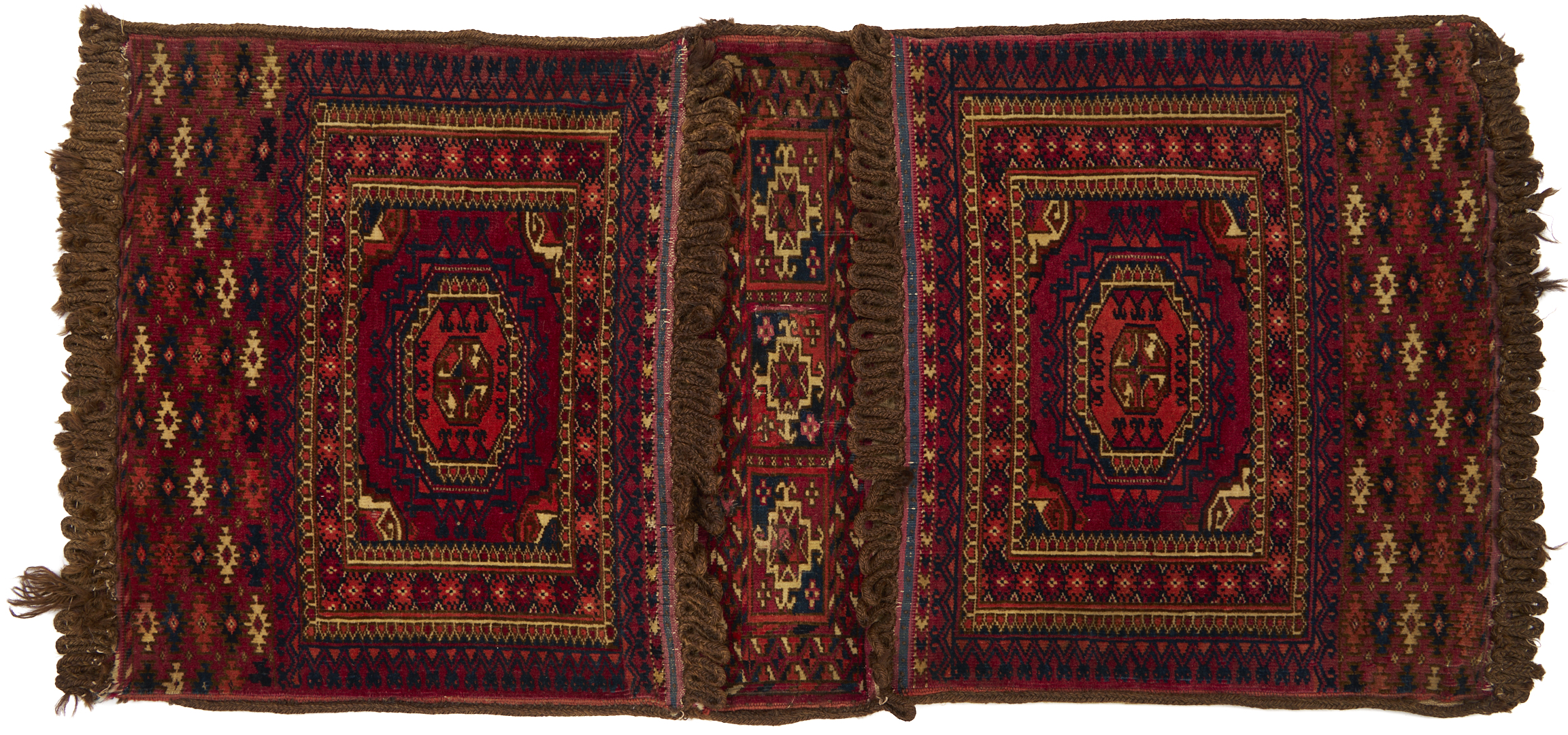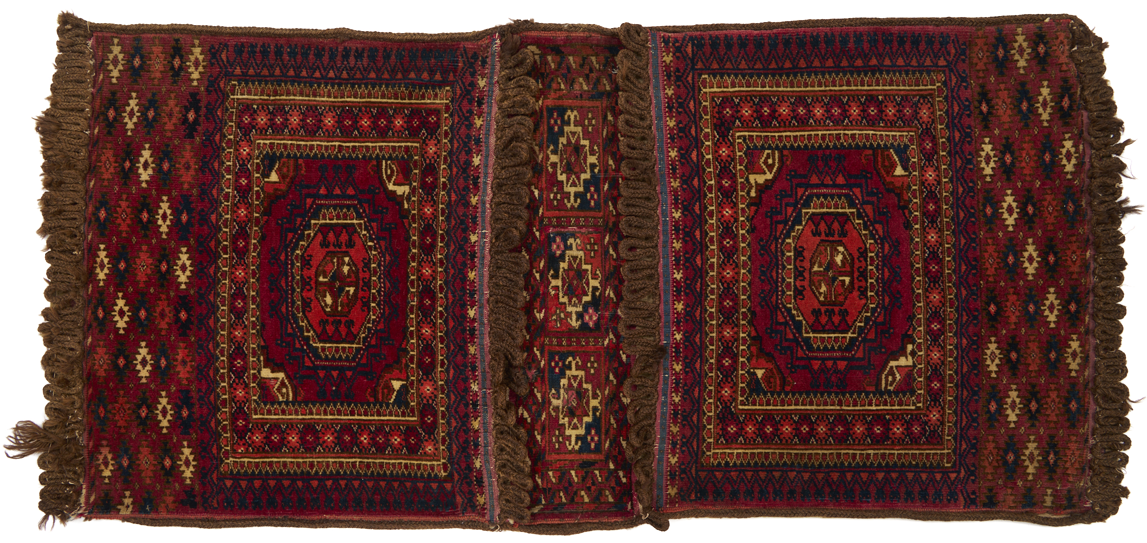 1st item: Antique Khorjin Turkmen Youmud saddle bag, wool on wool, woven in all-over geometric designs in colors of red, blue, and cream. 3 ft. x 1 ft. 10 in. Circa 1890s. 2nd item: Antique Tekke Turkman full bag with gul and diamond designs, woven in red, blue, and cream colors with fringe to the center and sides. 3 ft. 3 in. x 1 ft. 8 in. Circa 1900. 3rd item: Antique Baluch Afghan tribal bag face with traditional designs woven in red, blue, cream, and gold colors. 2 ft. 4 in. x 2 ft. 5 in. Circa 1870s.
