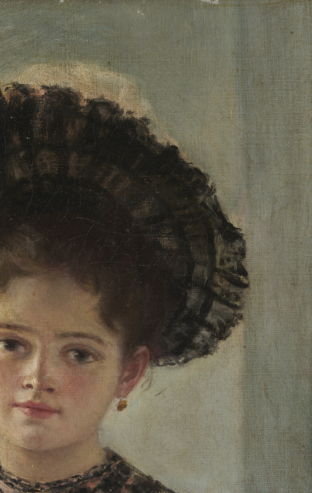 Continental School, possibly French, oil on canvas portrait painting depicting a young girl wearing a pink and black lace hat and a pink dress with a black lace collar, and a gray/blue interior background. Unsigned. Housed in a molded gilt and gesso wood frame. Sight: 12 1/4 in. H x 8 7/8 in. W. Framed: 17 1/2 in. H x 14 3/8 in. W. 19th century.