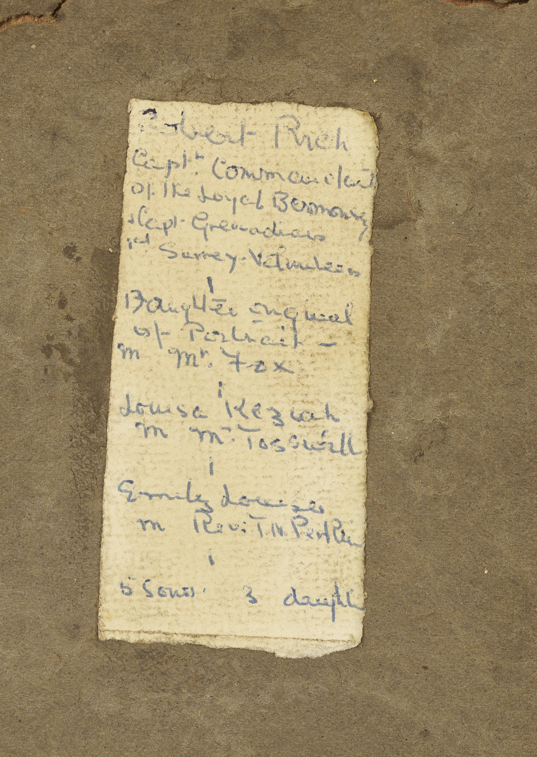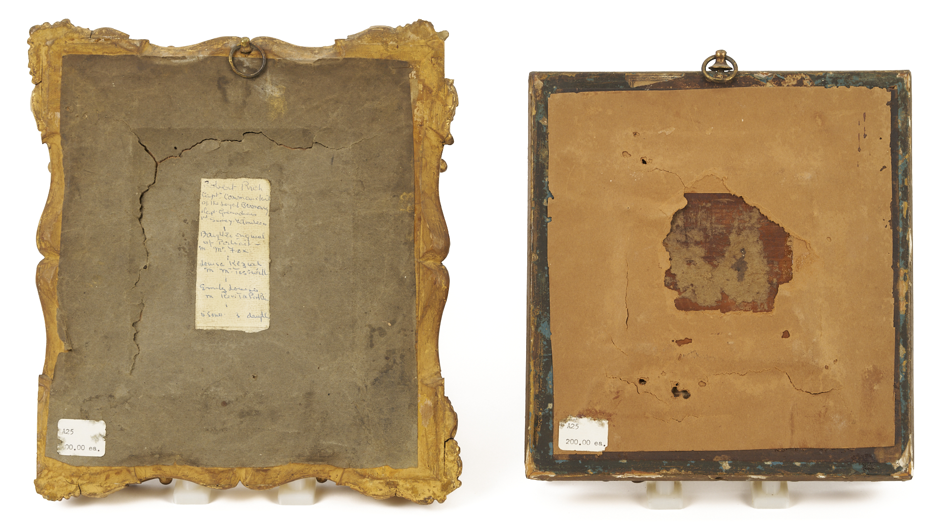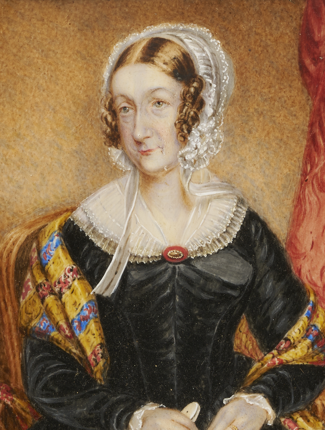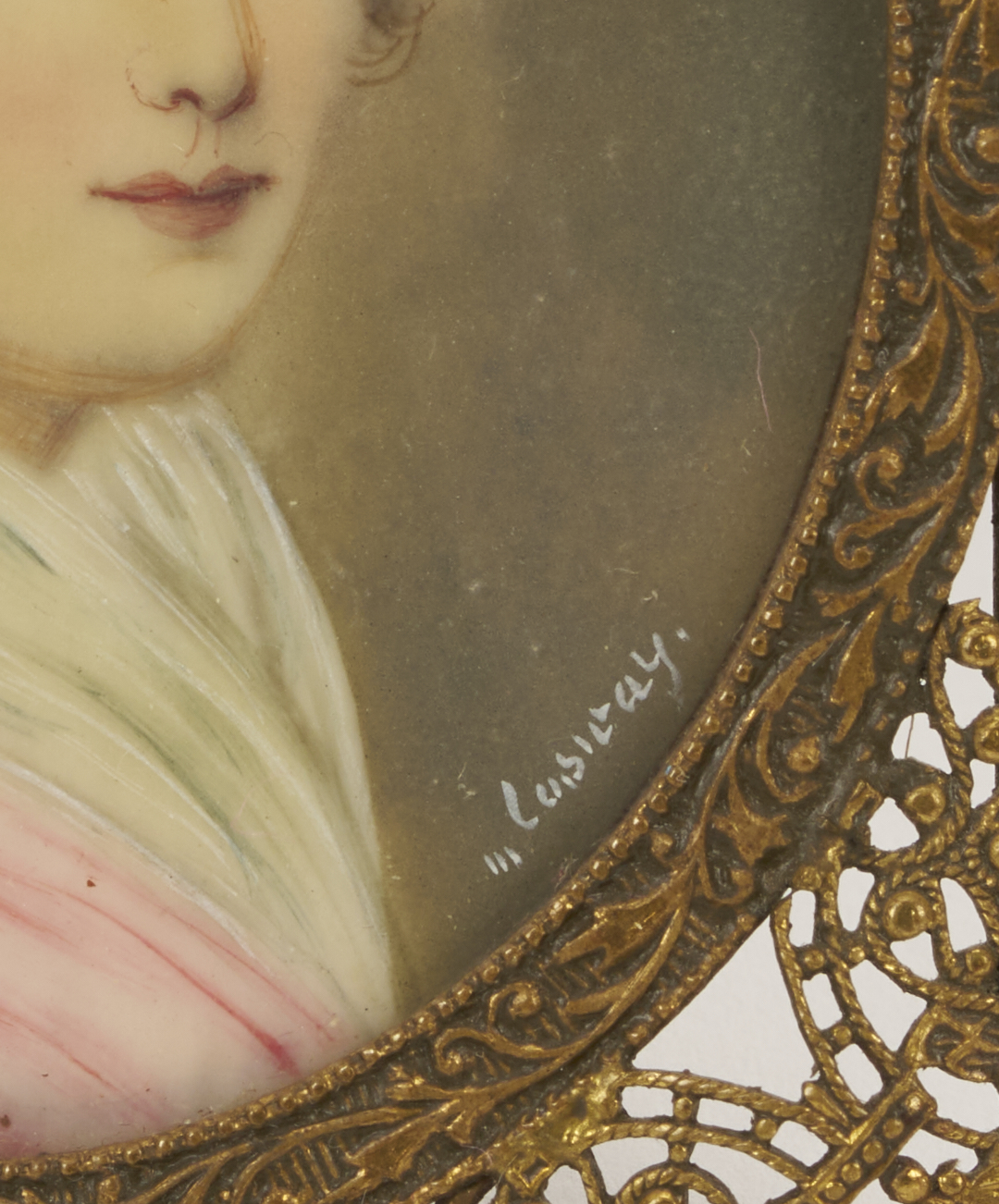 8 miniature portrait items including 1 German hand-painted porcelain portrait plaque set into the lid of a bronze metal circular trinket box, 1 miniature portrait of a gentleman in burgundy coat with dark hair, identified en verso as “Grandfather George Sutton about 27”; 1 small Continental miniature portrait of a man in tricorn hat; 1 oval miniature portrait of a gentleman in blue coat with powdered wig; 1 oval portrait miniature of a woman in pink dress with pink ribboned bonnet (with signature after Richard Cosway), under glass in a gold metal filigree frame with tag stating “estate of Countess Szecheny”; 1 circular portrait of a woman with intricate lace collar, set into the lid of a circular bone trinket box; 1 rectangular miniature portrait of a young woman in white dress with blue shawl, under glass in Rococo style giltwood frame; and 1 rectangular portrait miniature of an older woman with black dress and plaid shawl, under glass in Rococo style giltwood frame, with inscription verso suggesting the subject was the daughter of Capt. Robert Rich, Commander of the Loyal Bermondsey Volunteers and Captain of the 1st Surrey Volunteers, who married a Mr. Fox. Items range in age from circa 1830 to circa 1890. Sizes range from 1 1/2 in. Diameter to 10 in. x 9 in.