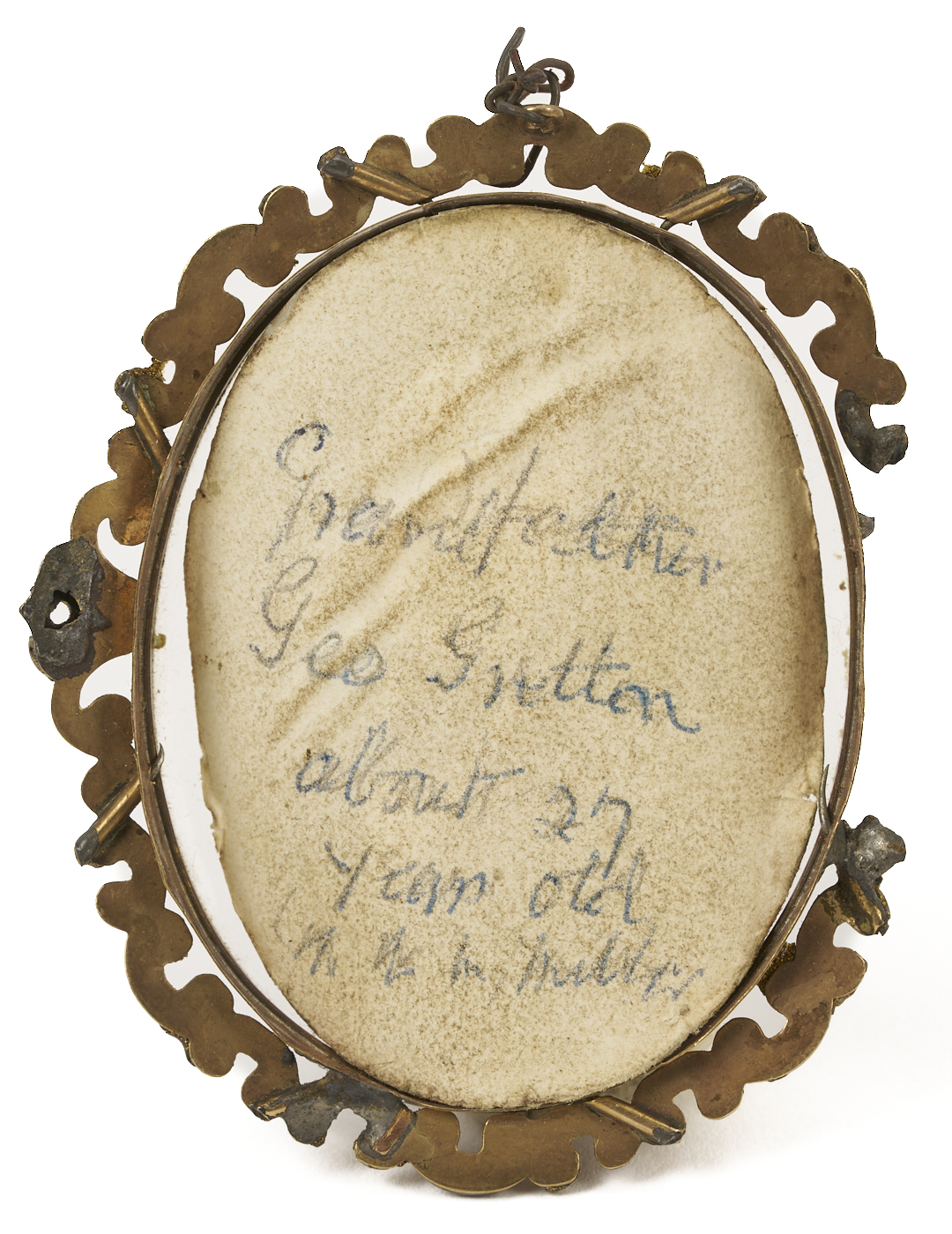 CONDITION: The portrait on the circular bone box has a full split down the middle, affecting image, and wear to background. Portrait of George Sutton is cupped with small loss to left lower edge; losses to frame. Oval portrait of man in blue coat has exposed pins holding the portrait into the frame; use caution when handling. Warping to wafer on the rectangular portrait of the older woman and some small flakes to facial area; losses to gold frame. Flakes to edge on rectangular portrait of younger woman; losses to gold frame.